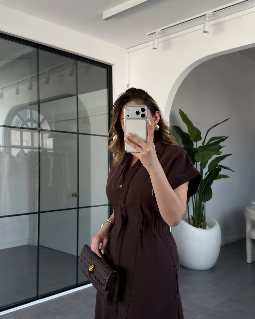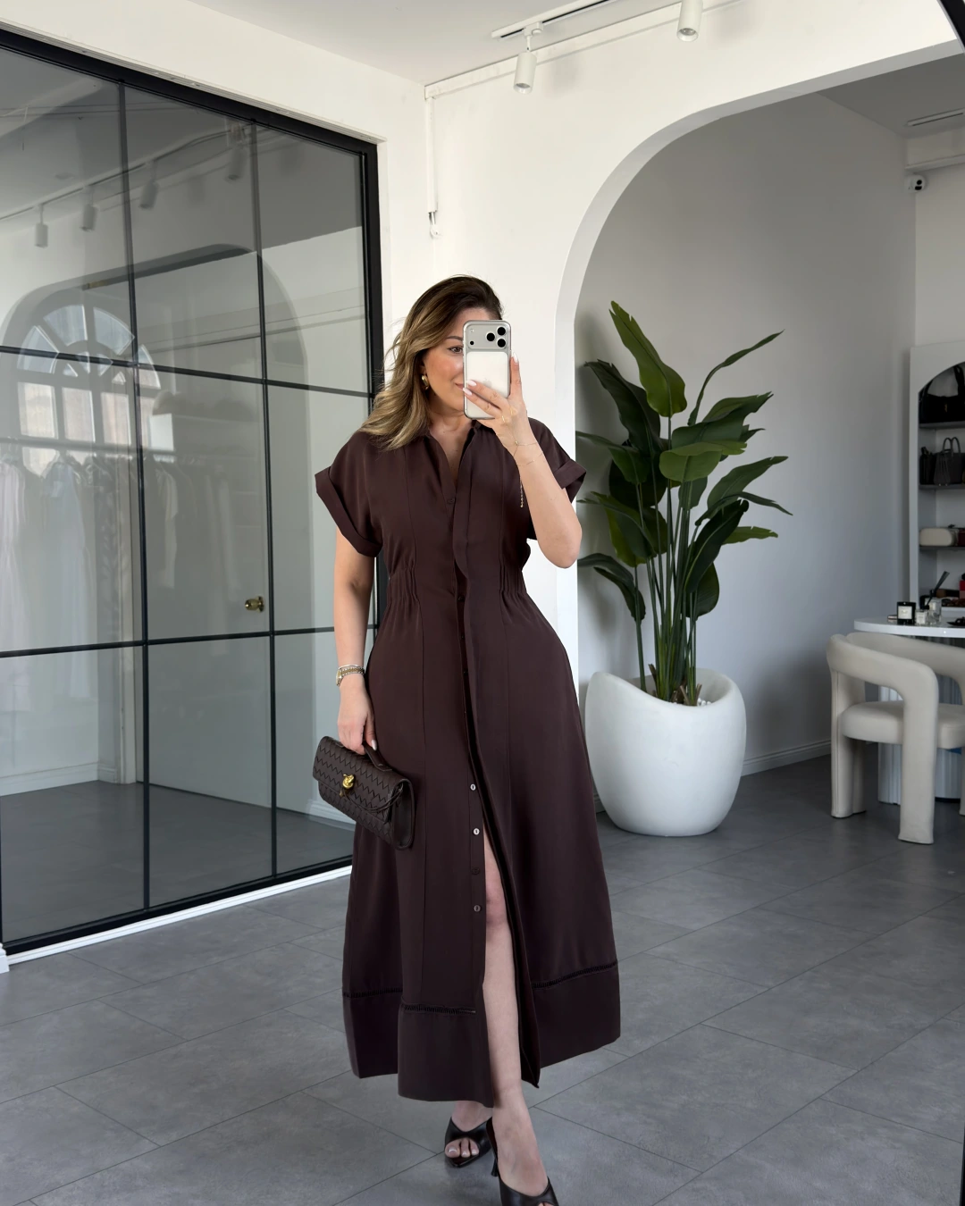 KAHVE KISA KOL BELİ LASTİKLİ MODAL ELBİSE