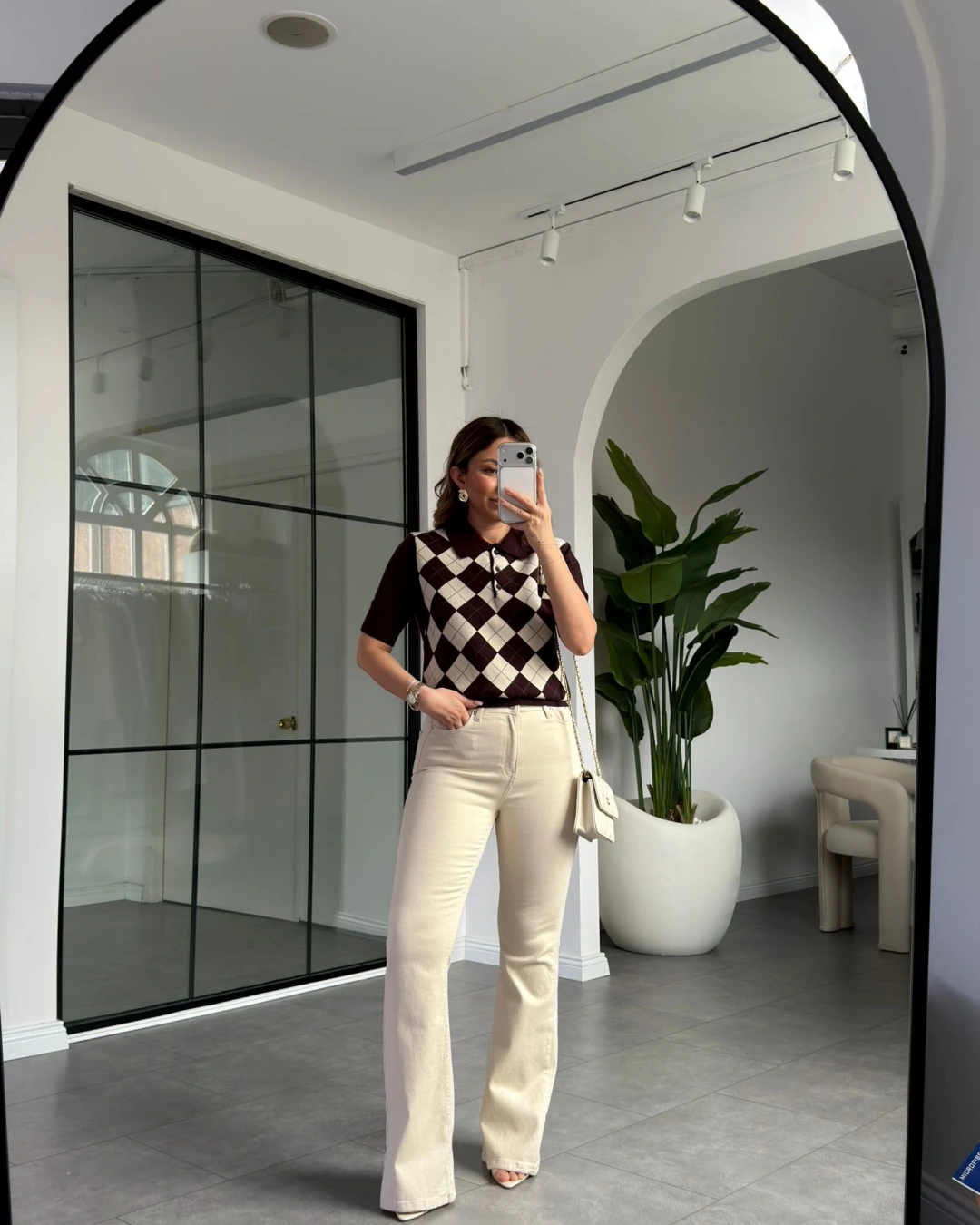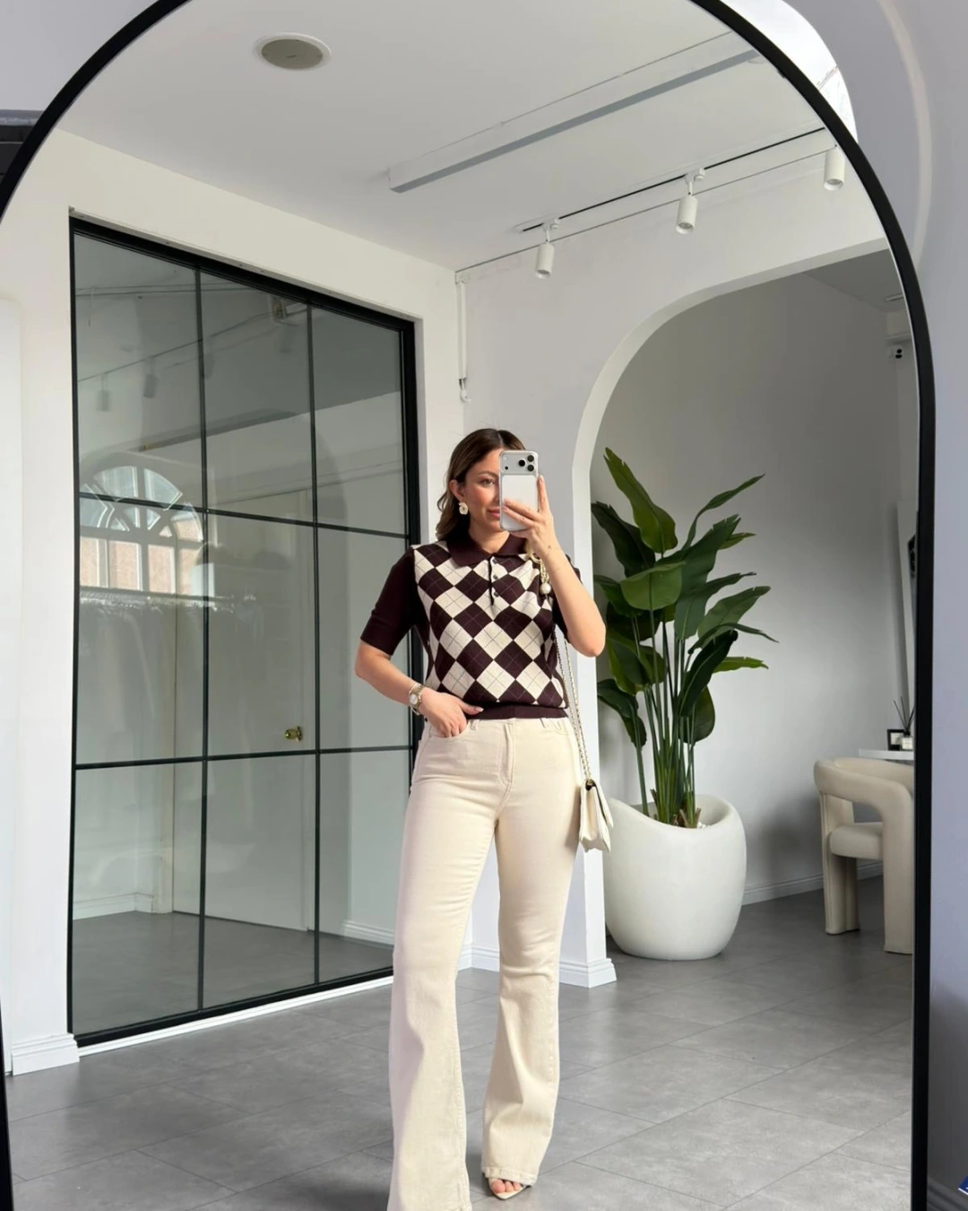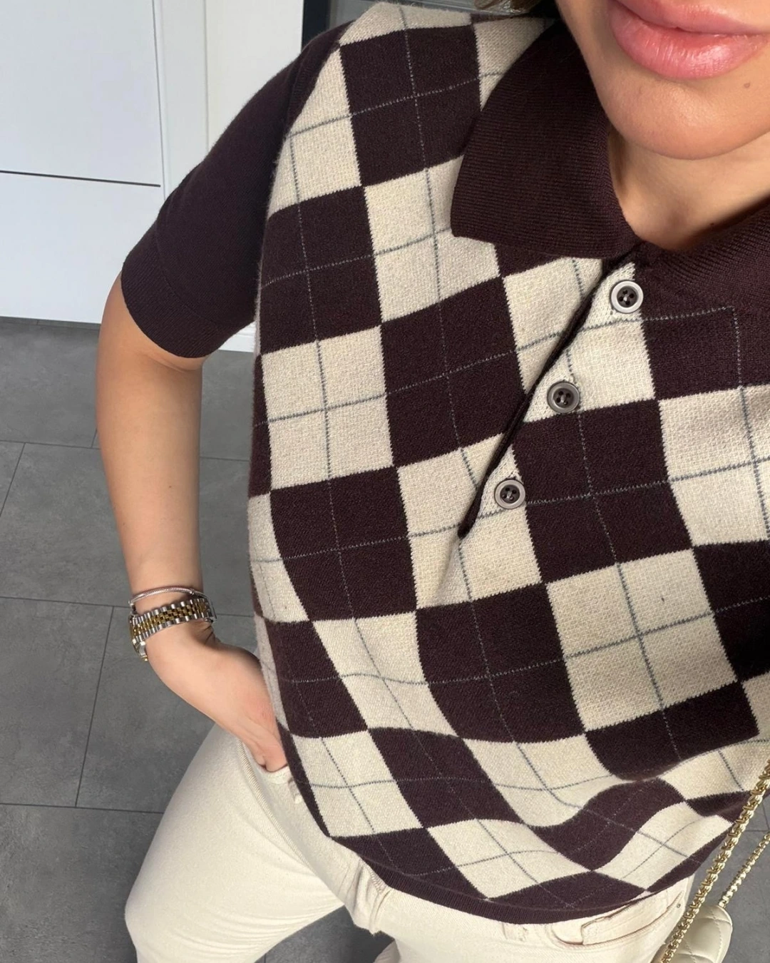 KAHVE KREM BAKLAVA DESEN KISA KOL TRİKO