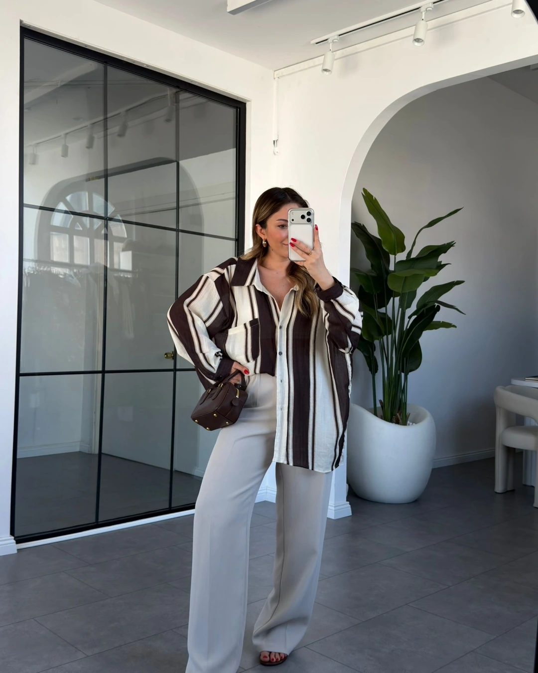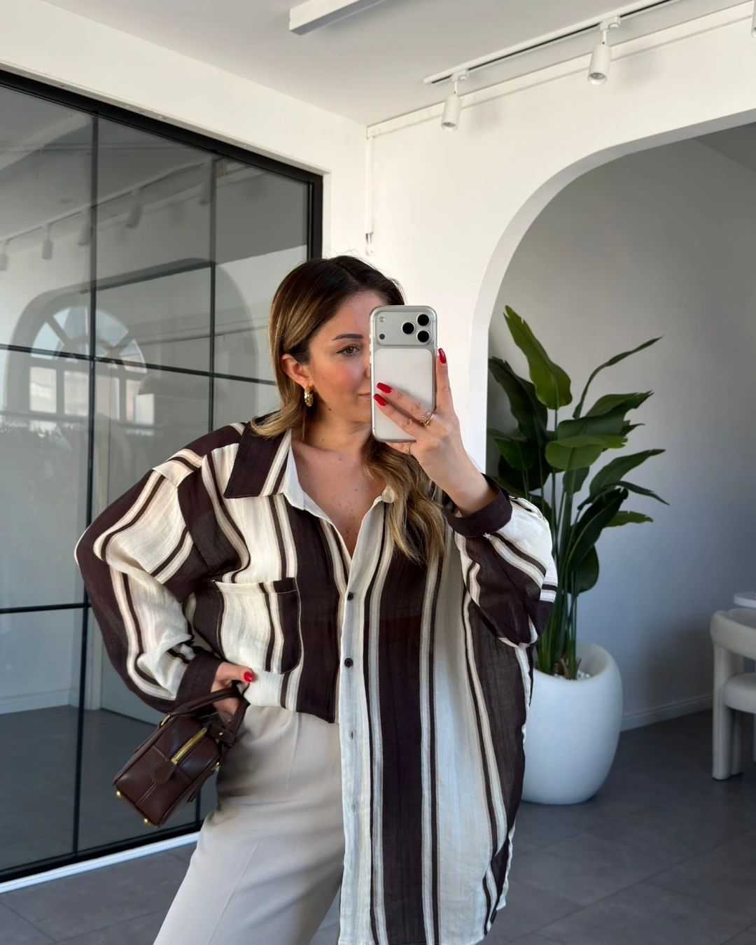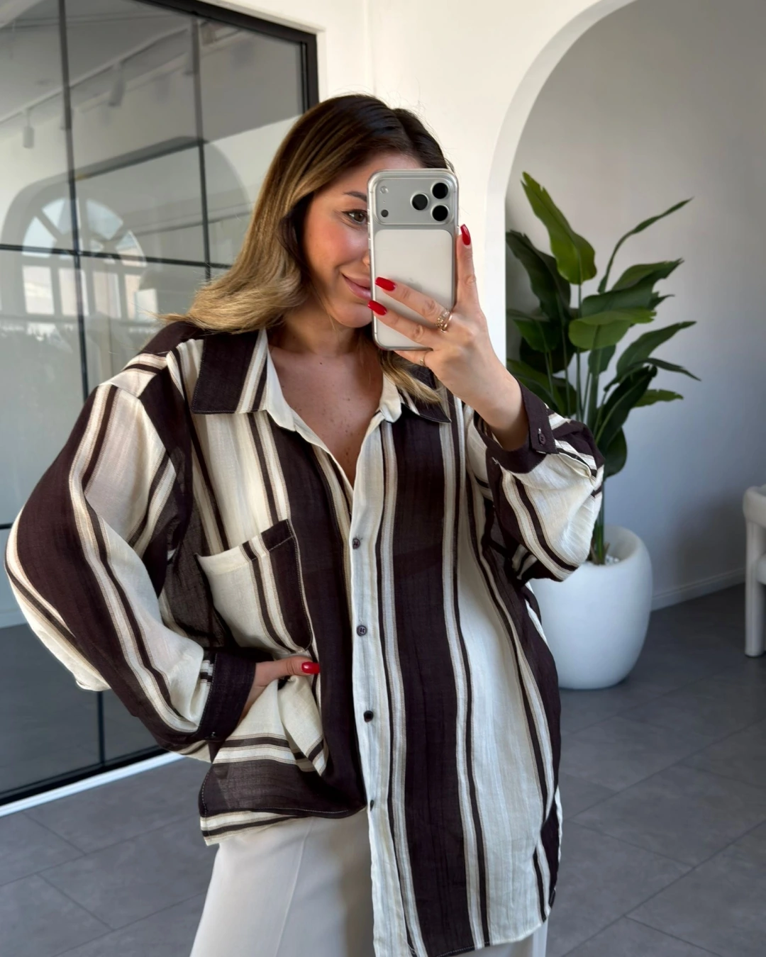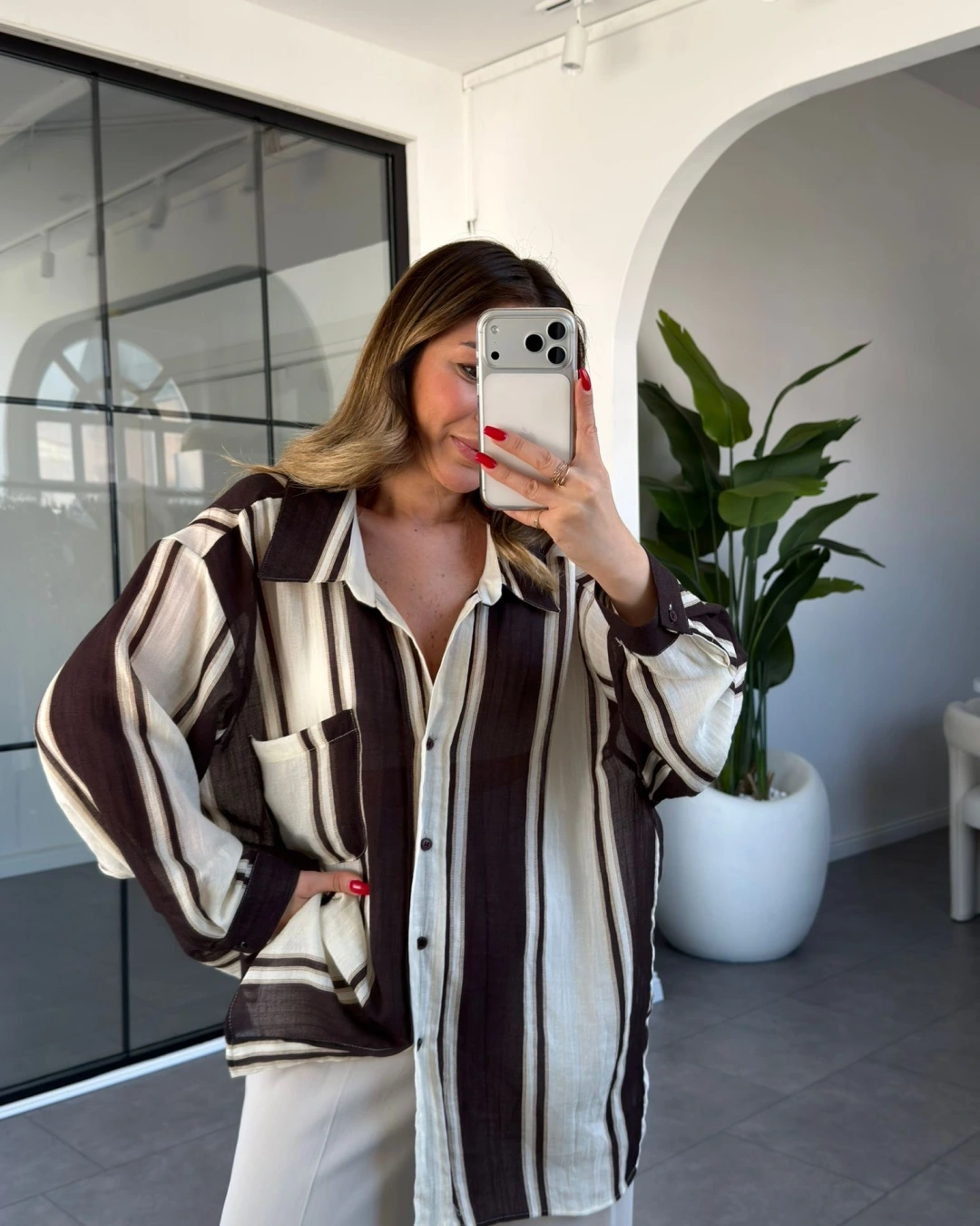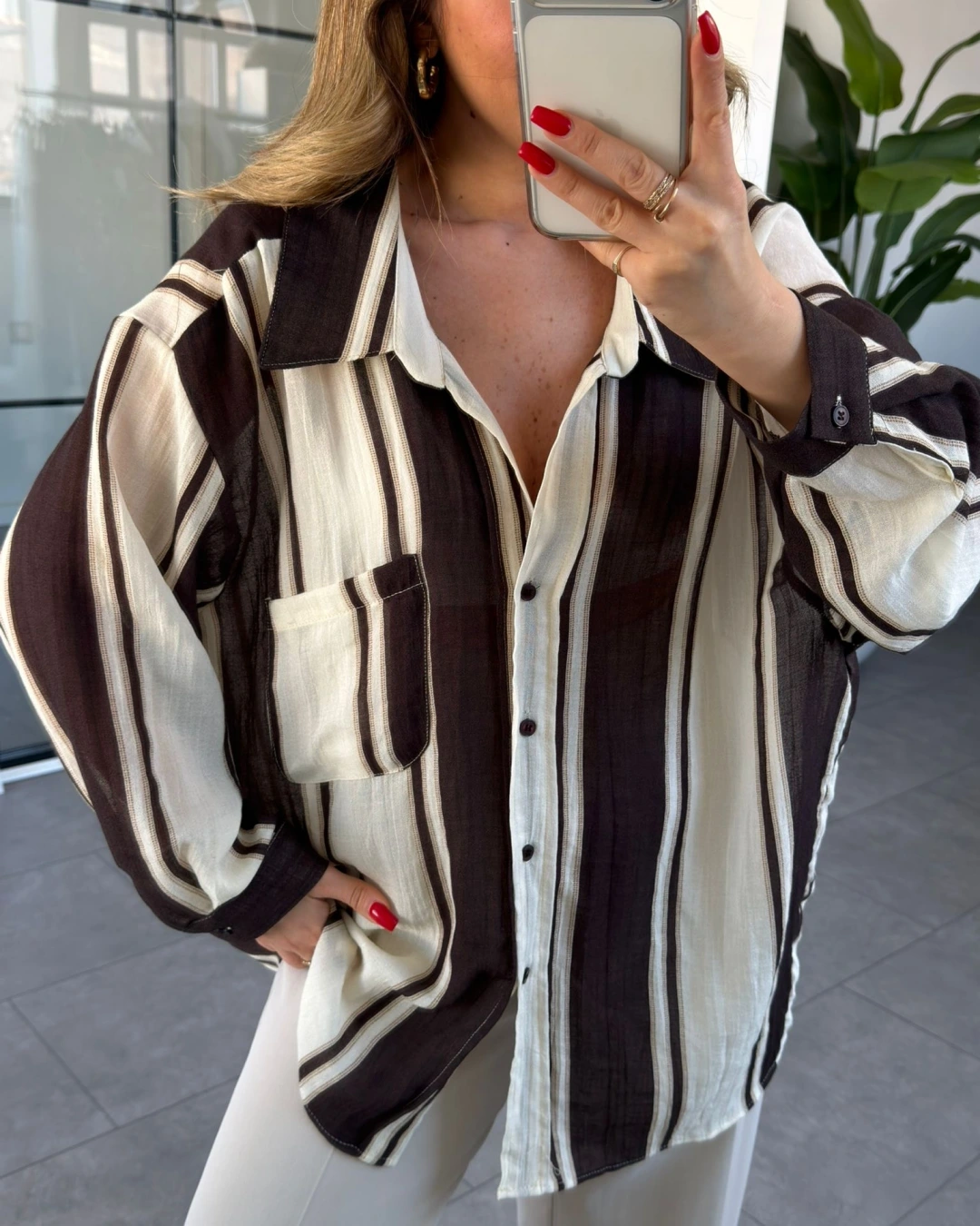 KAHVE KREM ÇİZGİLİ OVERSİZE GÖMLEK 5060