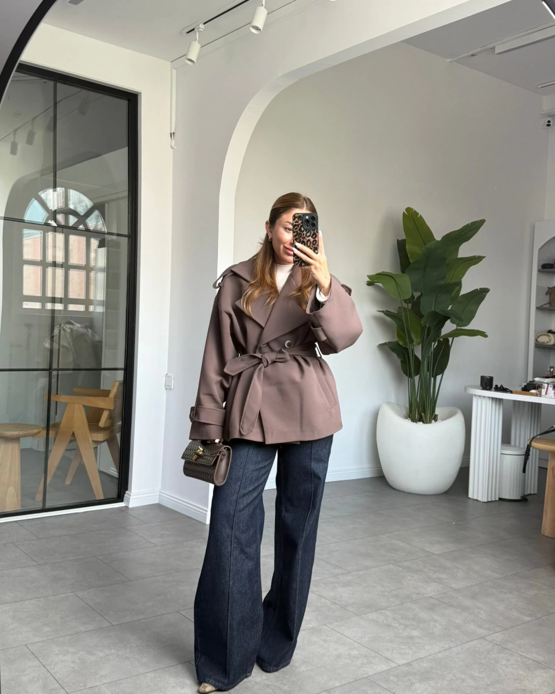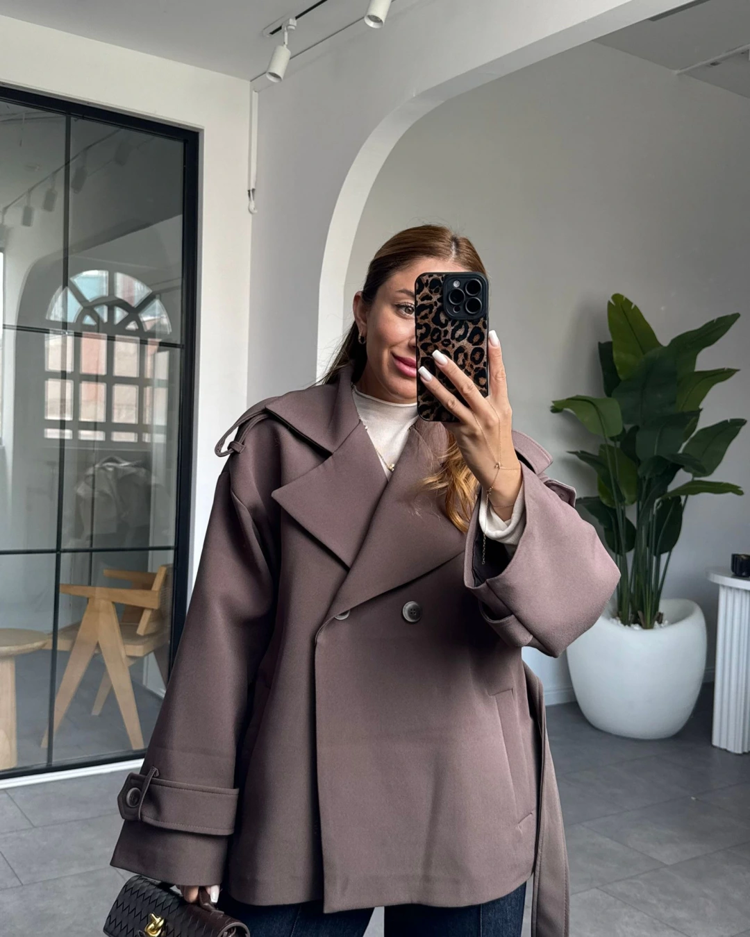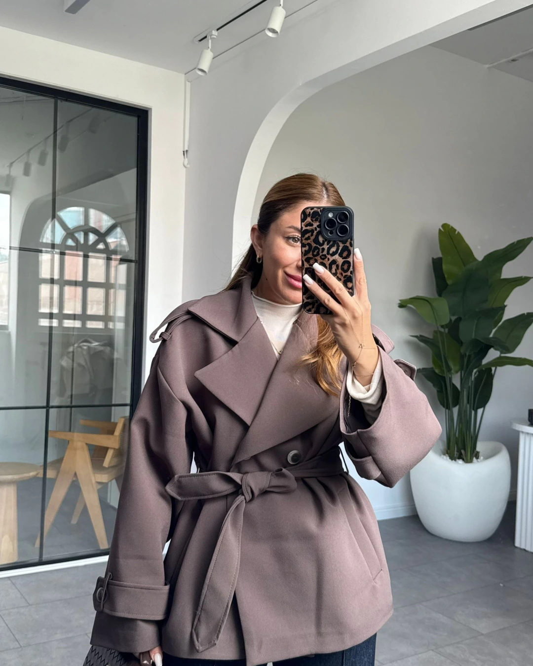 KAHVE KRUVAZE YAKA KUŞAKLI KISA TRENÇKOT