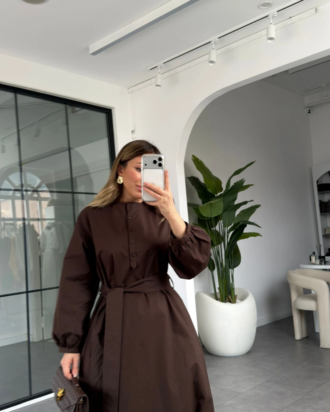 KAHVE KUŞAKLI UZUN ELBİSE 2349
