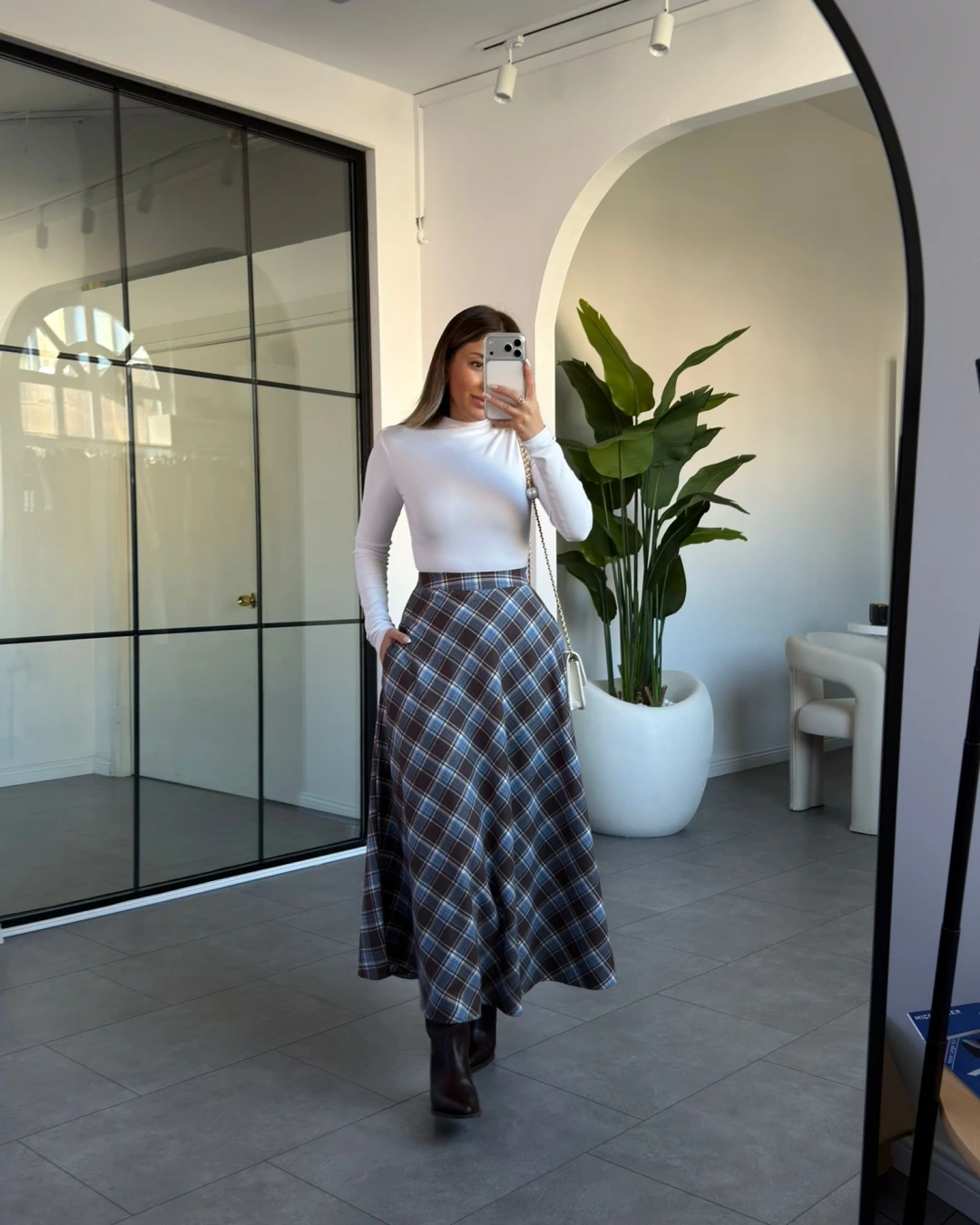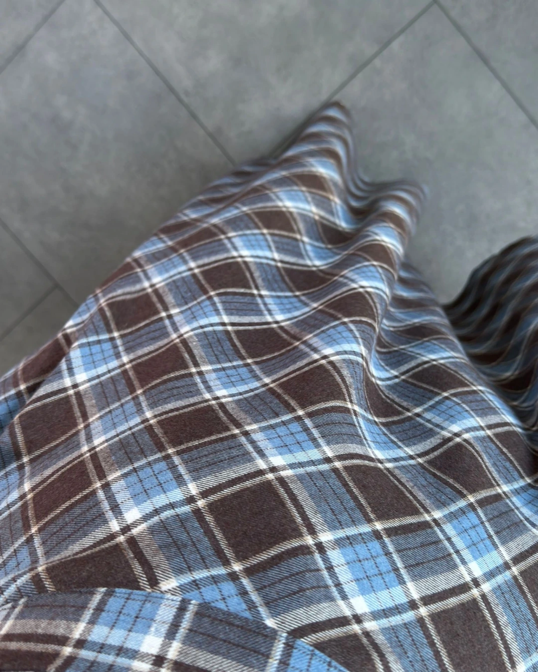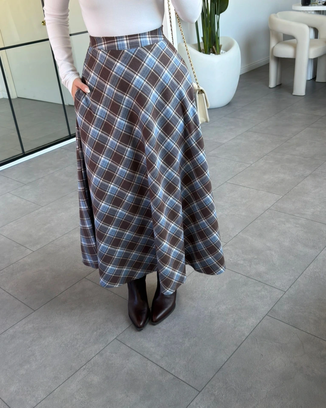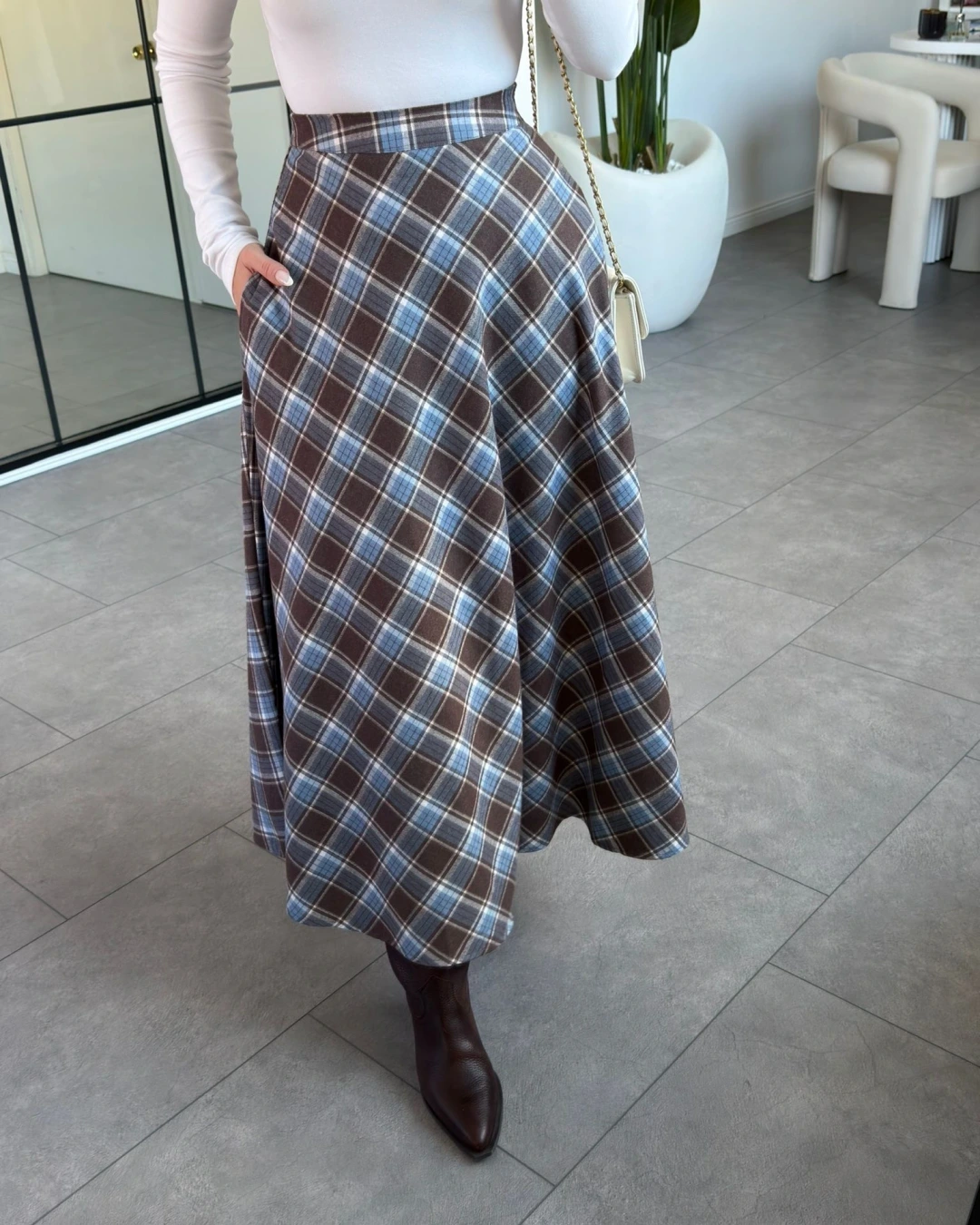 KAHVE MAVİ CEPLİ EKOSE DESEN ETEK