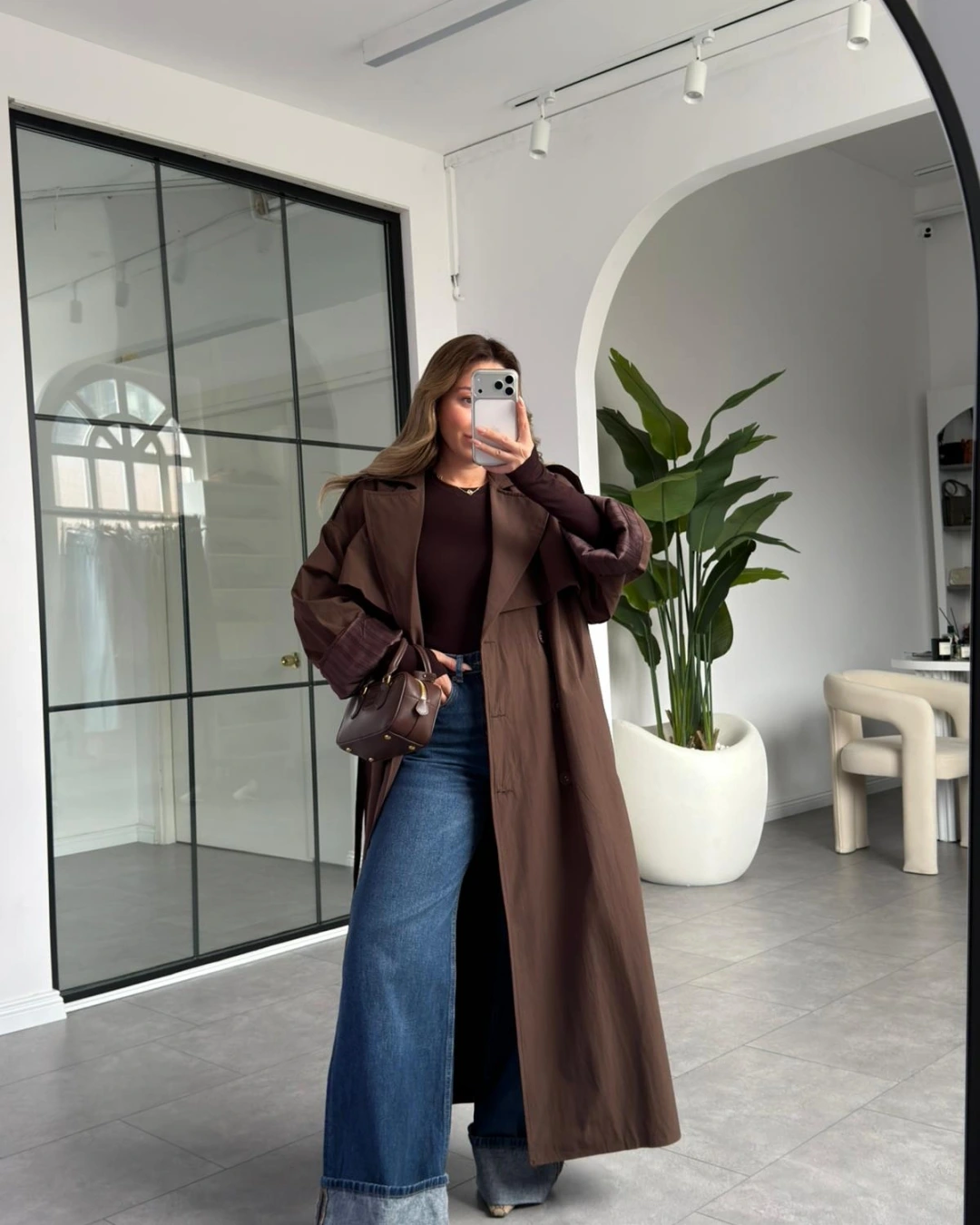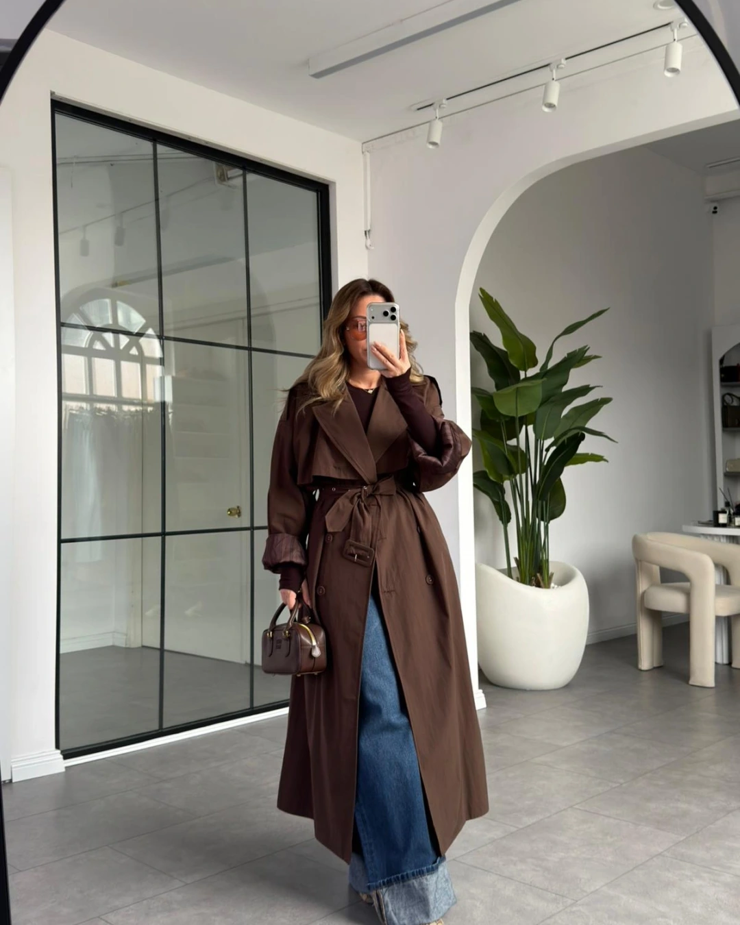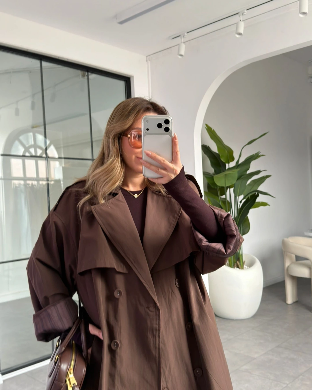 KAHVE OVERSİZE İÇ ASTARI ÇİZGİLİ TRENÇKOT