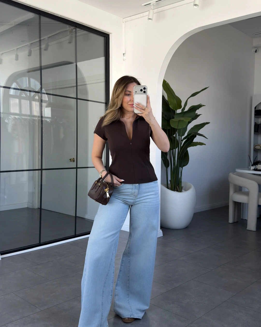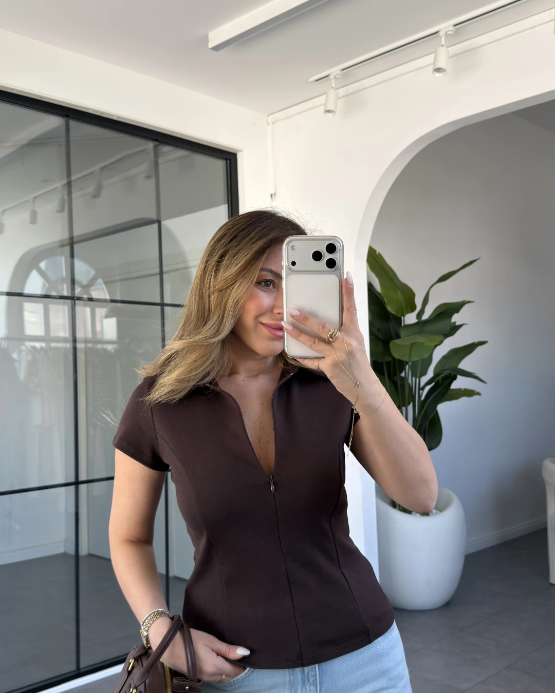 KAHVE POLO YAKA FERMUARLI BLUZ 3232
