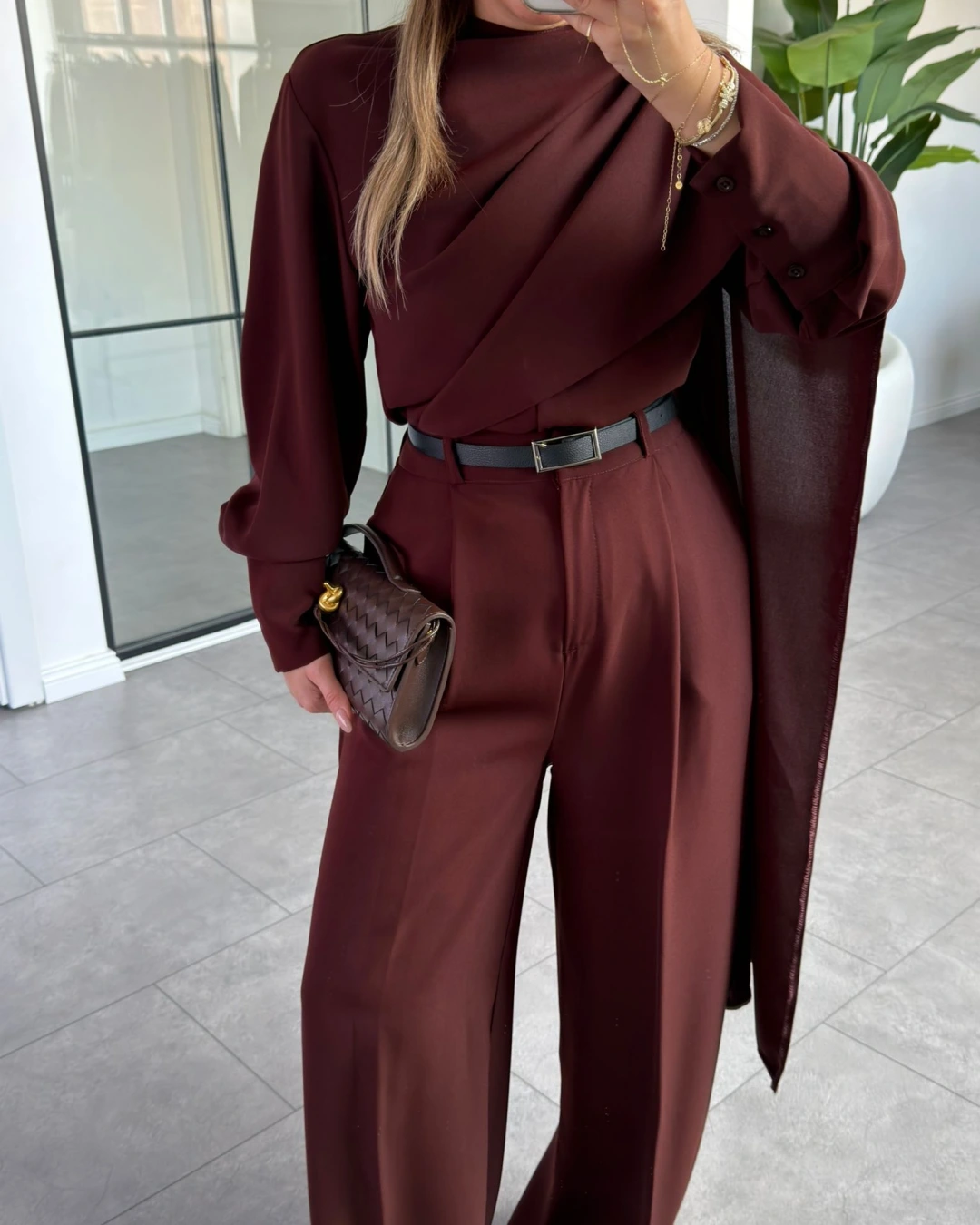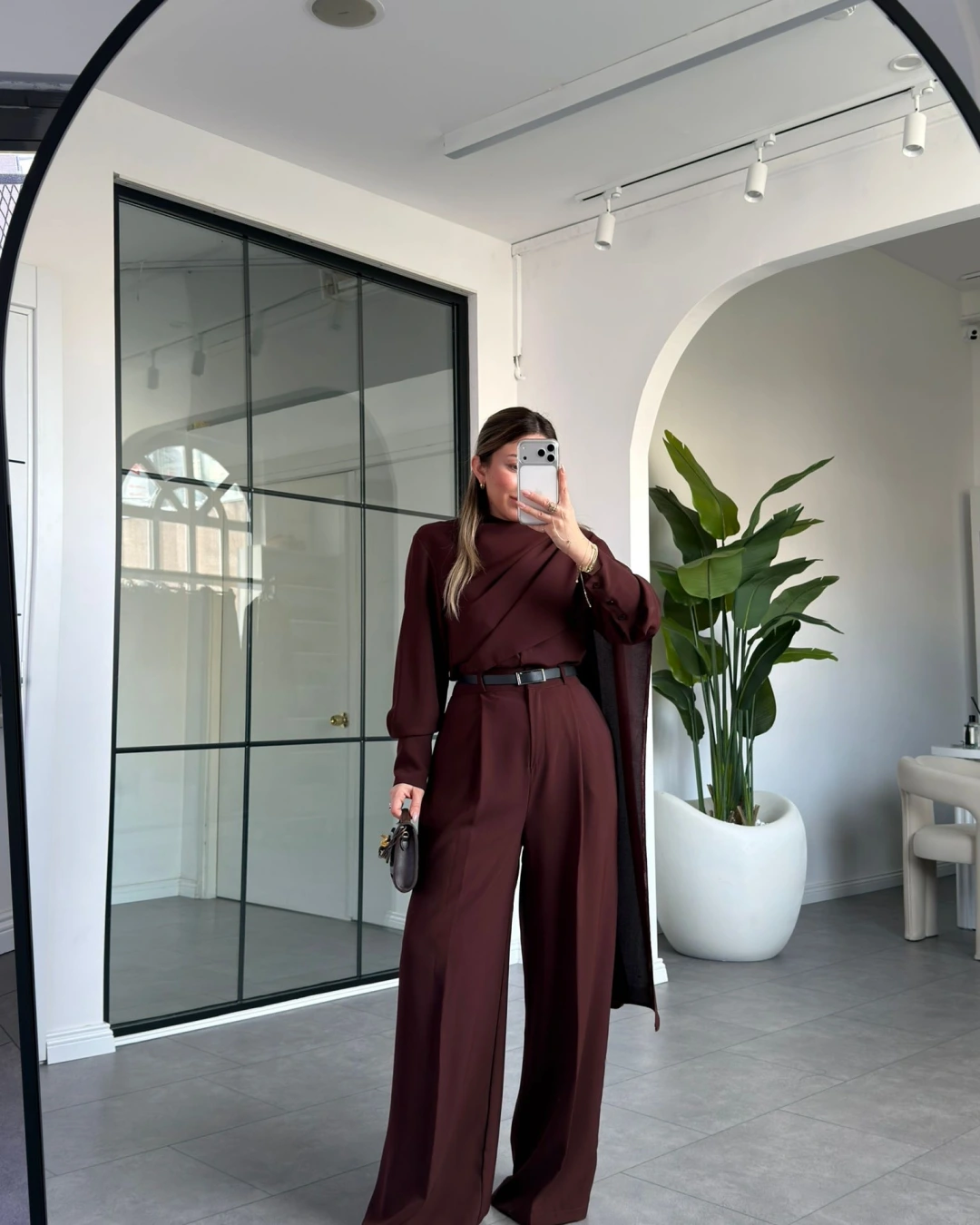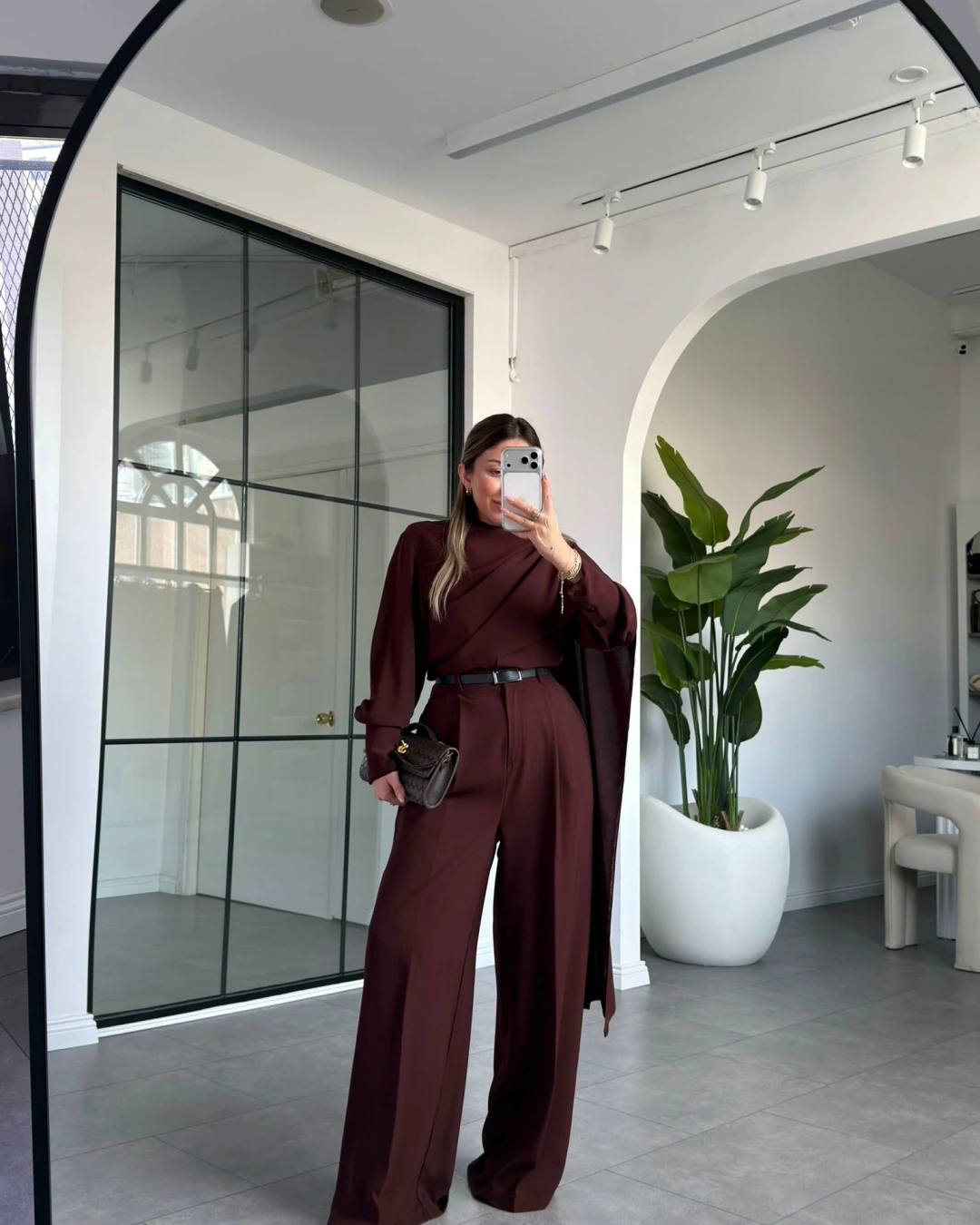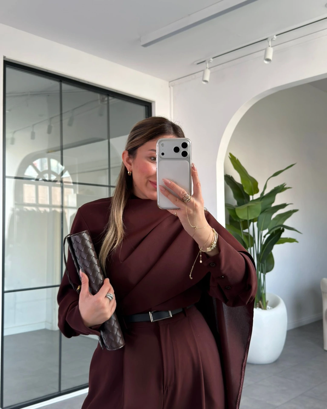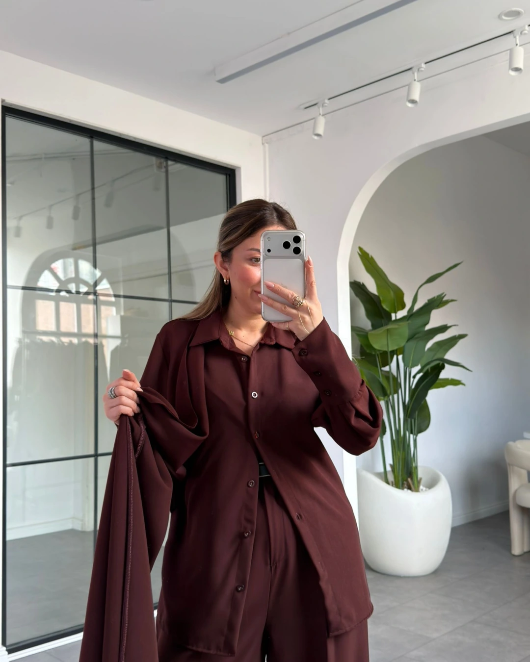 KAHVE ŞAL DETAYLI KEMERLİ GÖMLEK TAKIM