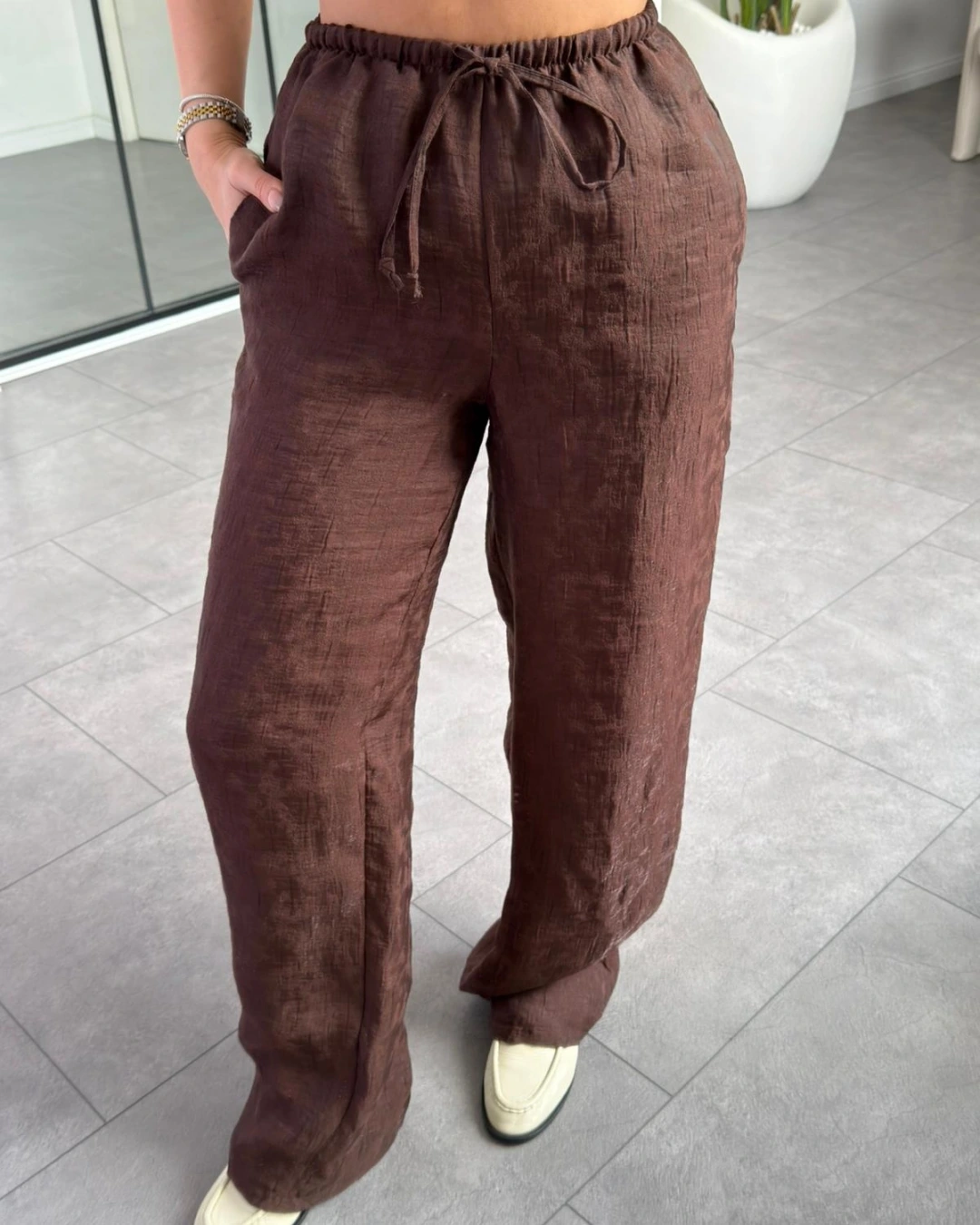 Pantolon yüksek beldir. Beli lastiklidir.