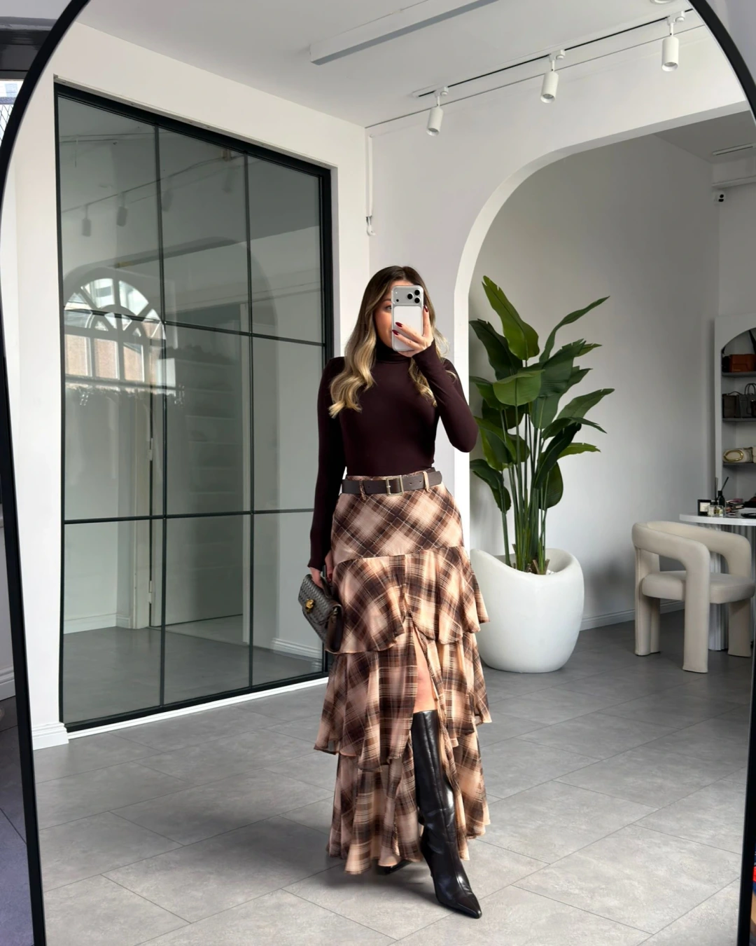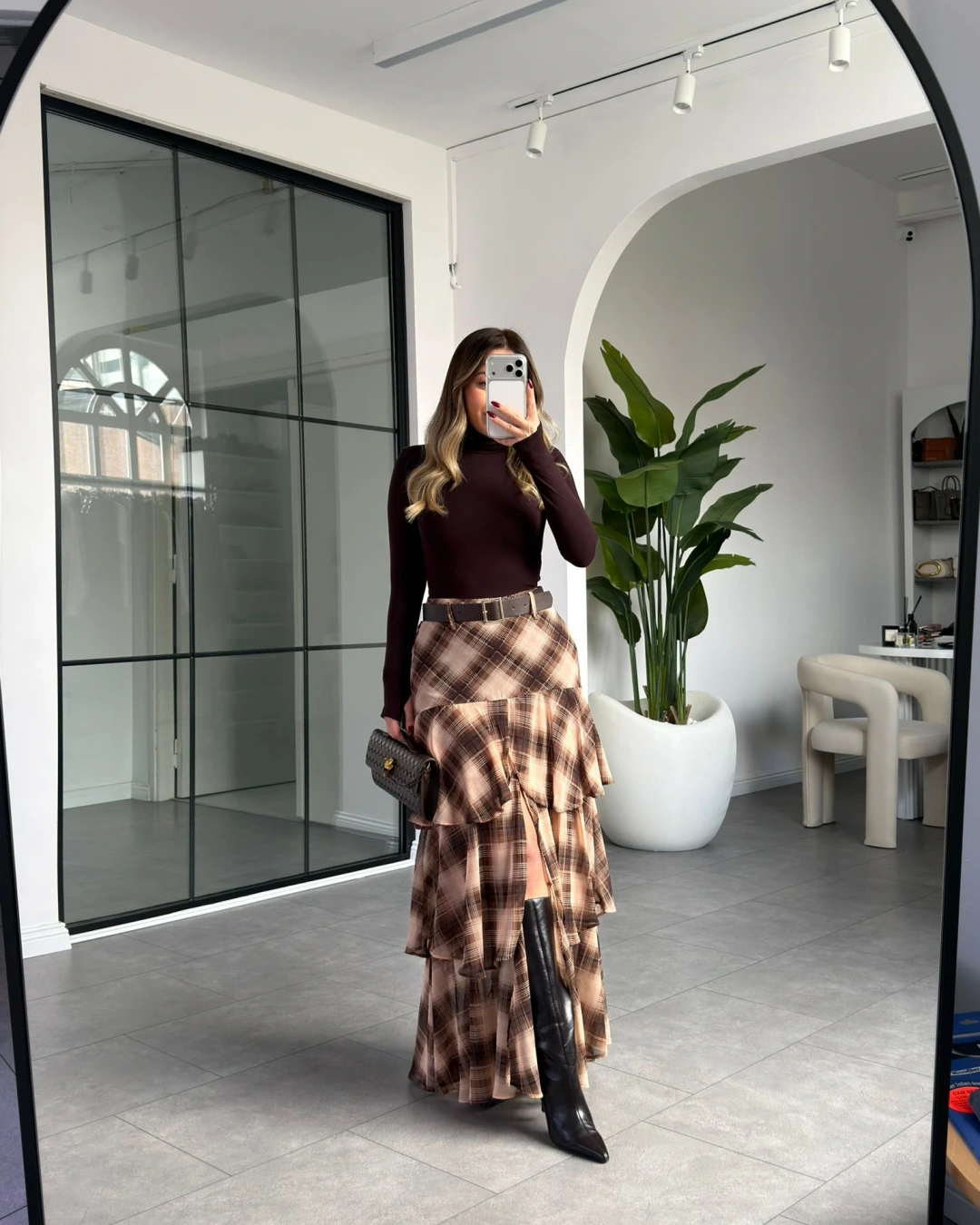 KAHVE ŞİFON KAT KAT KEMERLİ ETEK