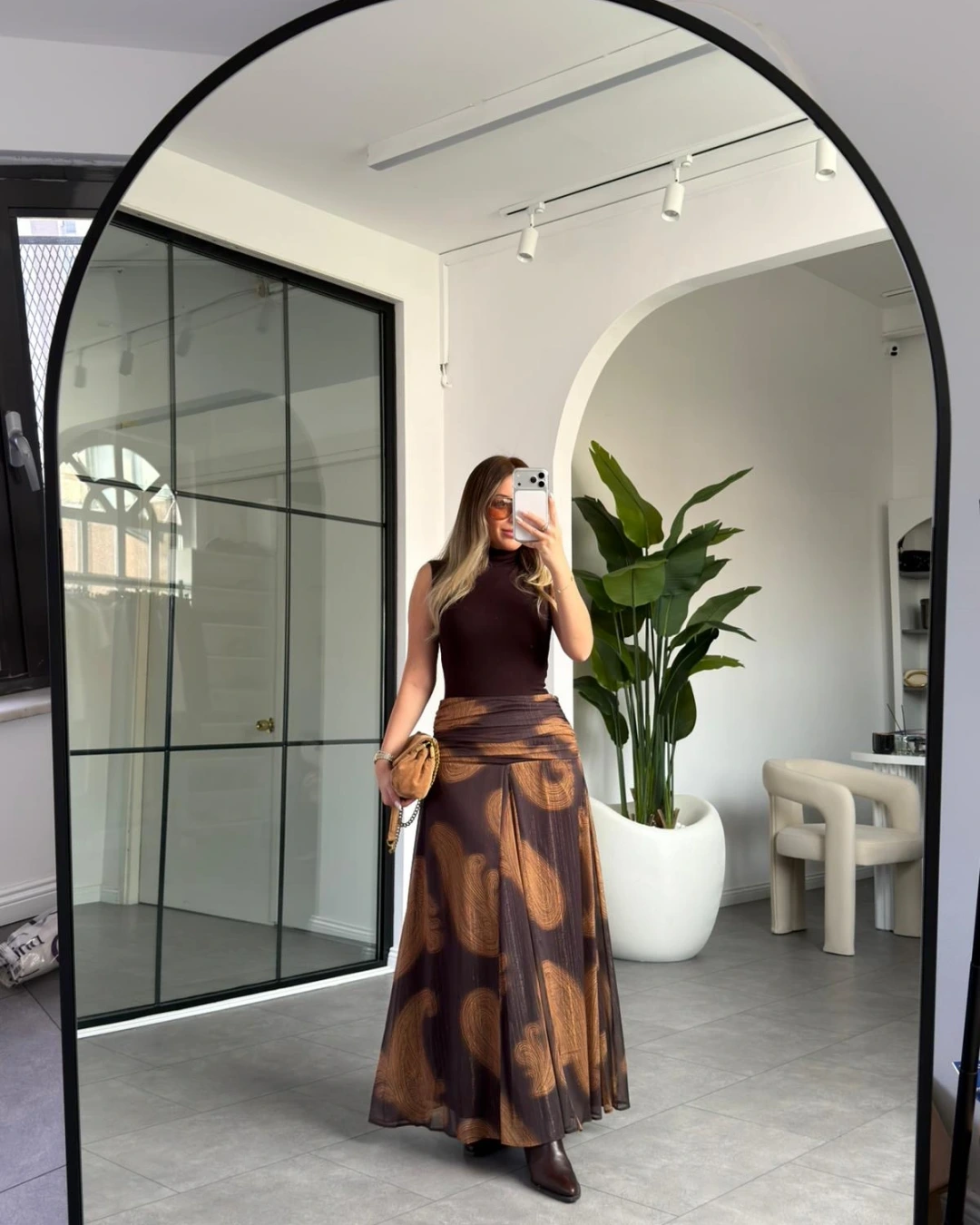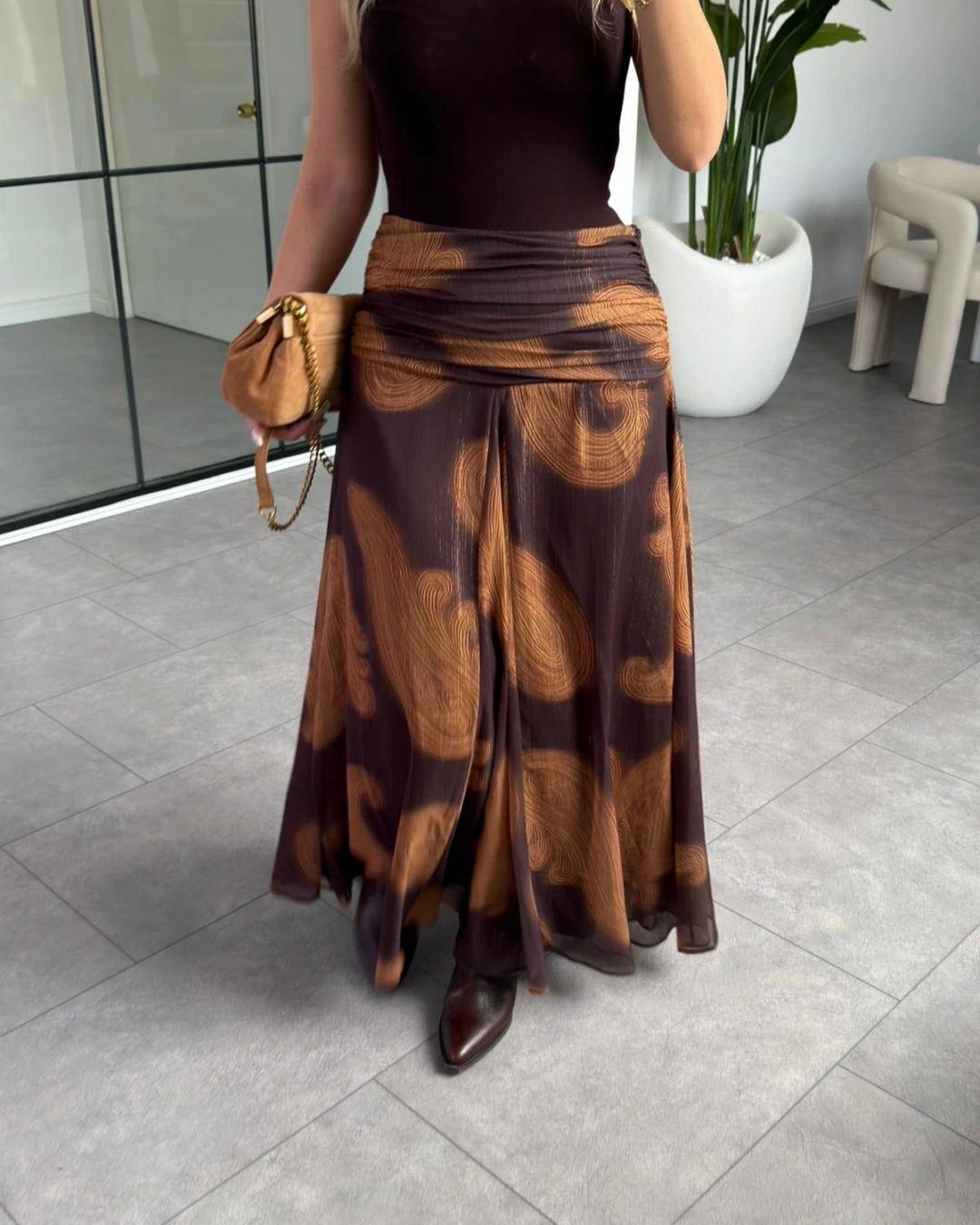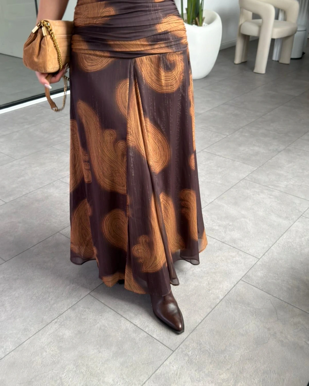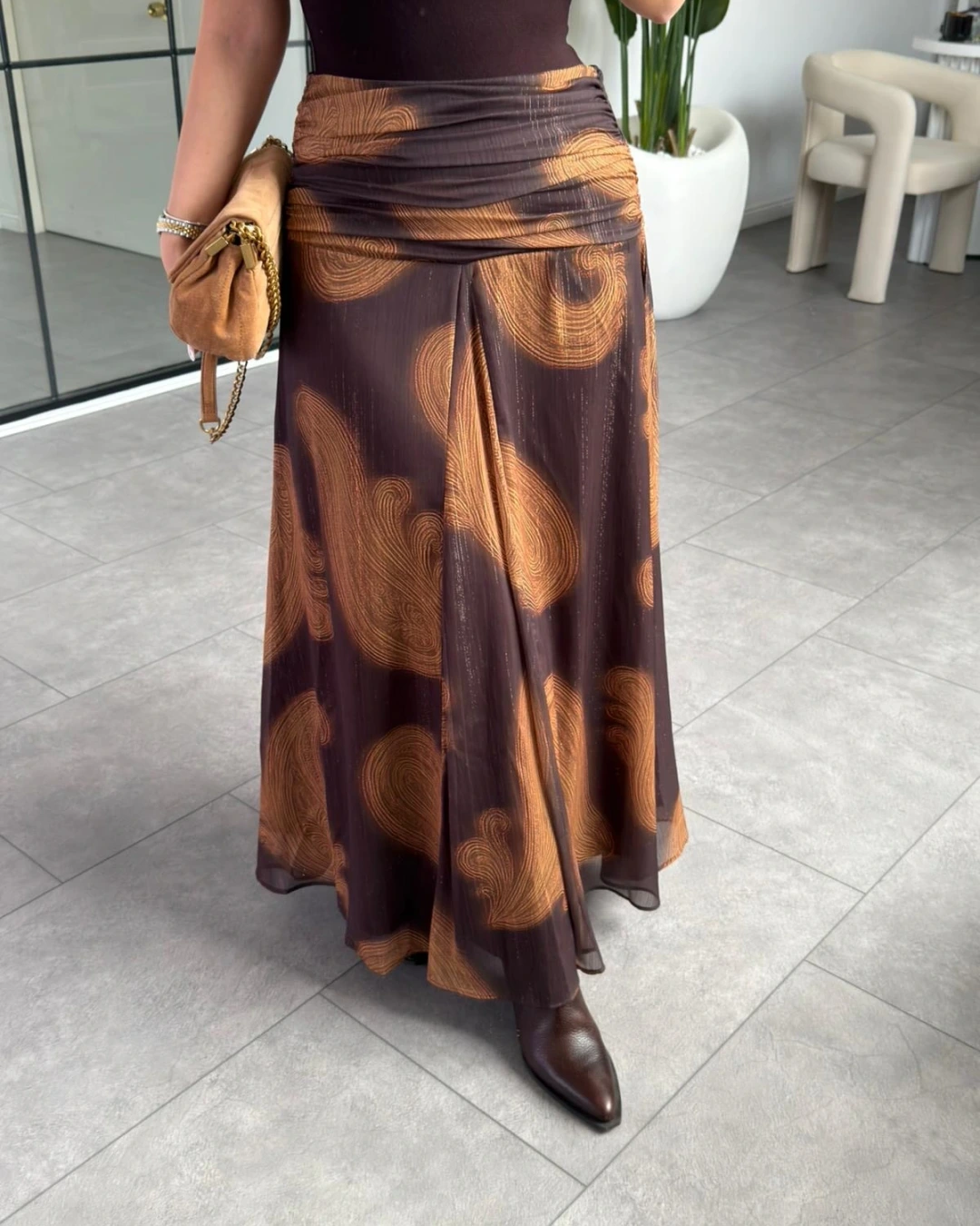 KAHVE SİMLİ ŞİFON UZUN ETEK