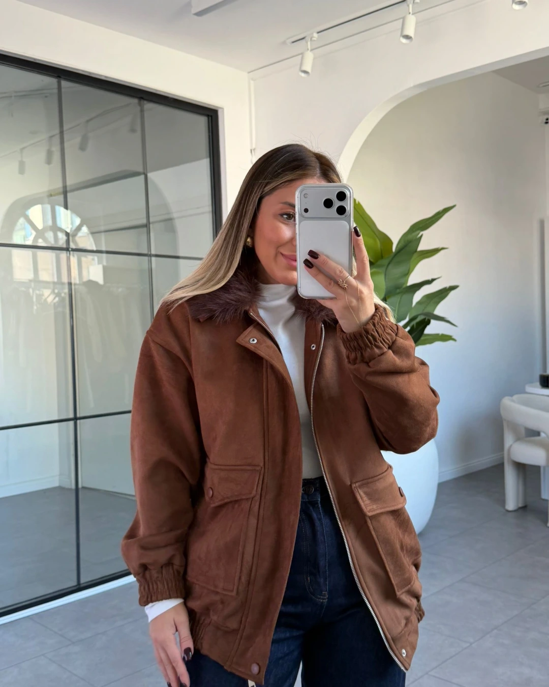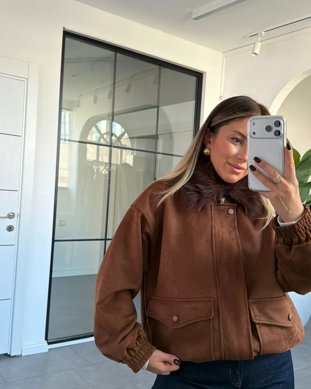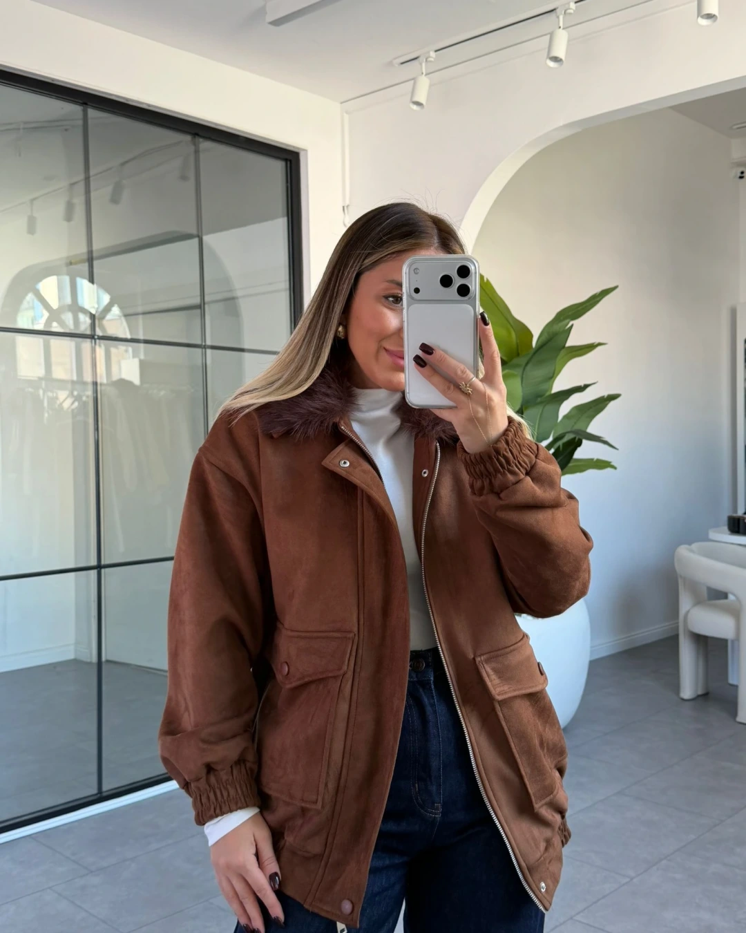 KAHVE TORBA CEPLİ KÜRK YAKA SÜET CEKET