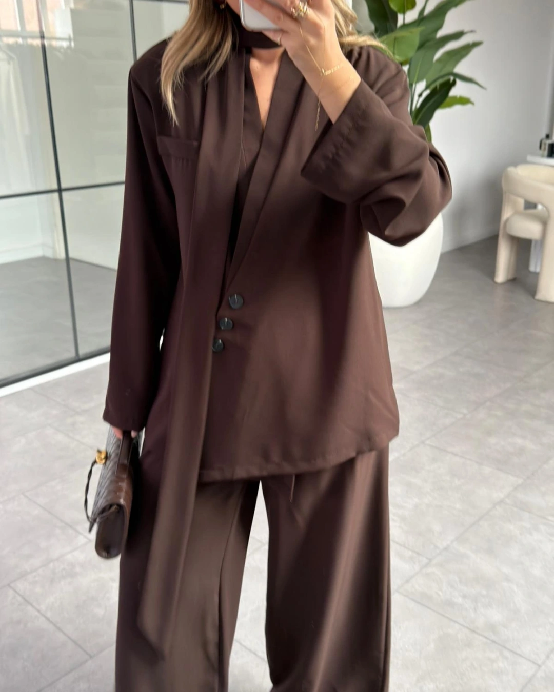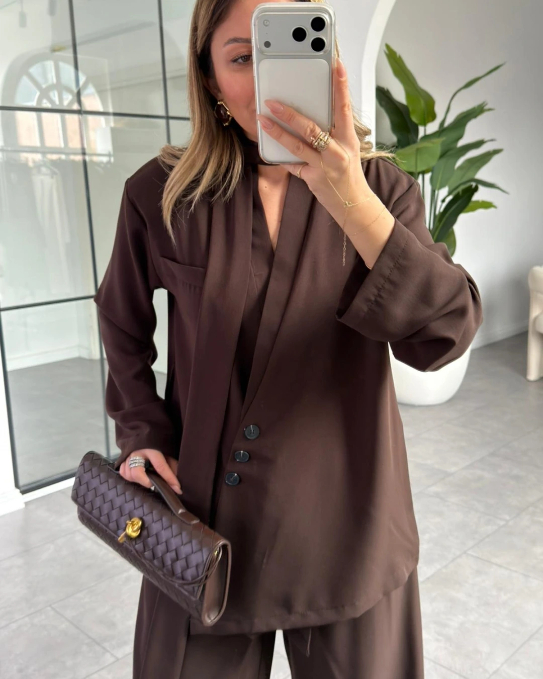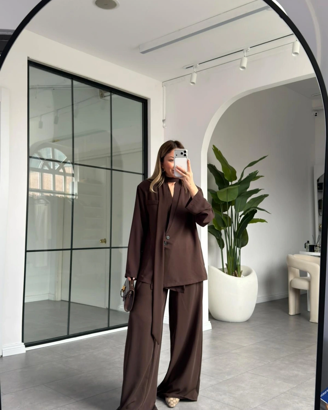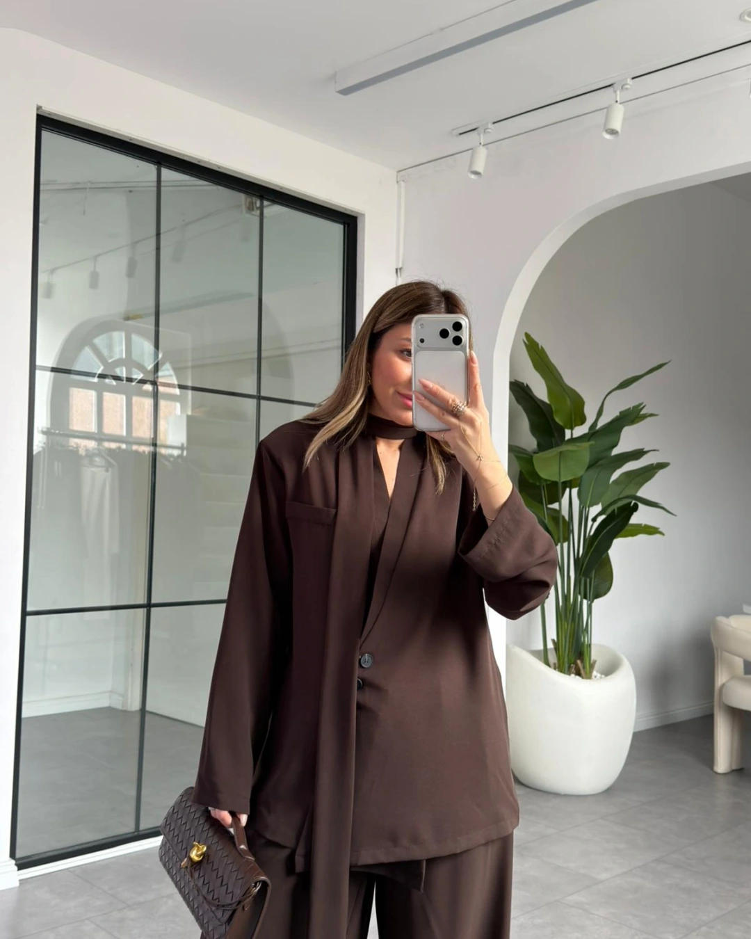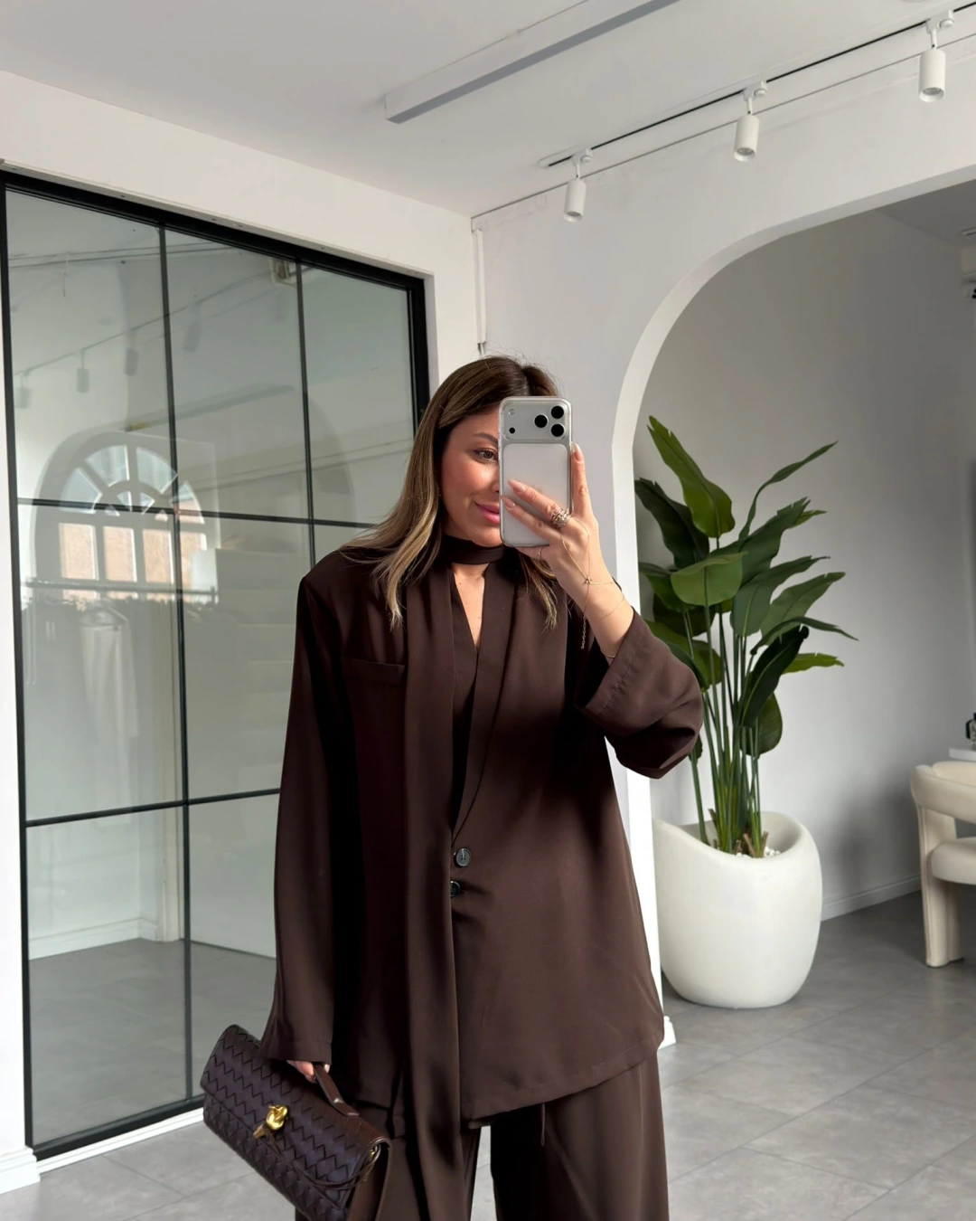 KAHVE ÜÇ DÜĞMELİ ASİMETRİK KUŞAKLI CEKET TAKIM