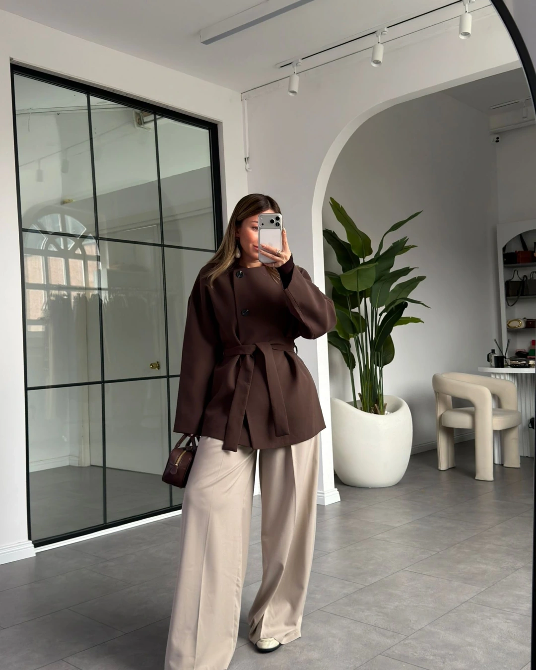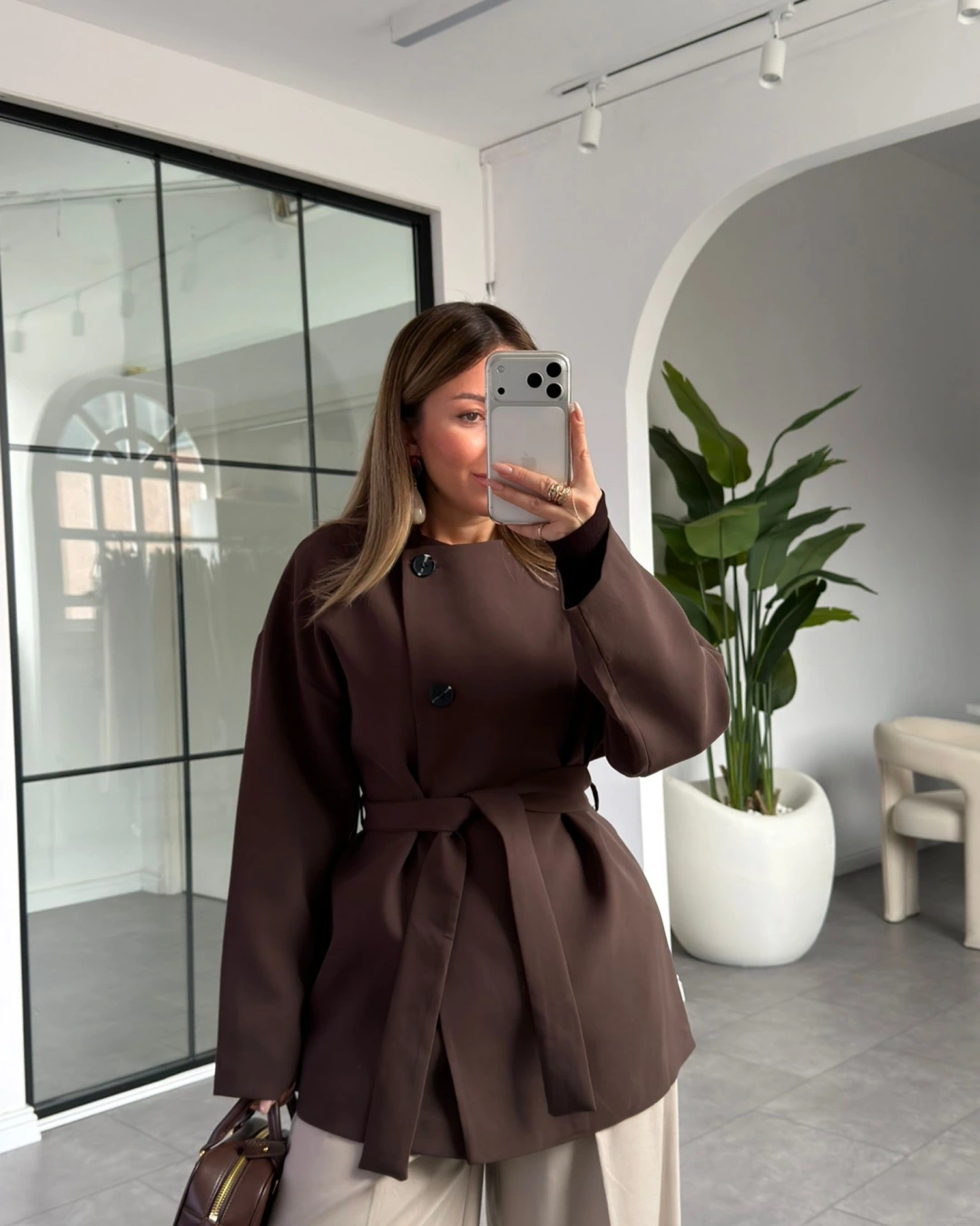KAHVE ÜÇ DÜĞMELİ KUŞAKLI CEKET