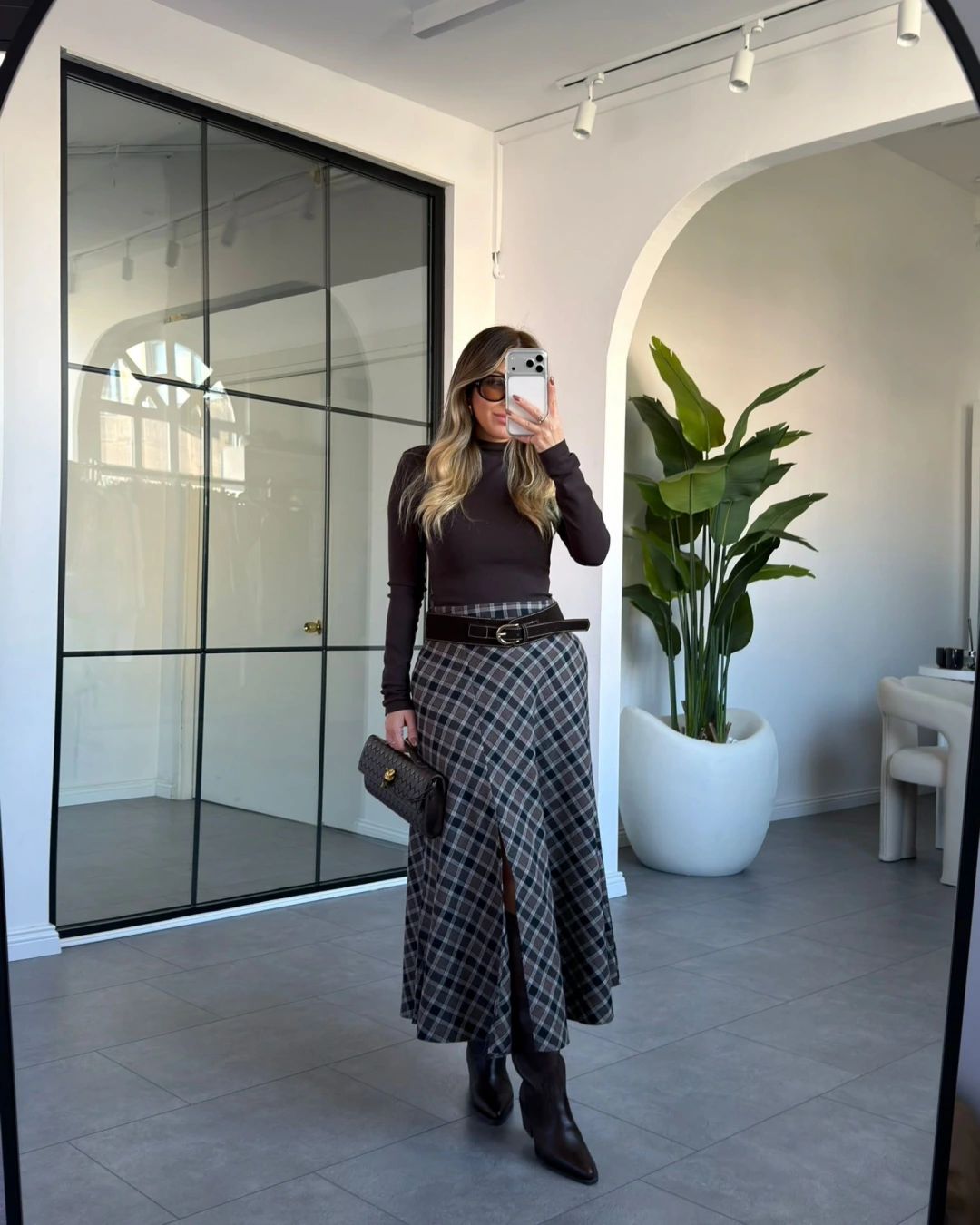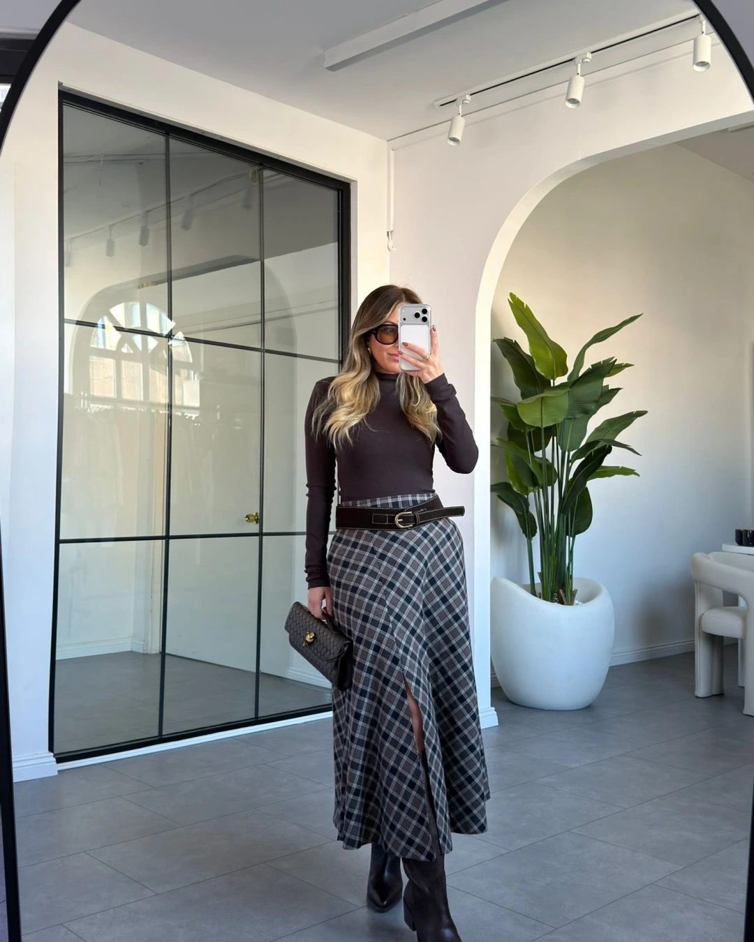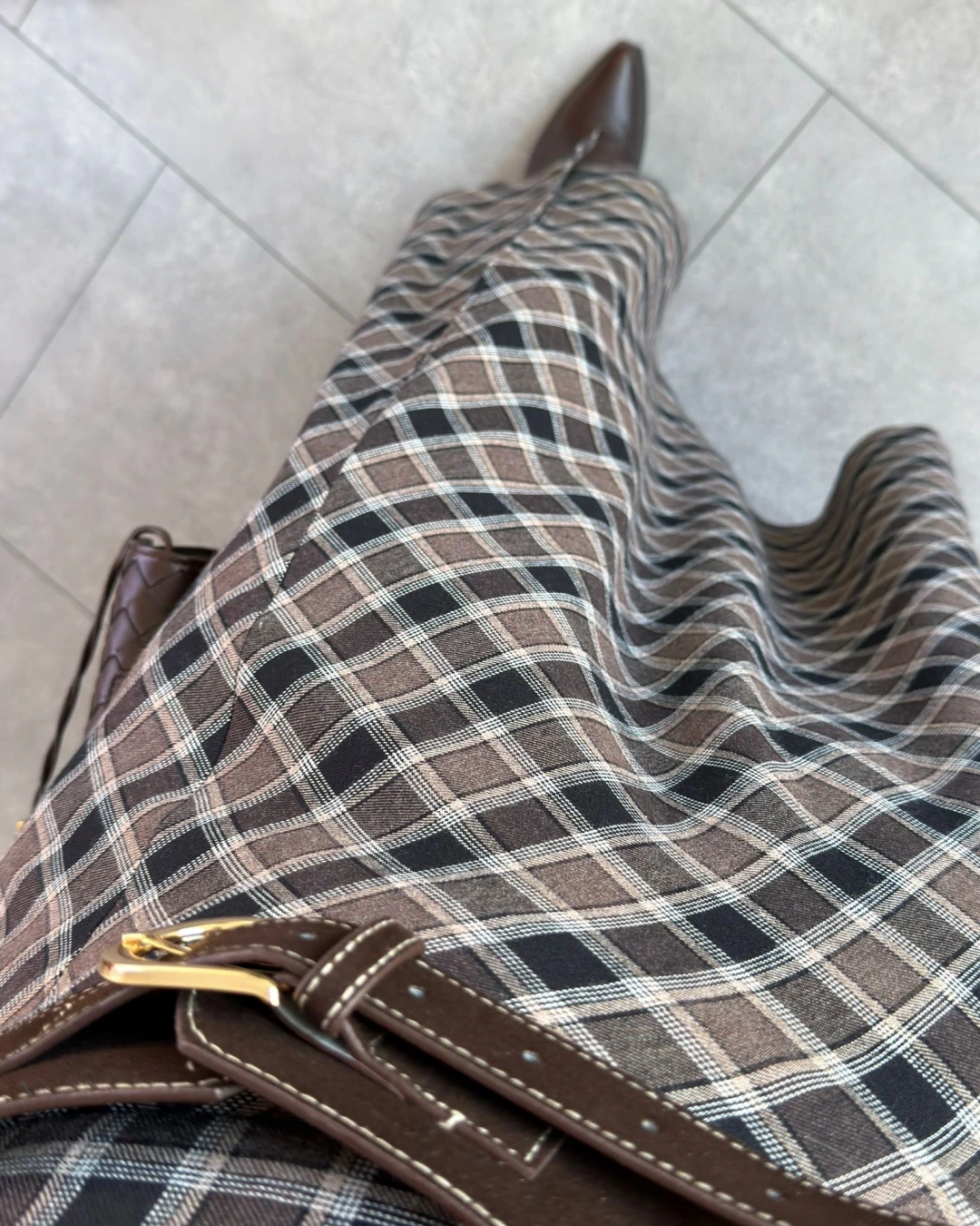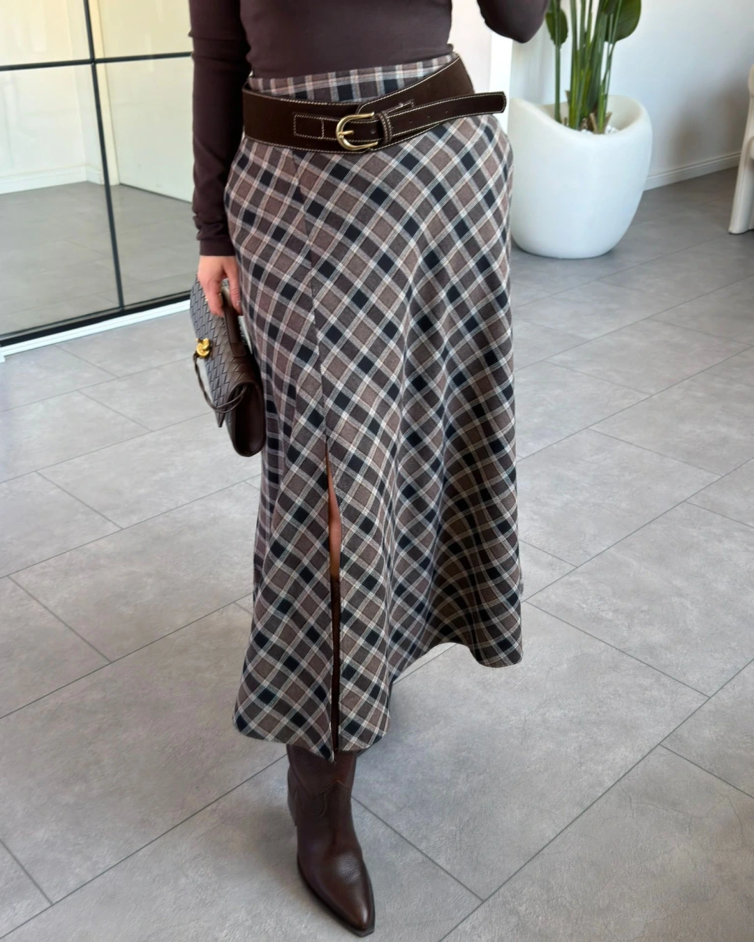 KAHVE VİZON YIRTMAÇ DETAY KEMERLİ EKOSE ETEK