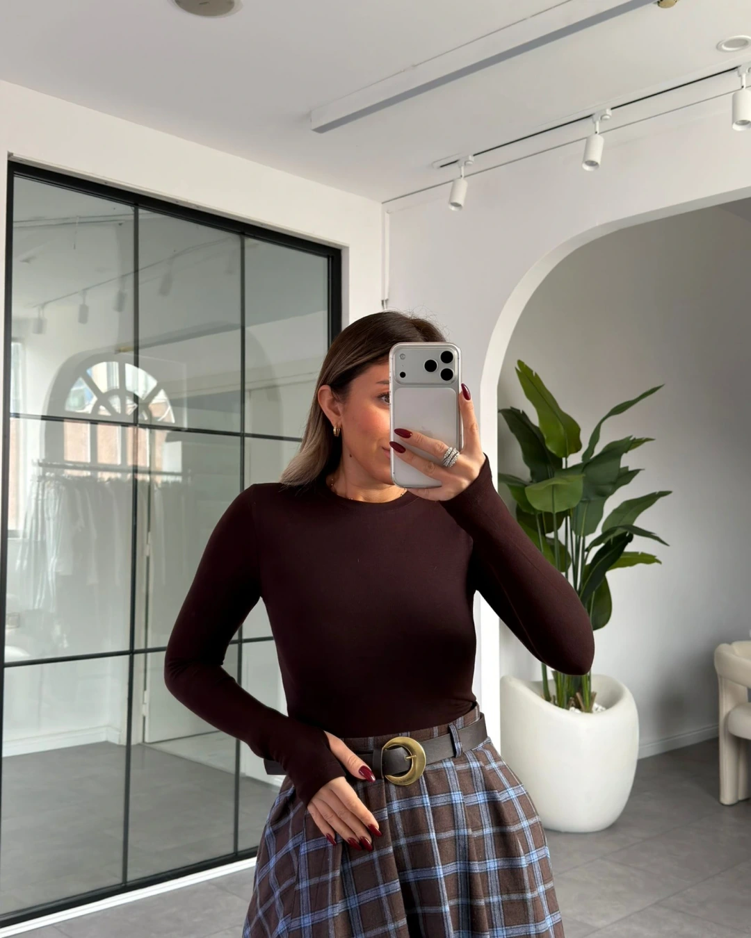 KAHVERENGİ BİSİKLET YAKA PARMAK GEÇİRMELİ BLUZ