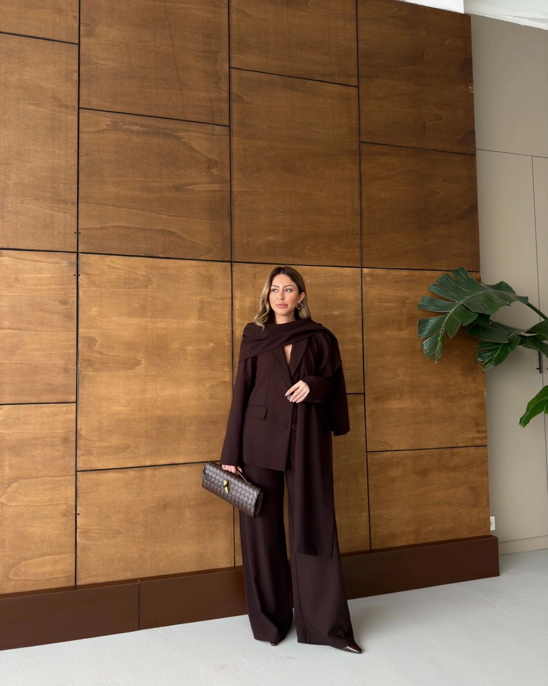 KAHVERENGİ ÇIKARILABİLİR ŞALLI CEKET PANTOLON TAKIM