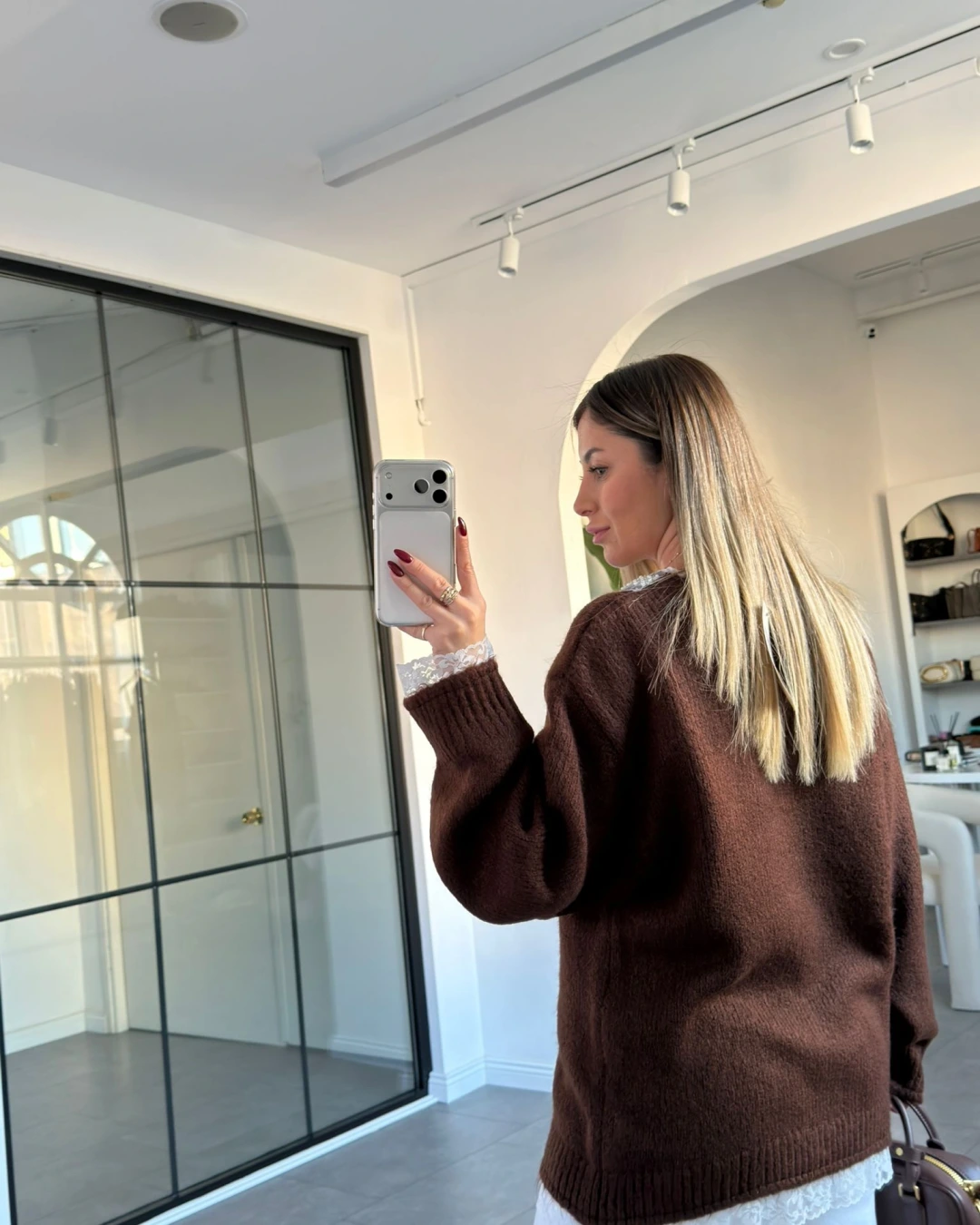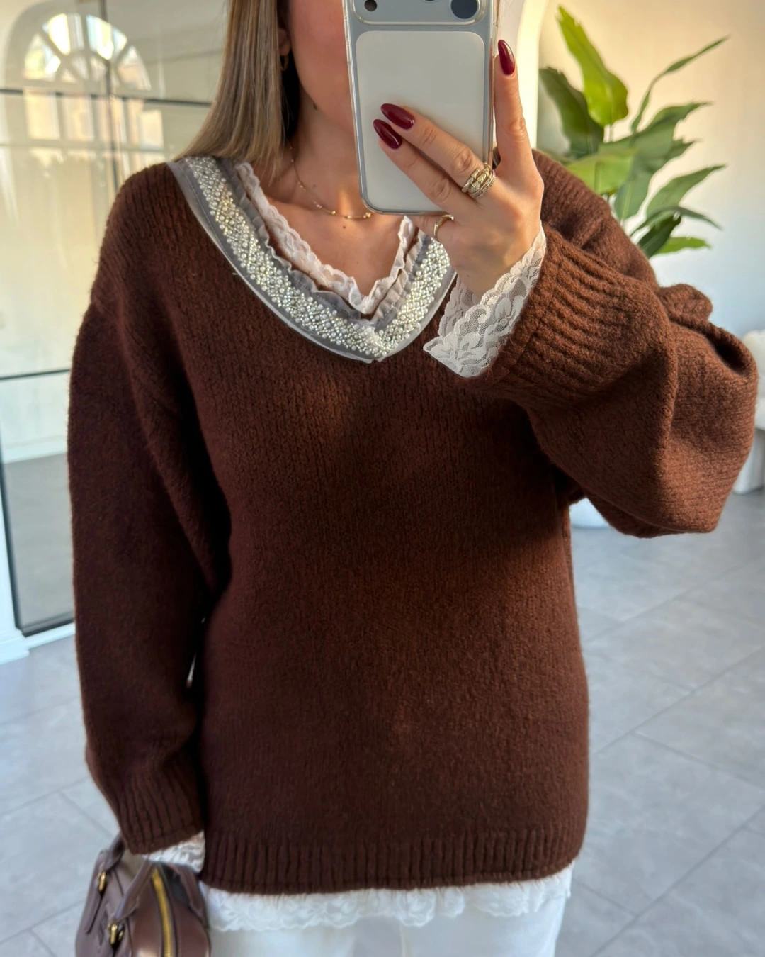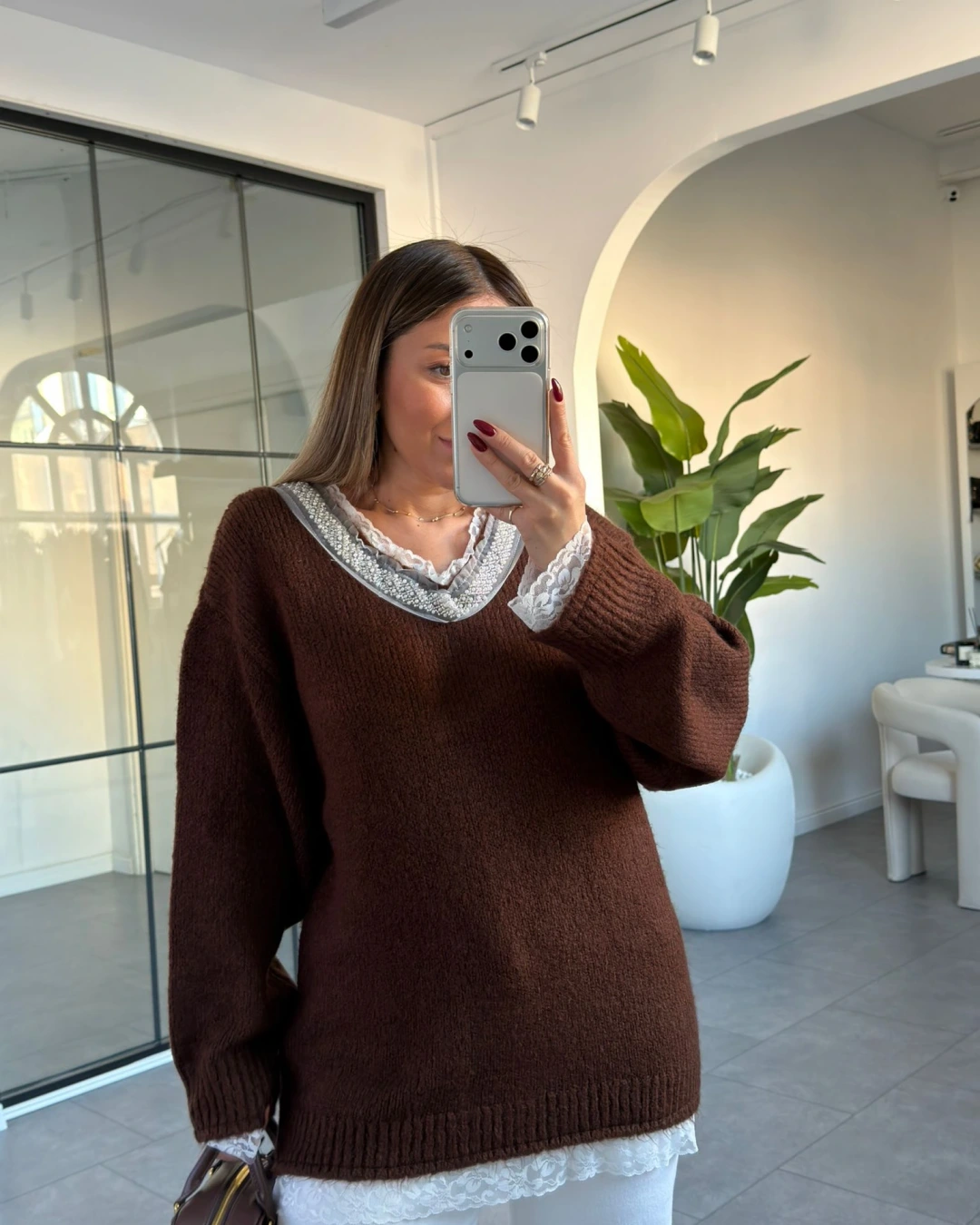 KAHVERENGİ DANTEL DETAY TASARIM KAZAK