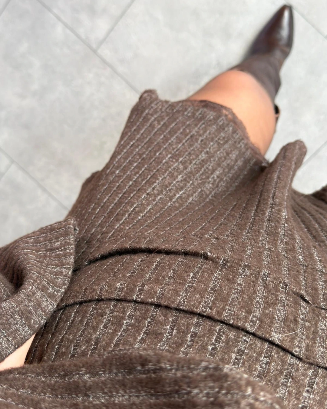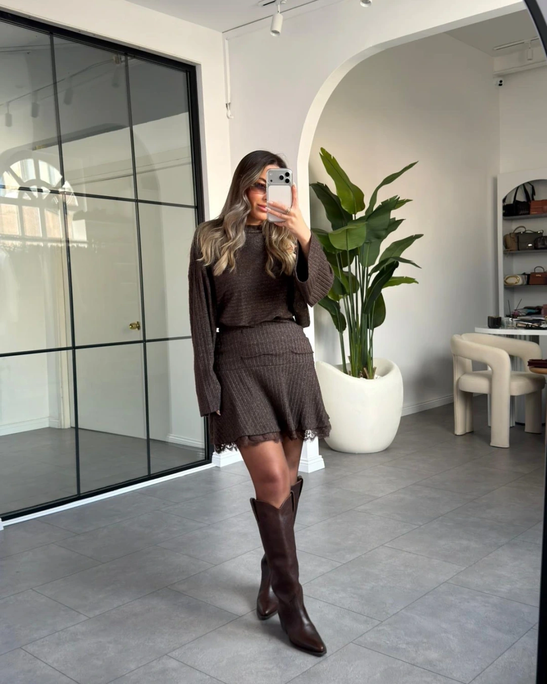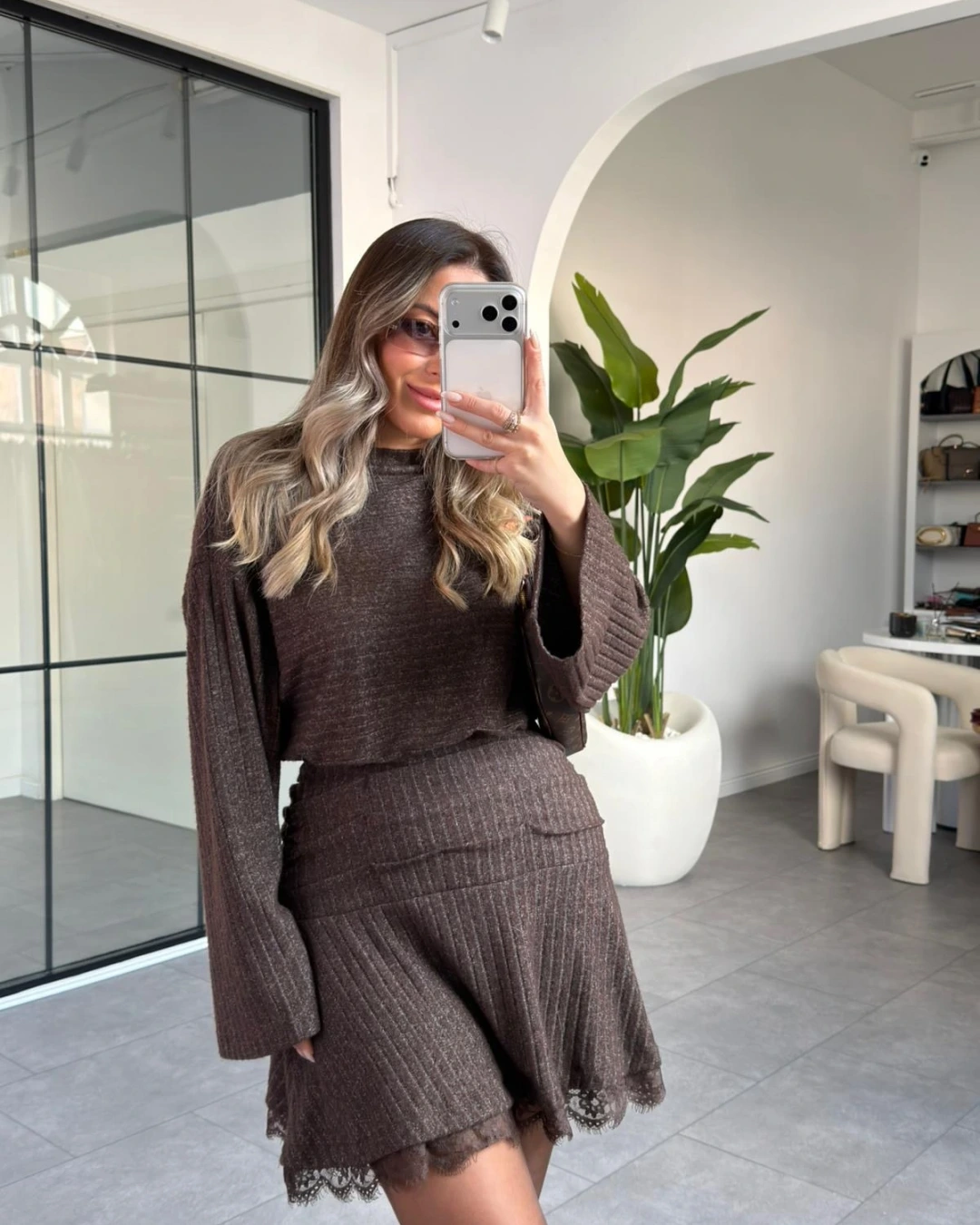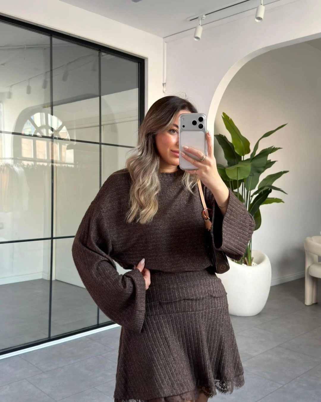 KAHVERENGİ DANTEL DETAY TRİKO ELBİSE