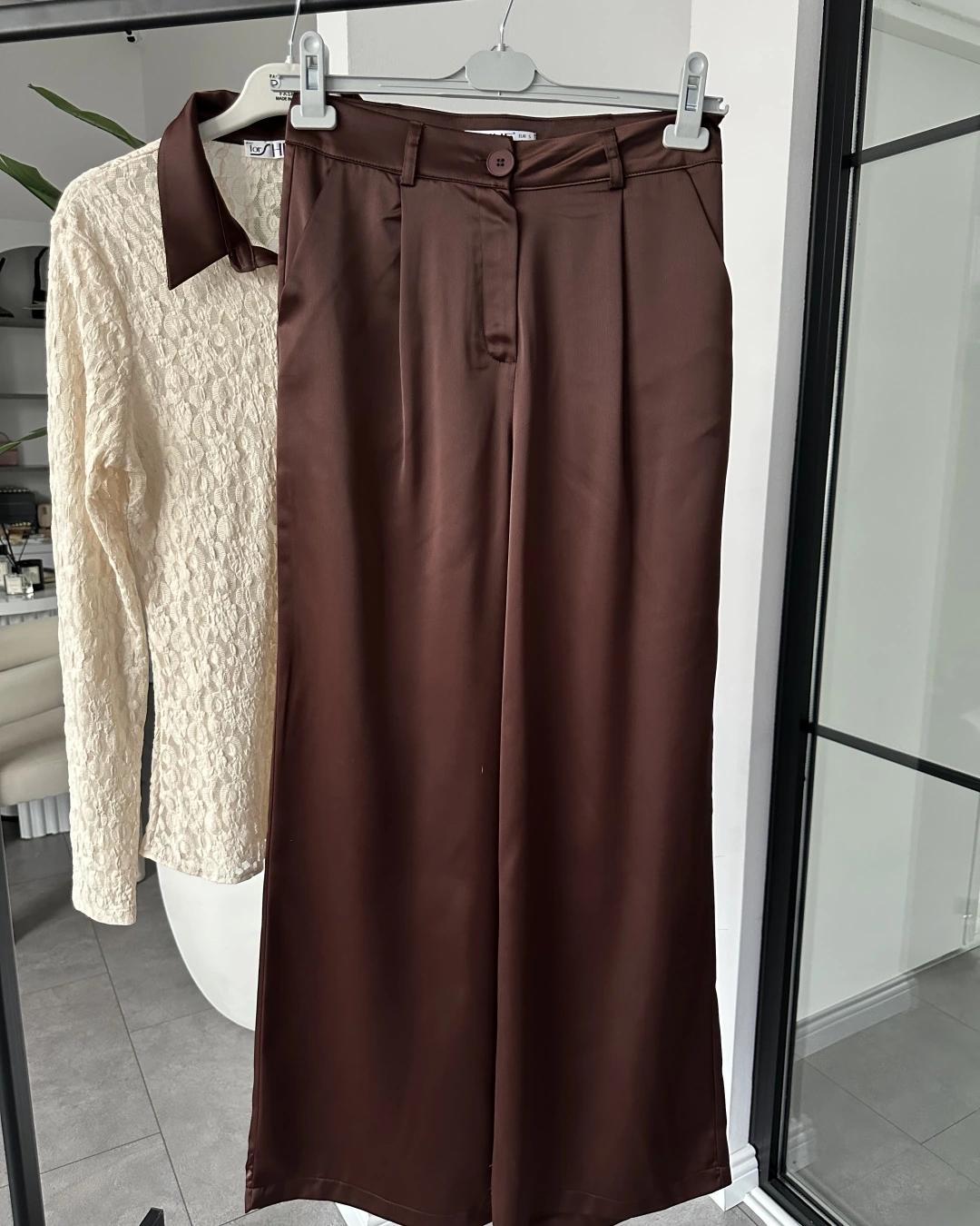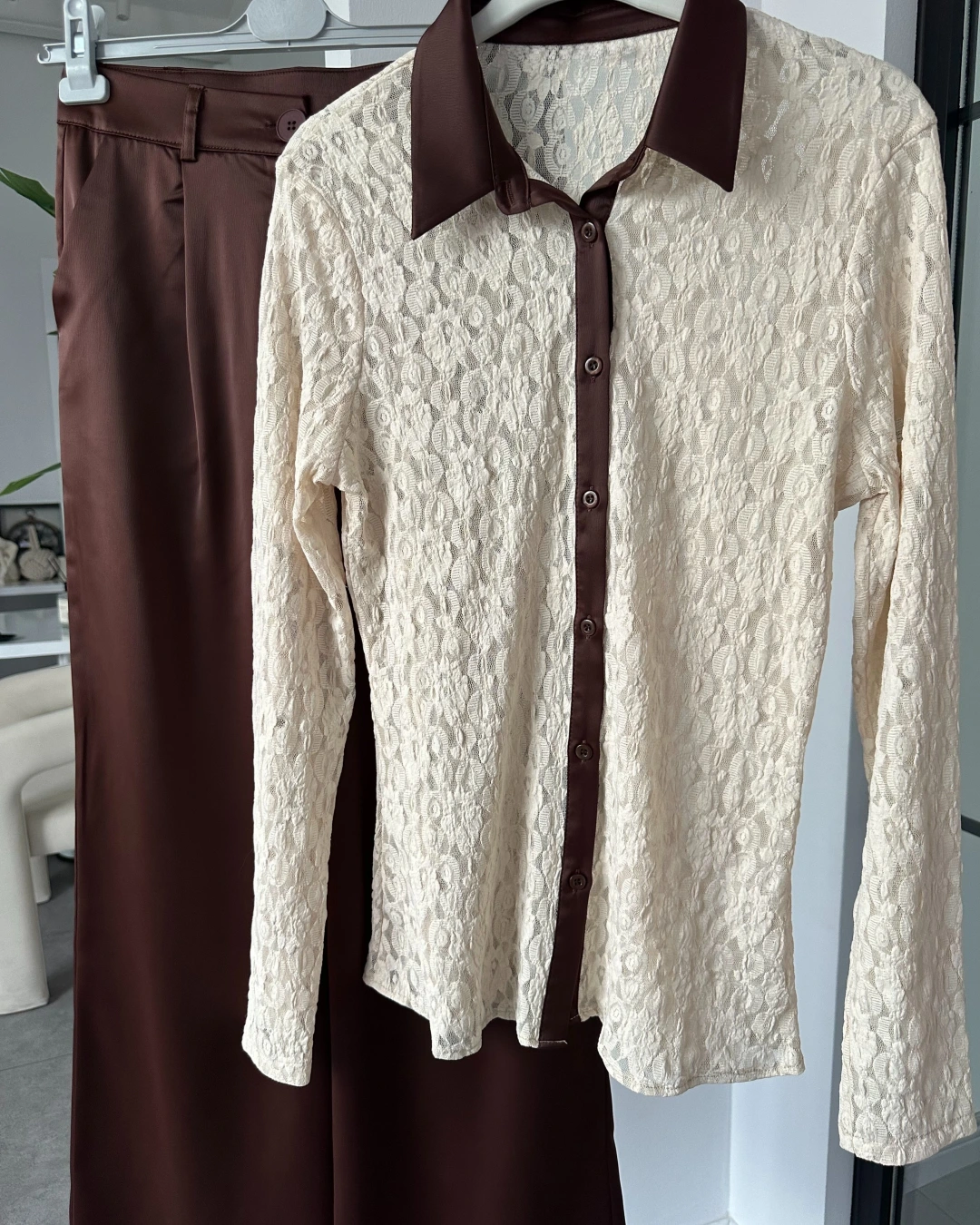 KAHVERENGİ DANTEL GÖMLEK SATEN PANTOLON TAKIM 60625