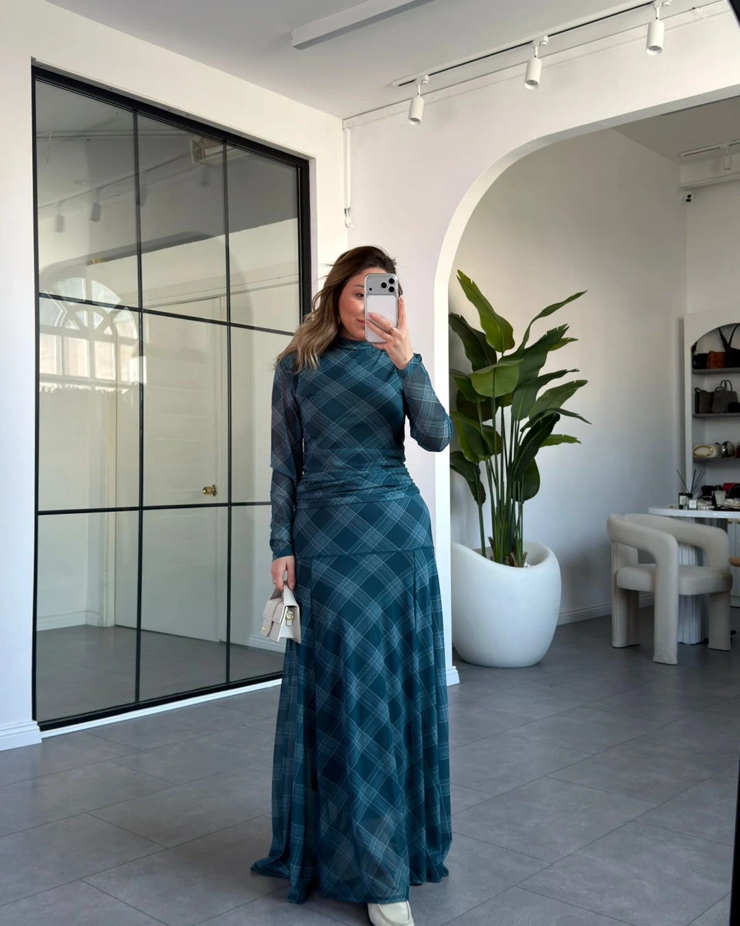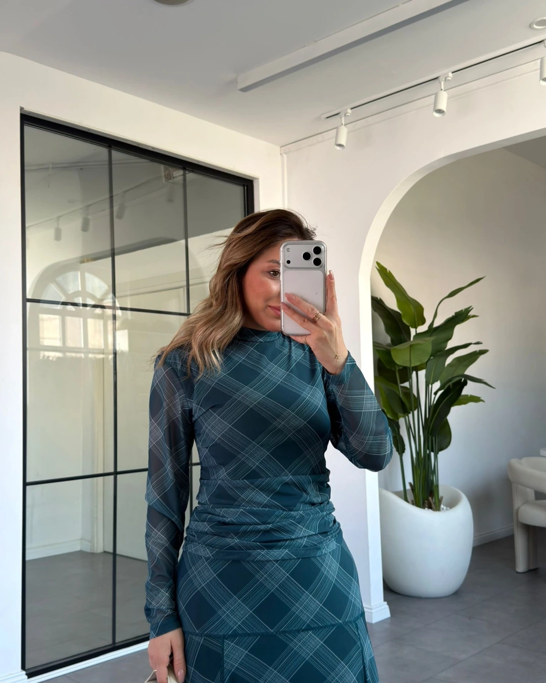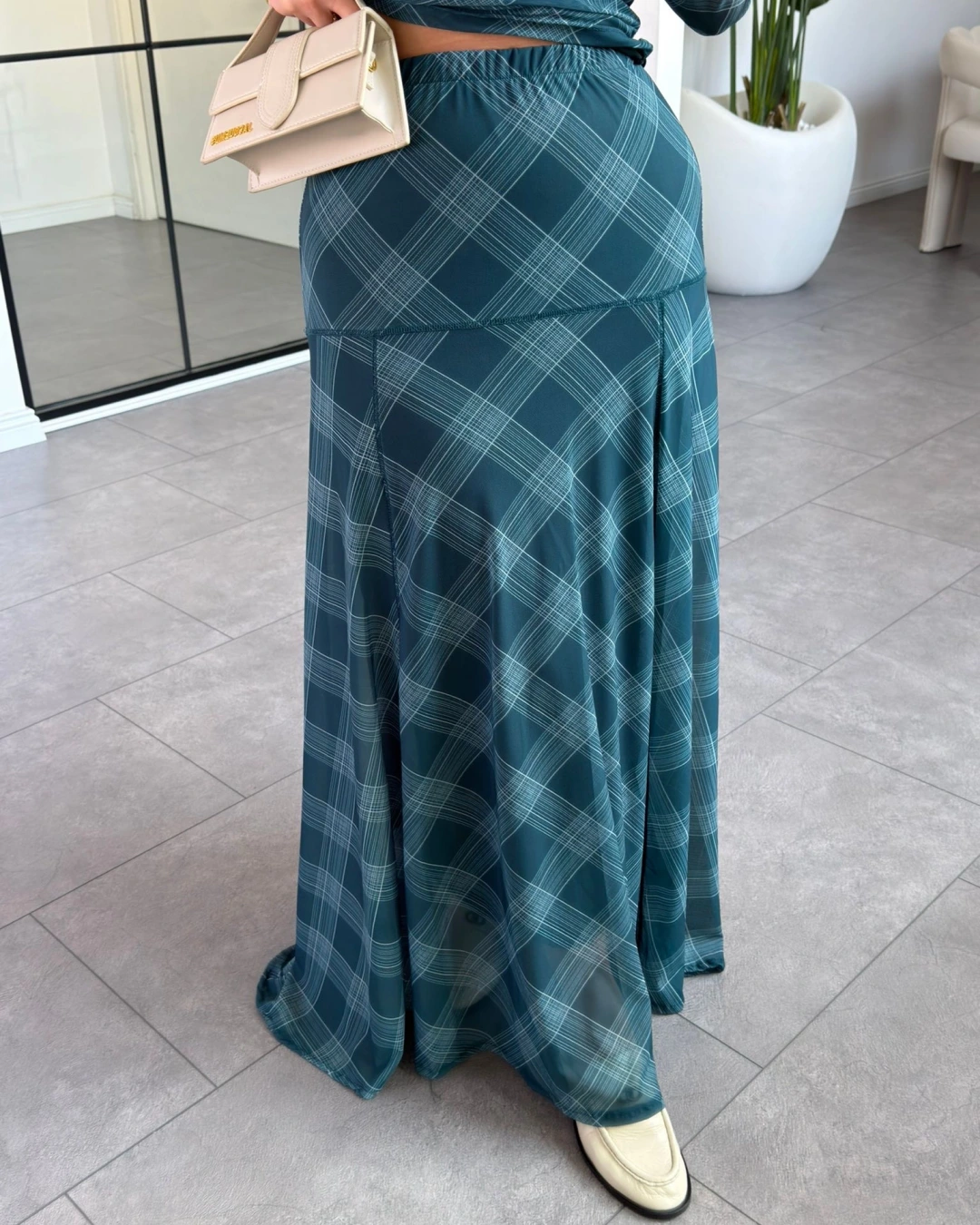 PETROL YEŞİLİ EKOSE DESEN BLUZ ETEK TAKIM 2095