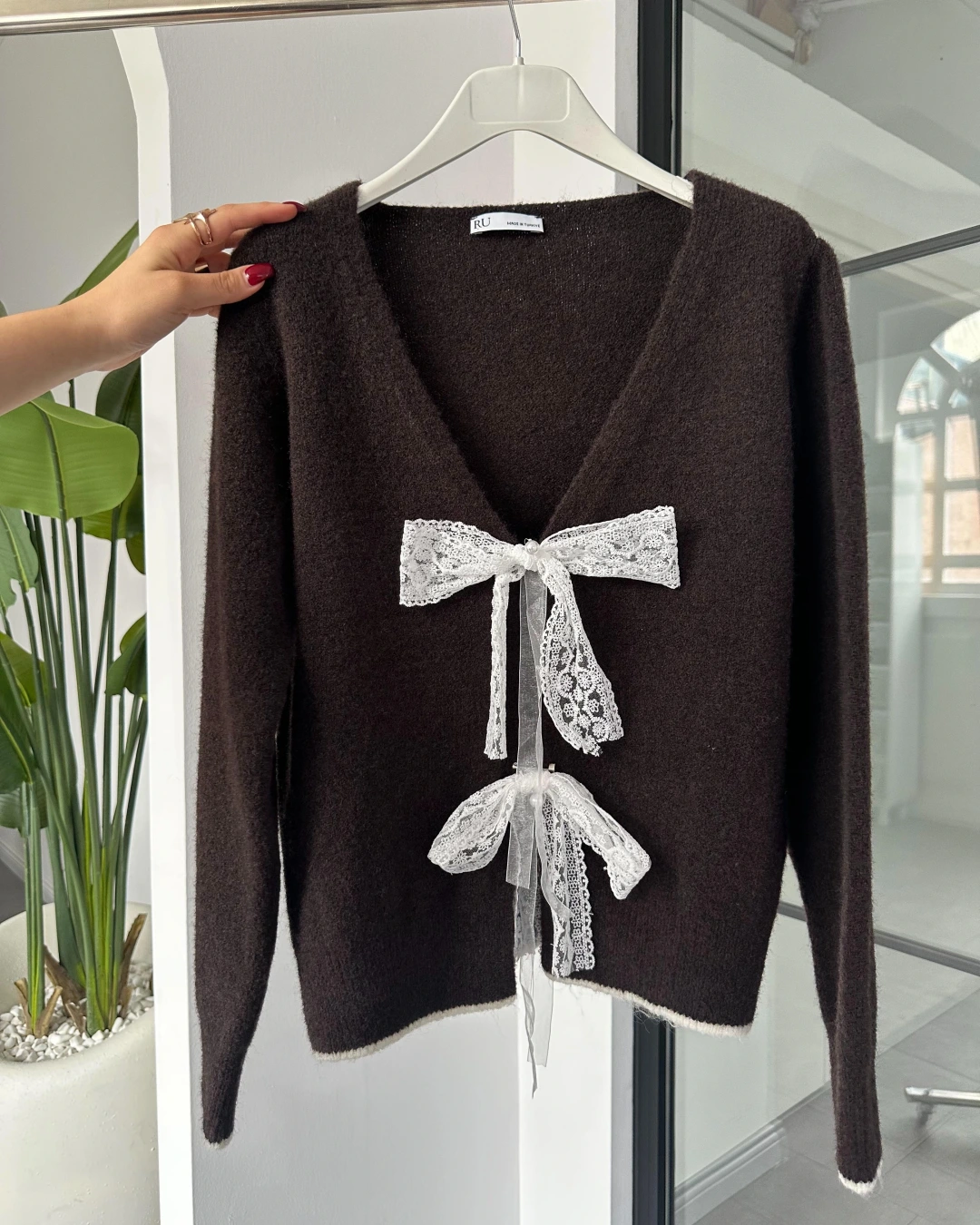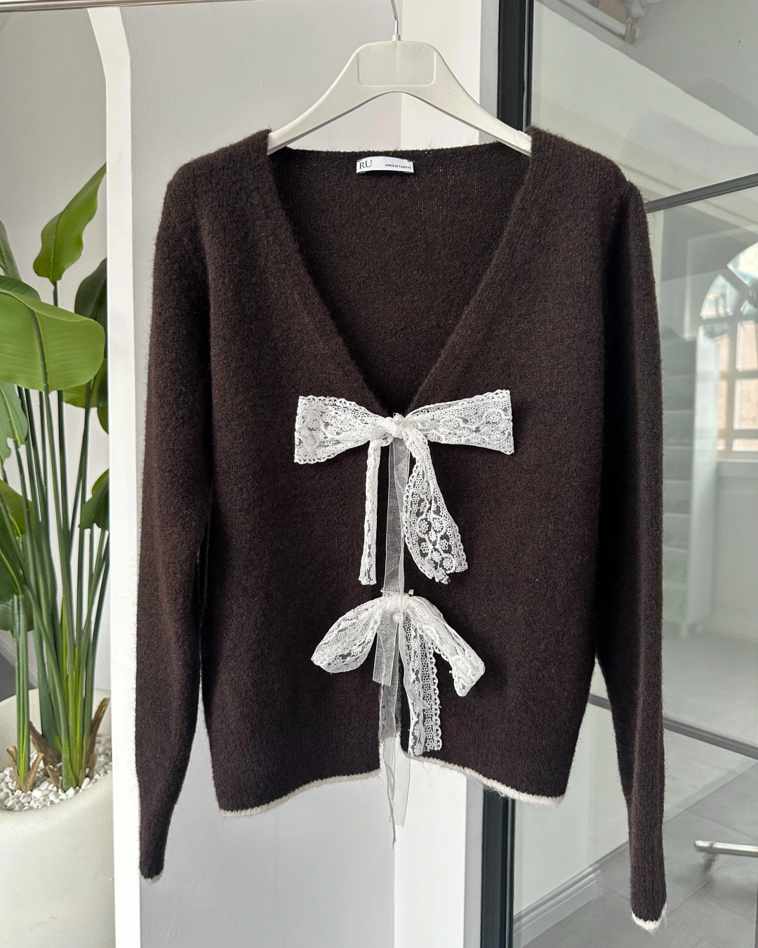 KAHVERENGİ FİYONK BROŞ DETAYLI HIRKA