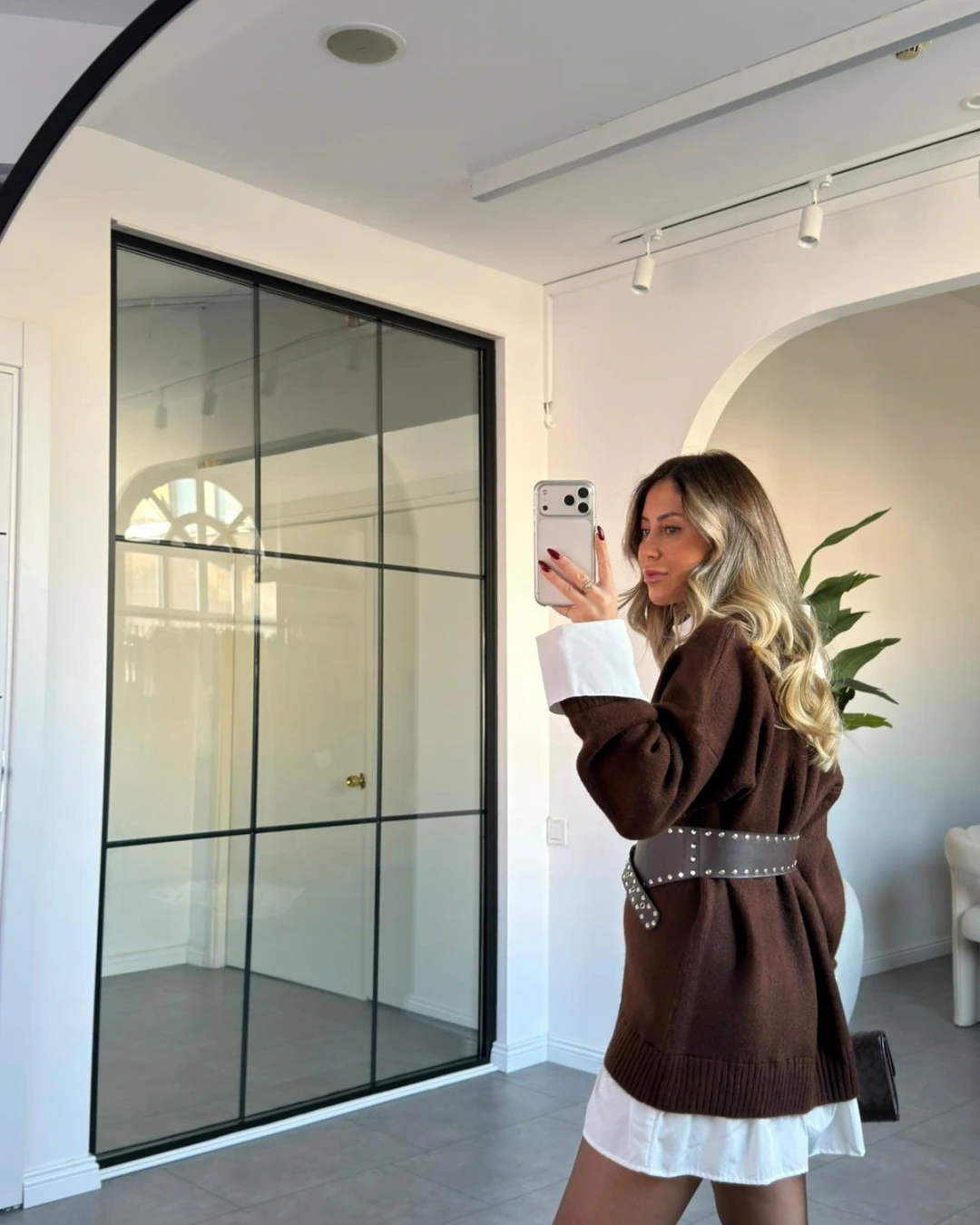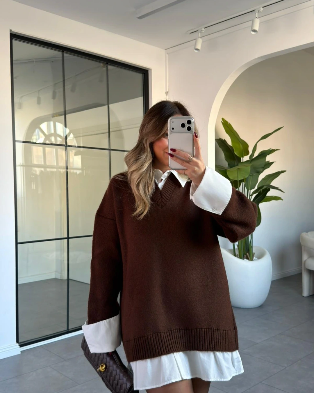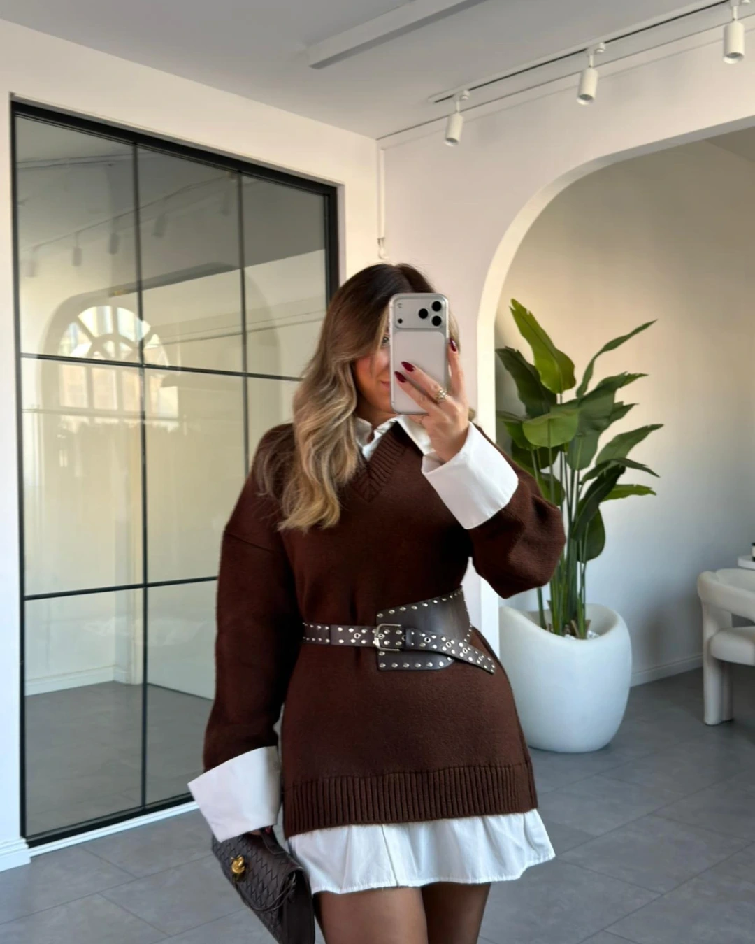 KAHVERENGİ GÖMLEK DETAY TRİKO ELBİSE