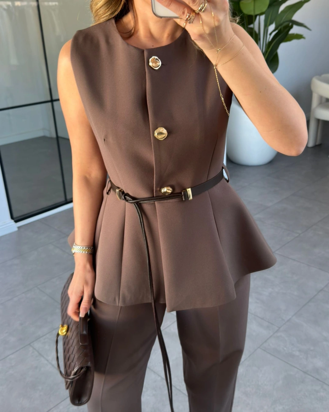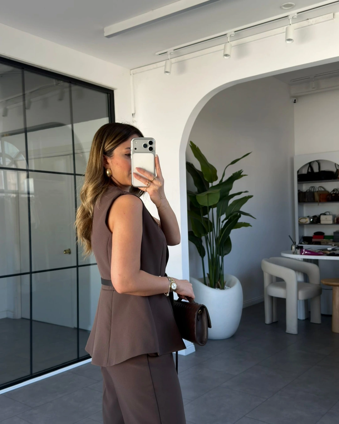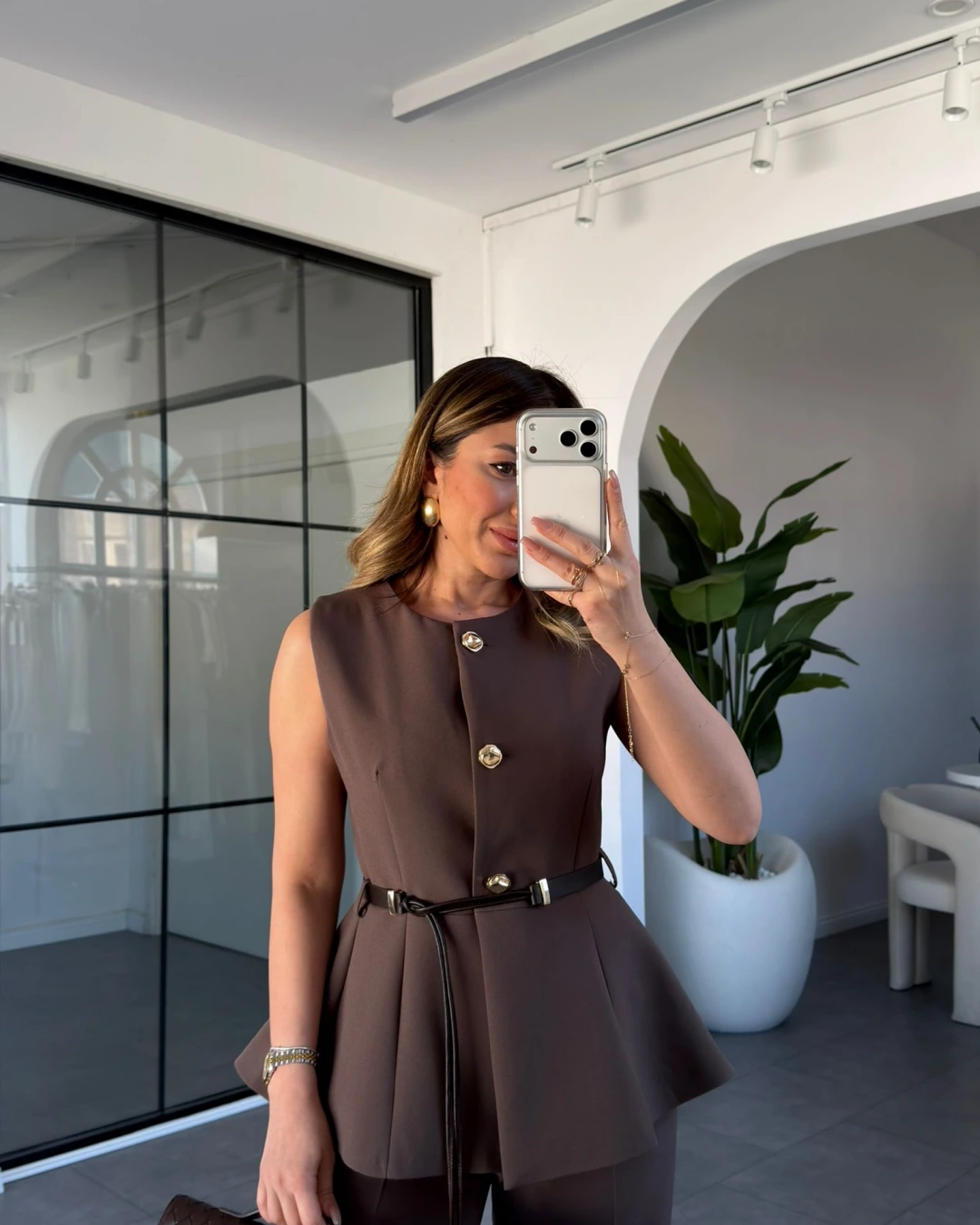 KAHVERENGİ KEMERLİ GOLD DÜĞMELİ YELEK 9682