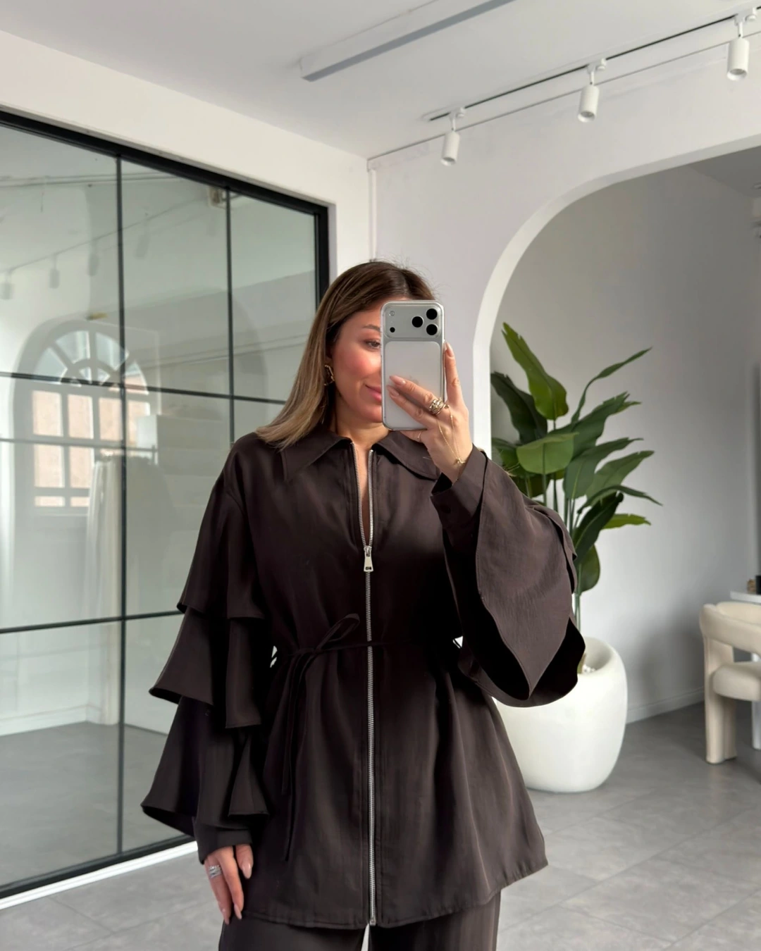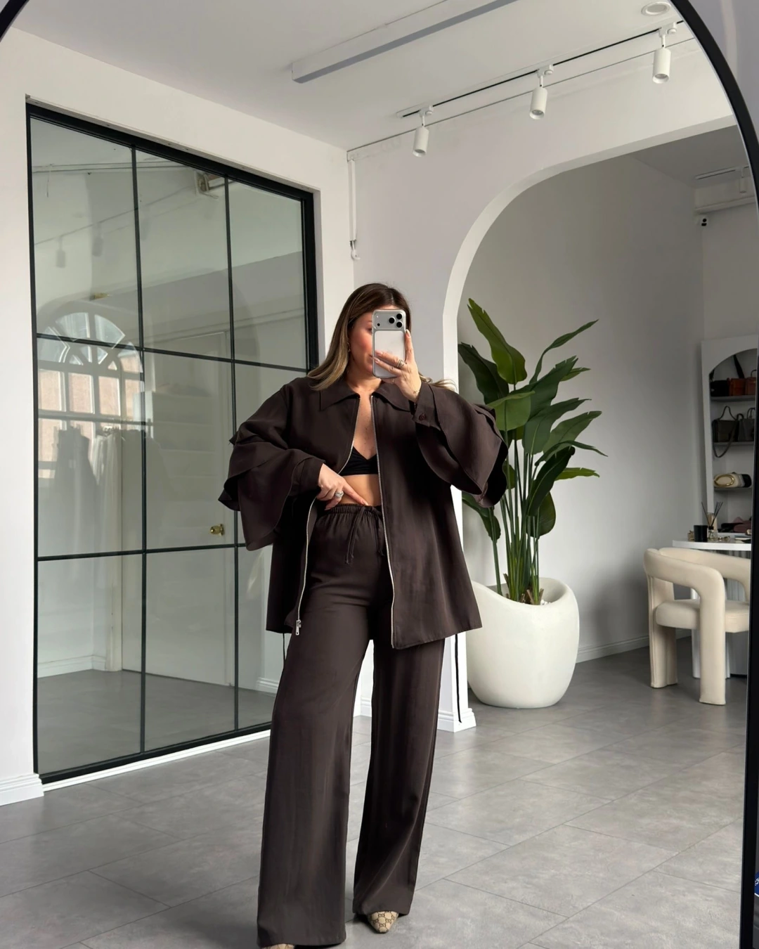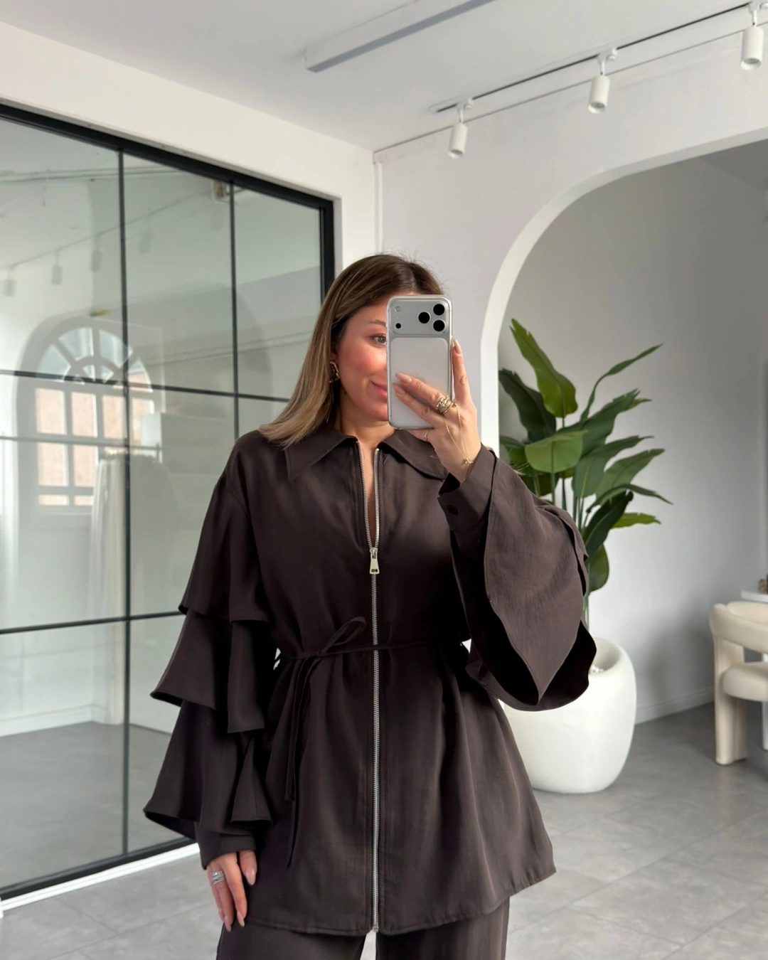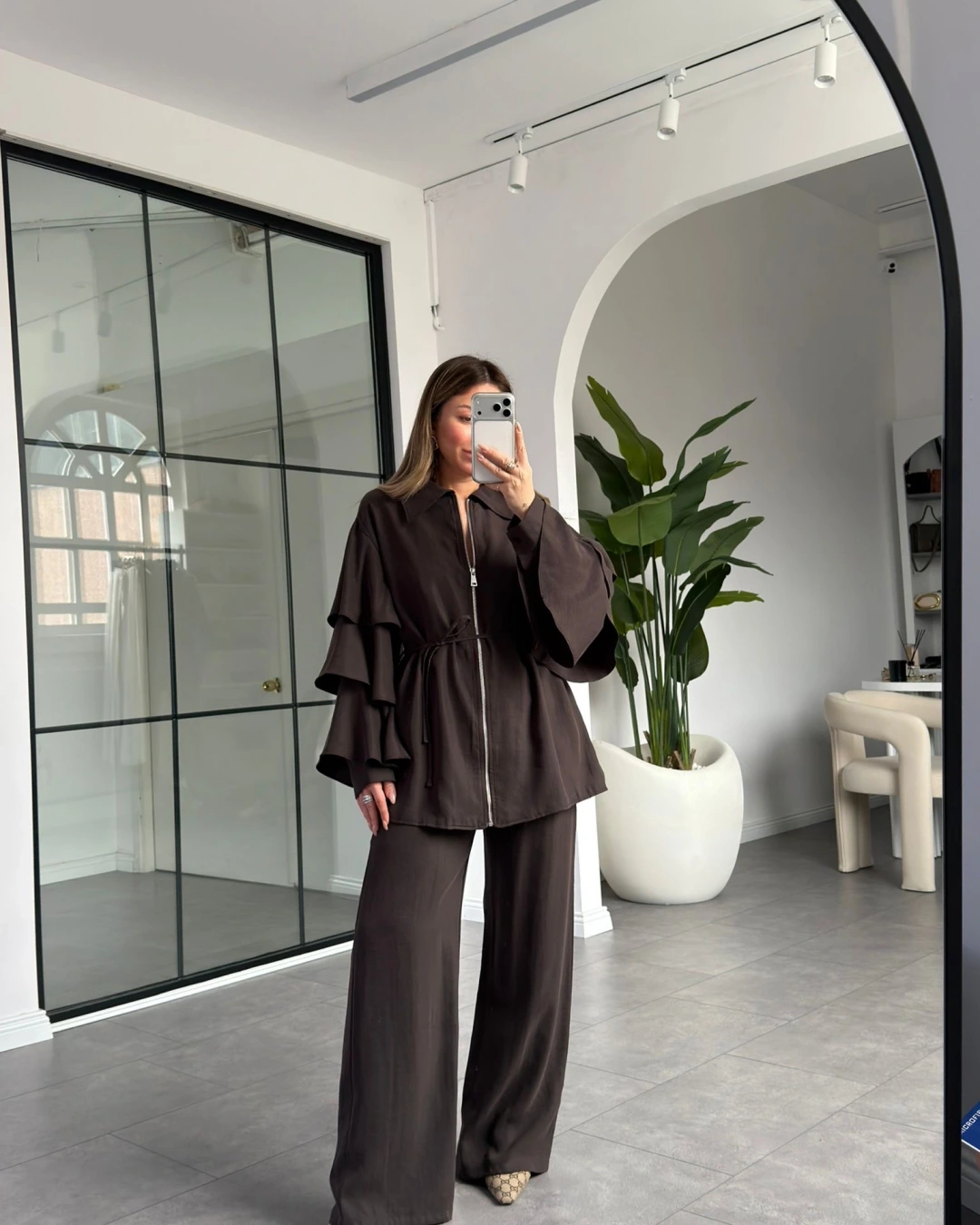 KAHVERENGİ KOLLARI VOLANLI BLUZ PANTOLON TAKIM