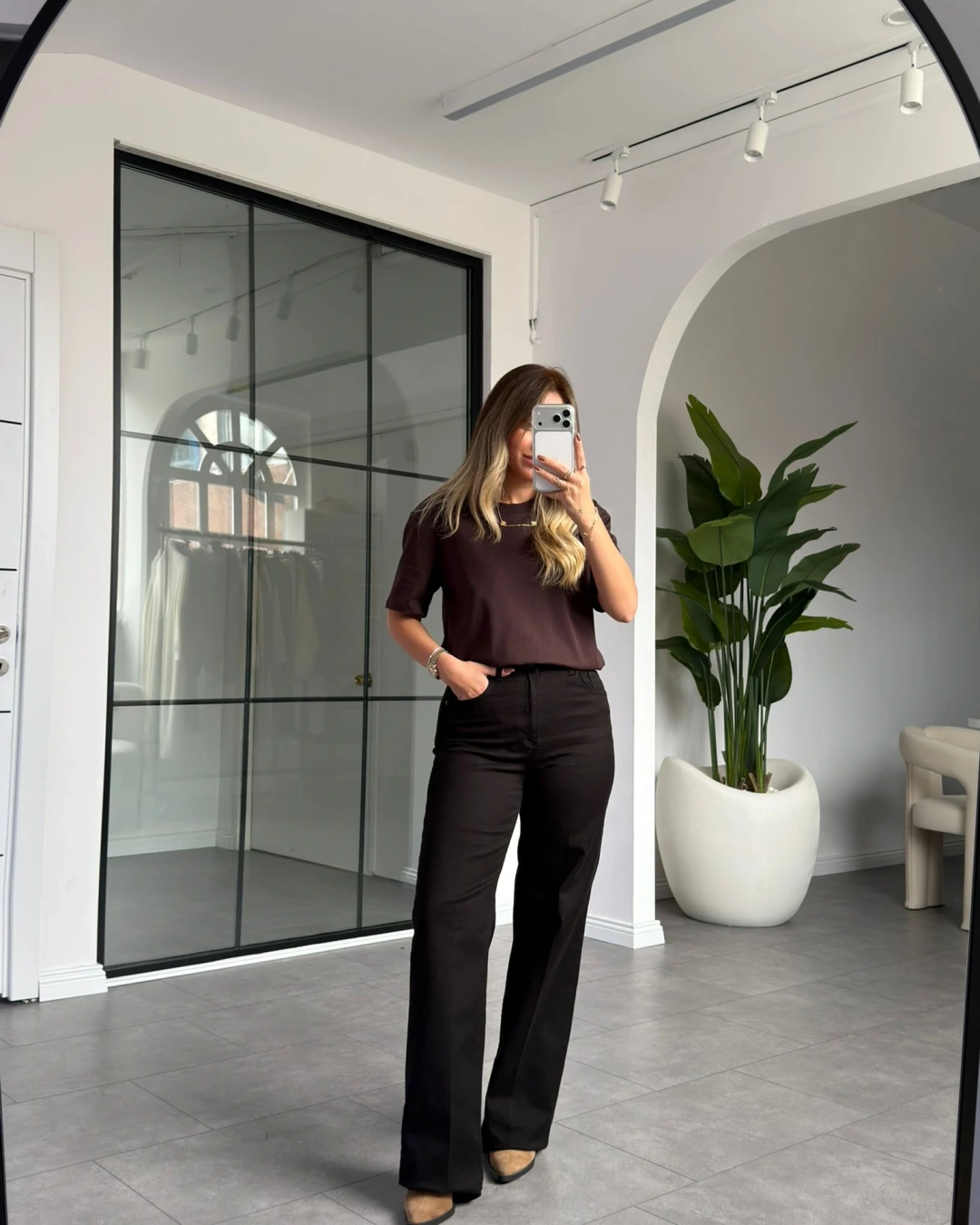 Kahverengi Marka Model Dekoratif Dikişli Pamuklu T-Shirt