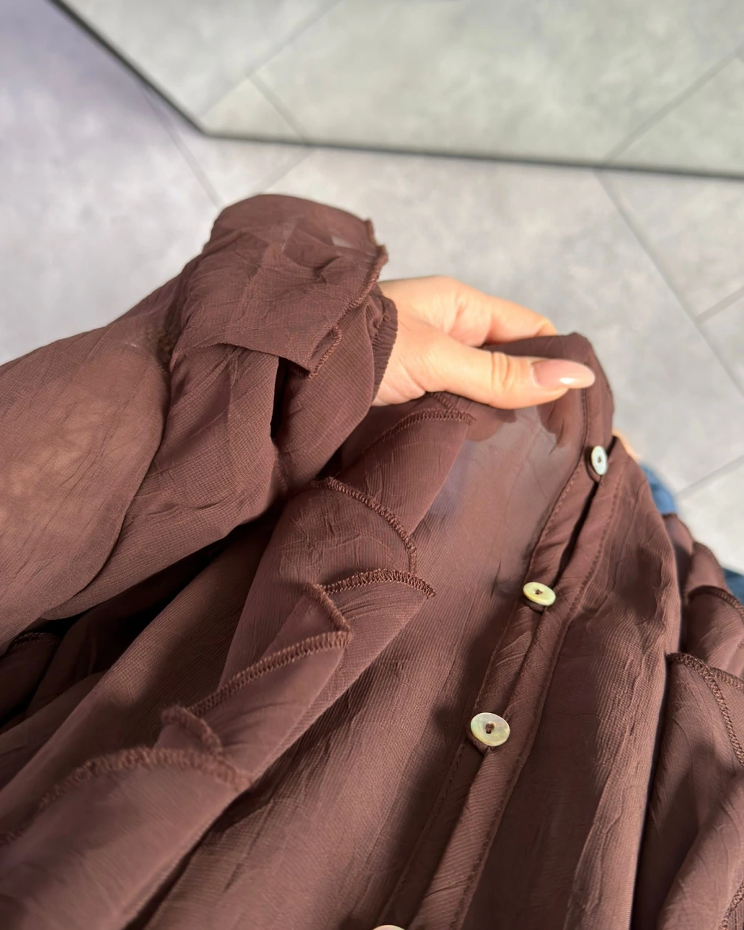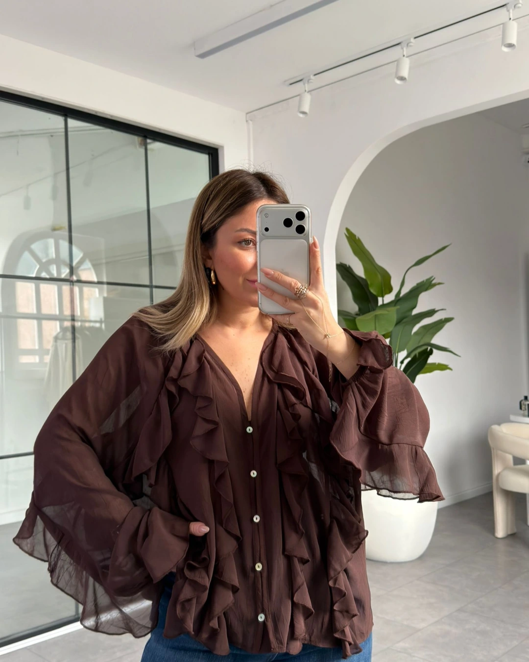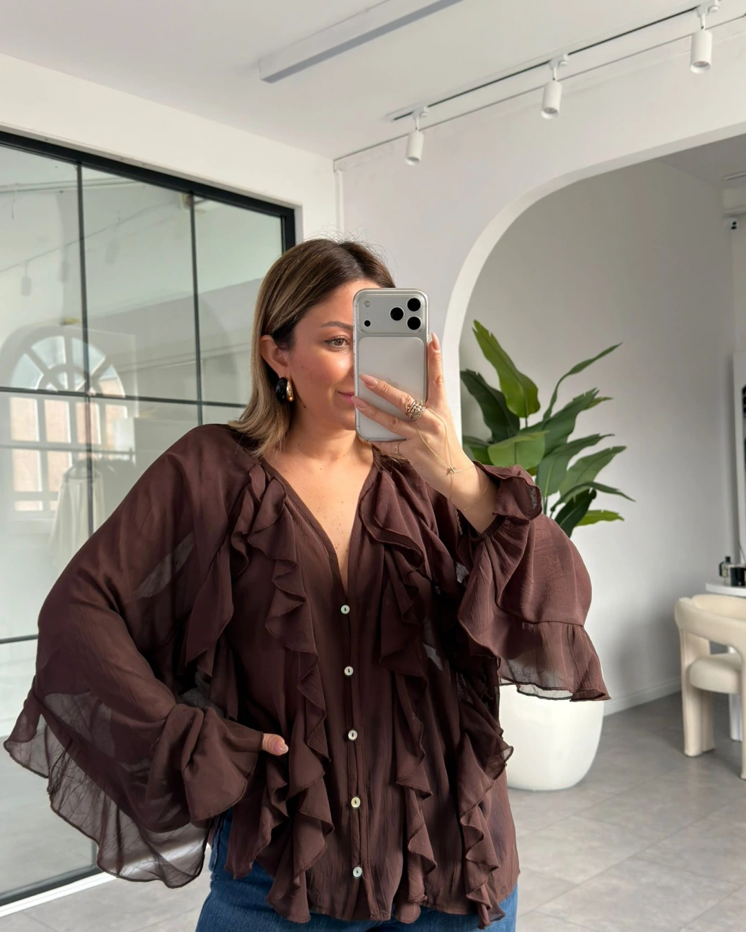 KAHVERENGİ V YAKA FIRFIR DETAY ŞİFON BLUZ