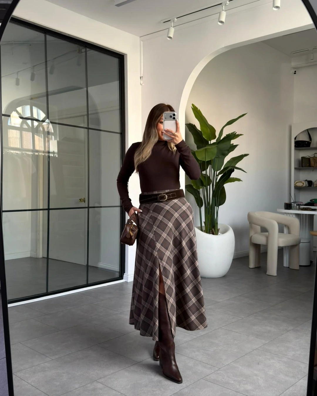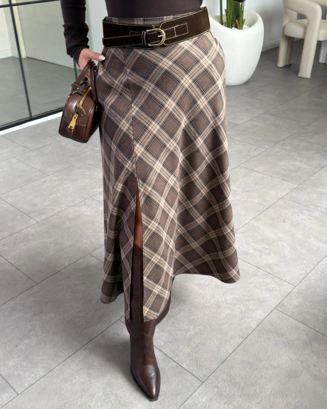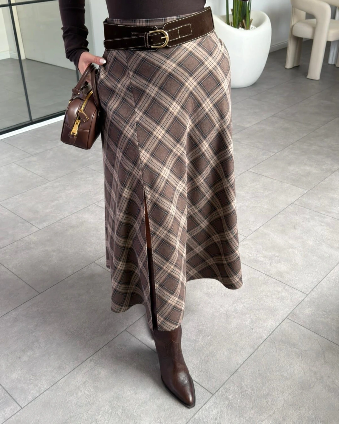 KAHVERENGİ YIRTMAÇ DETAY KEMERLİ EKOSE ETEK