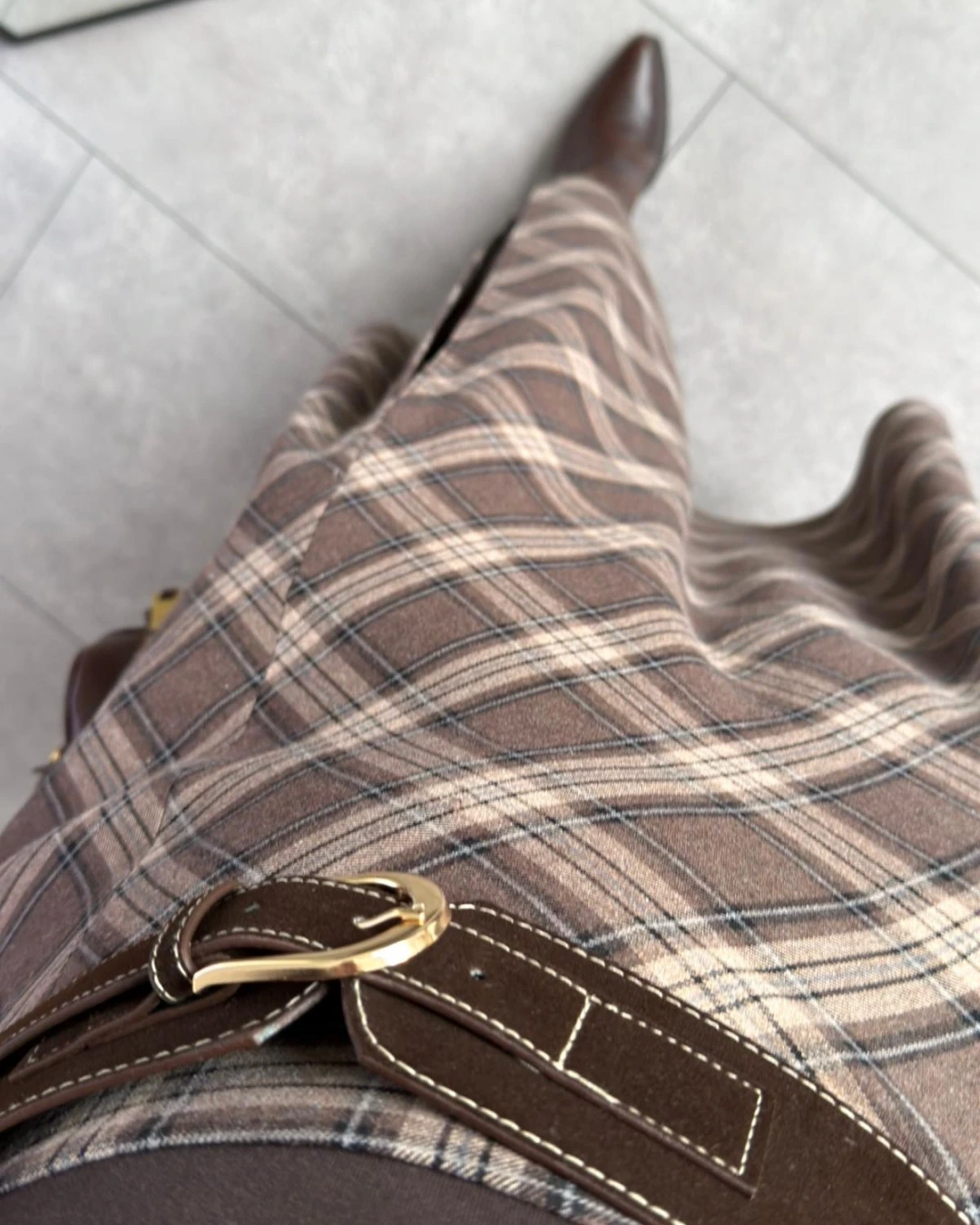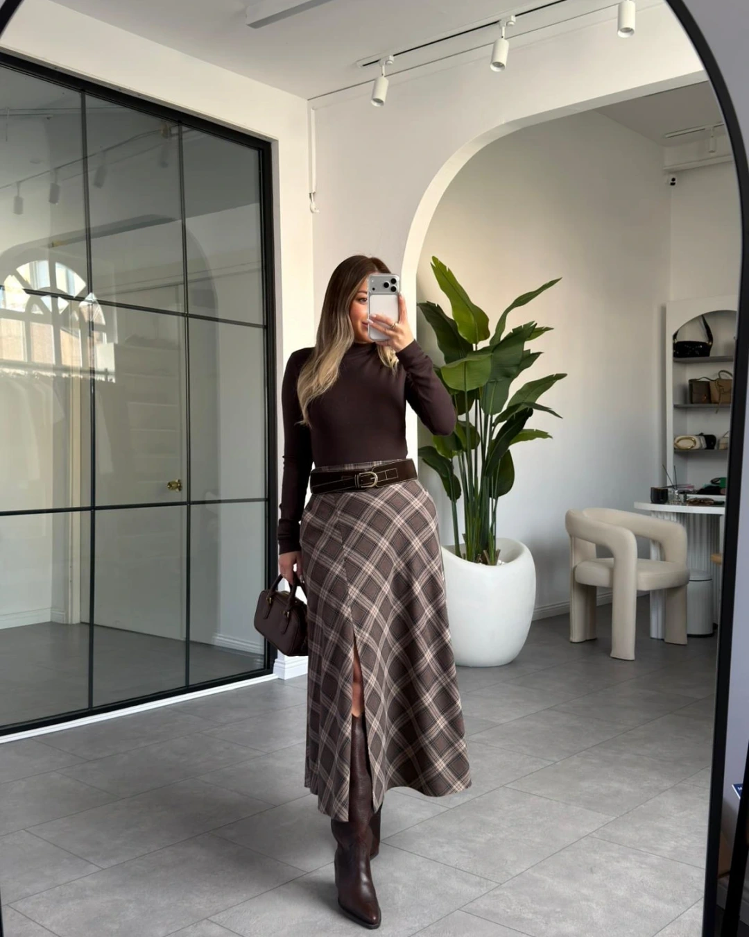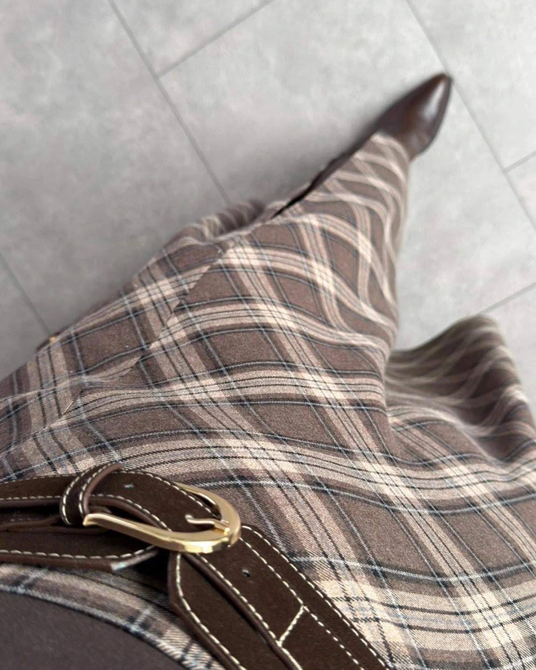 KAHVERENGİ YIRTMAÇ DETAY KEMERLİ EKOSE ETEK