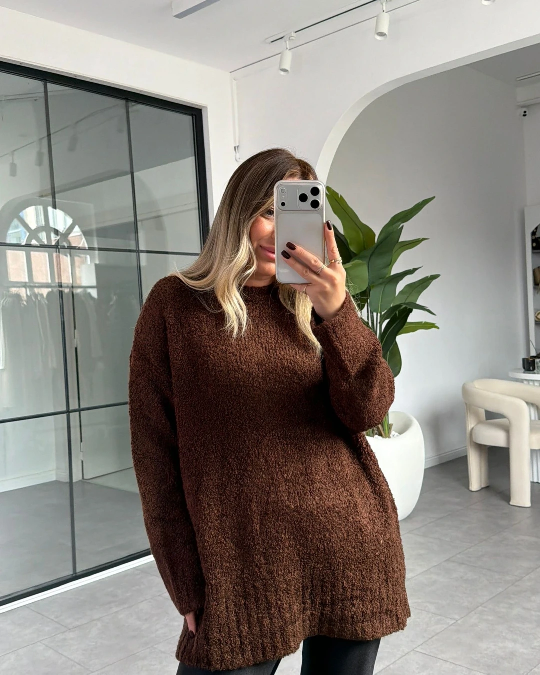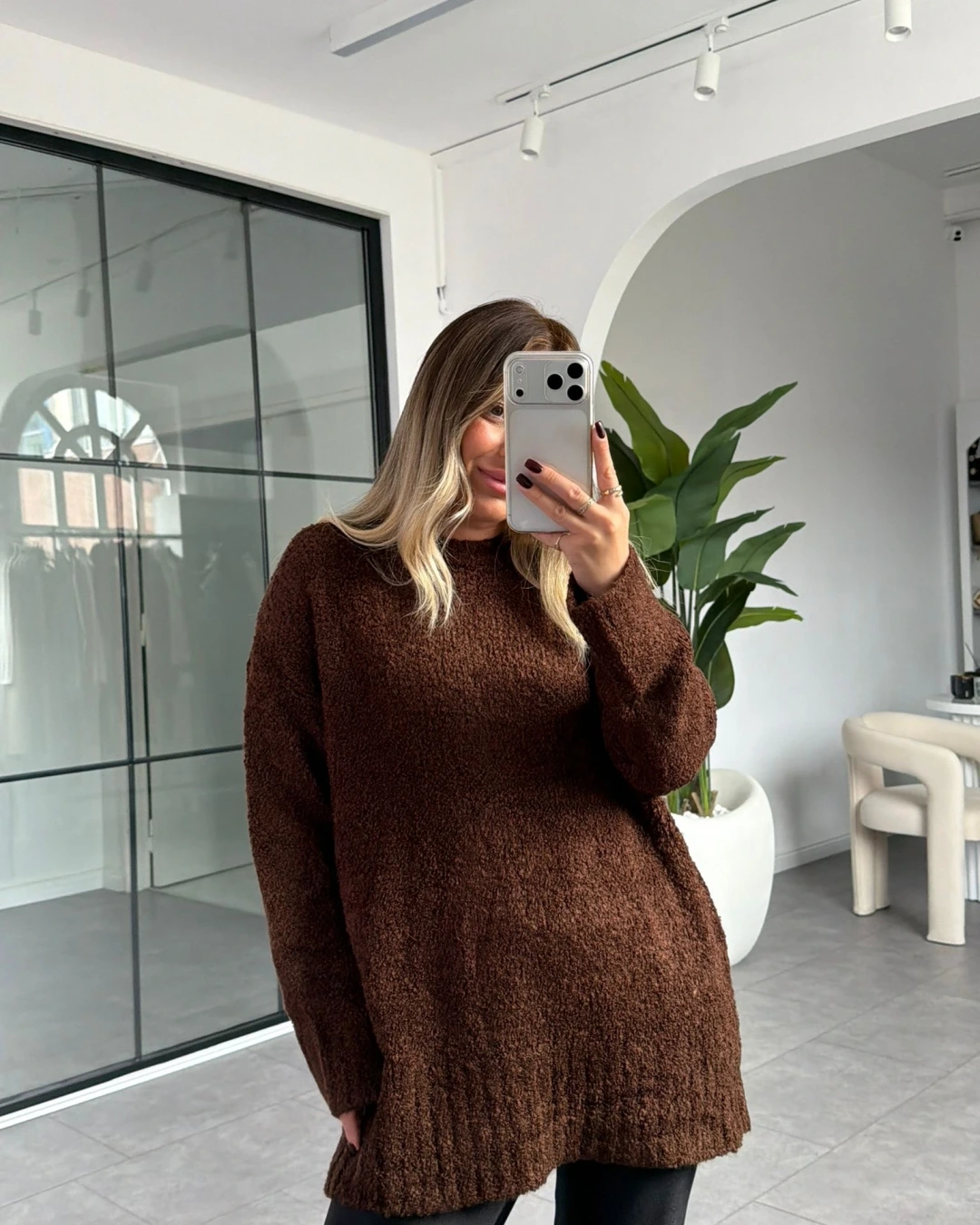 ACI KAHVE YUVARLAK YAKA SAÇ ÖRGÜ TRİKO KAZAK