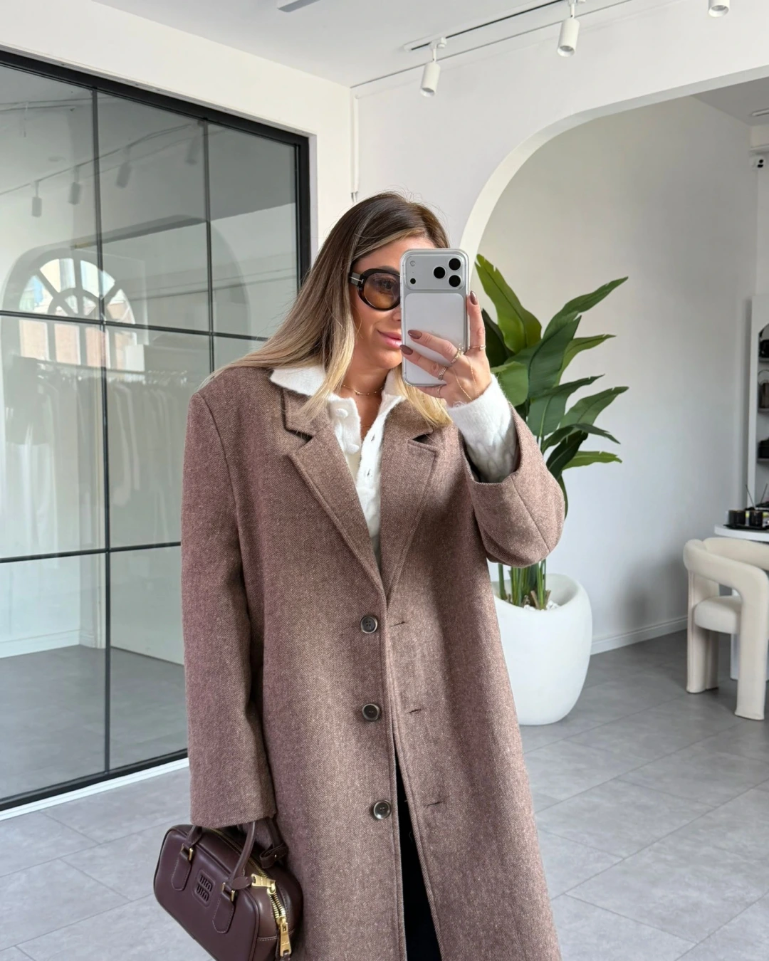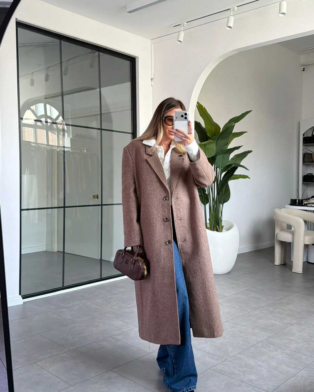 KARAMEL BALIK SIRTI DÜĞMELİ UZUN KABAN