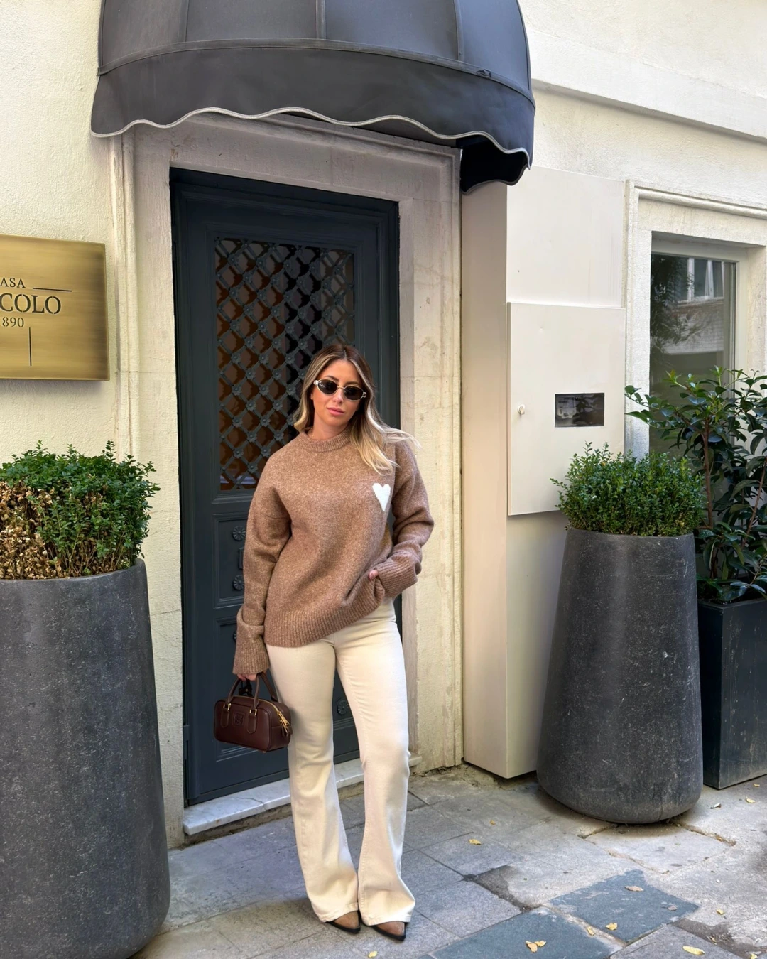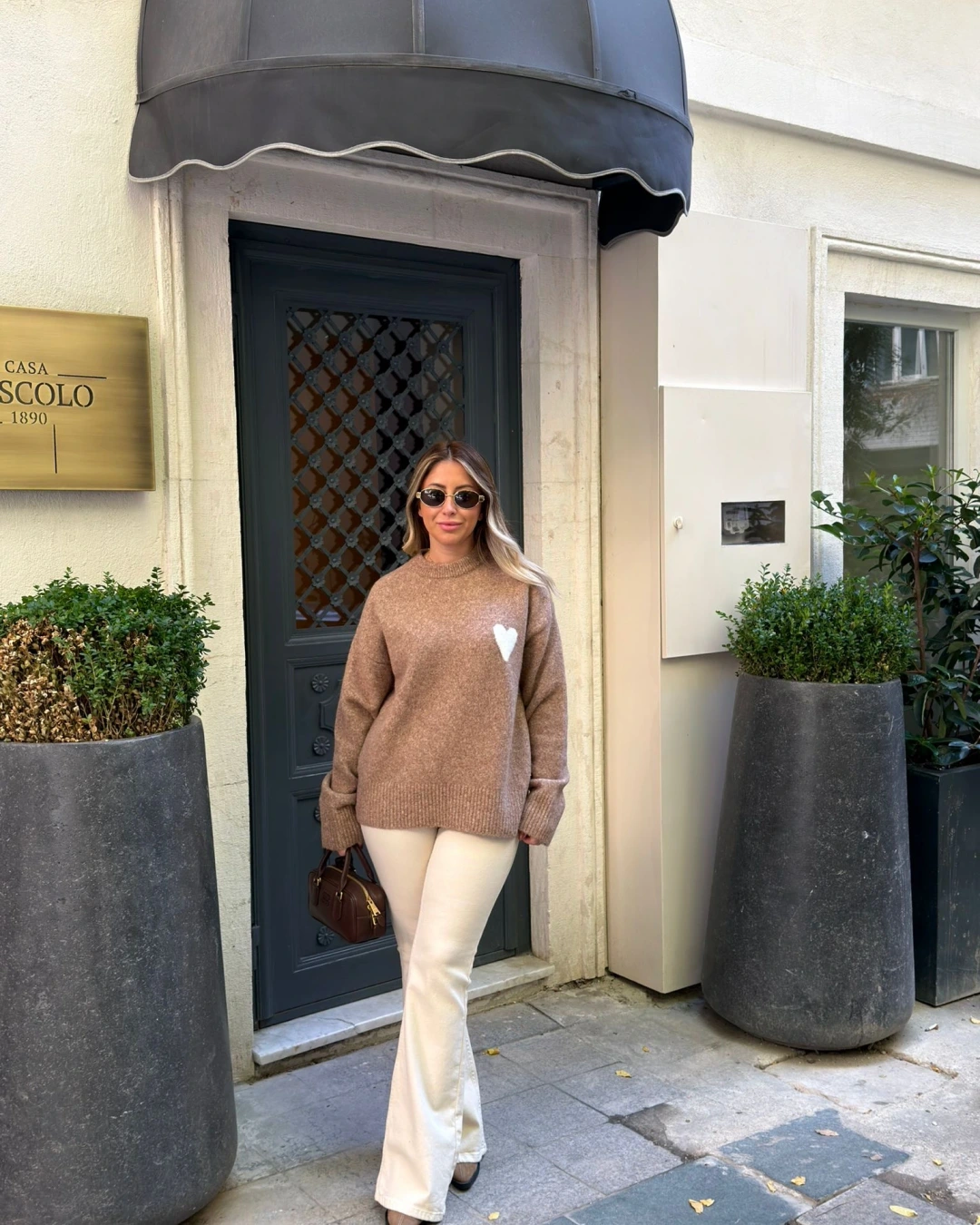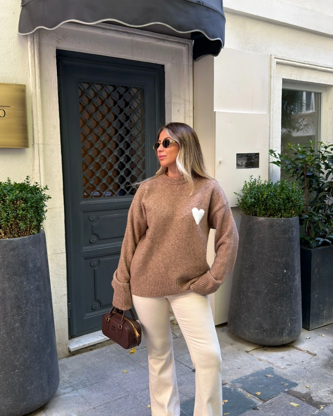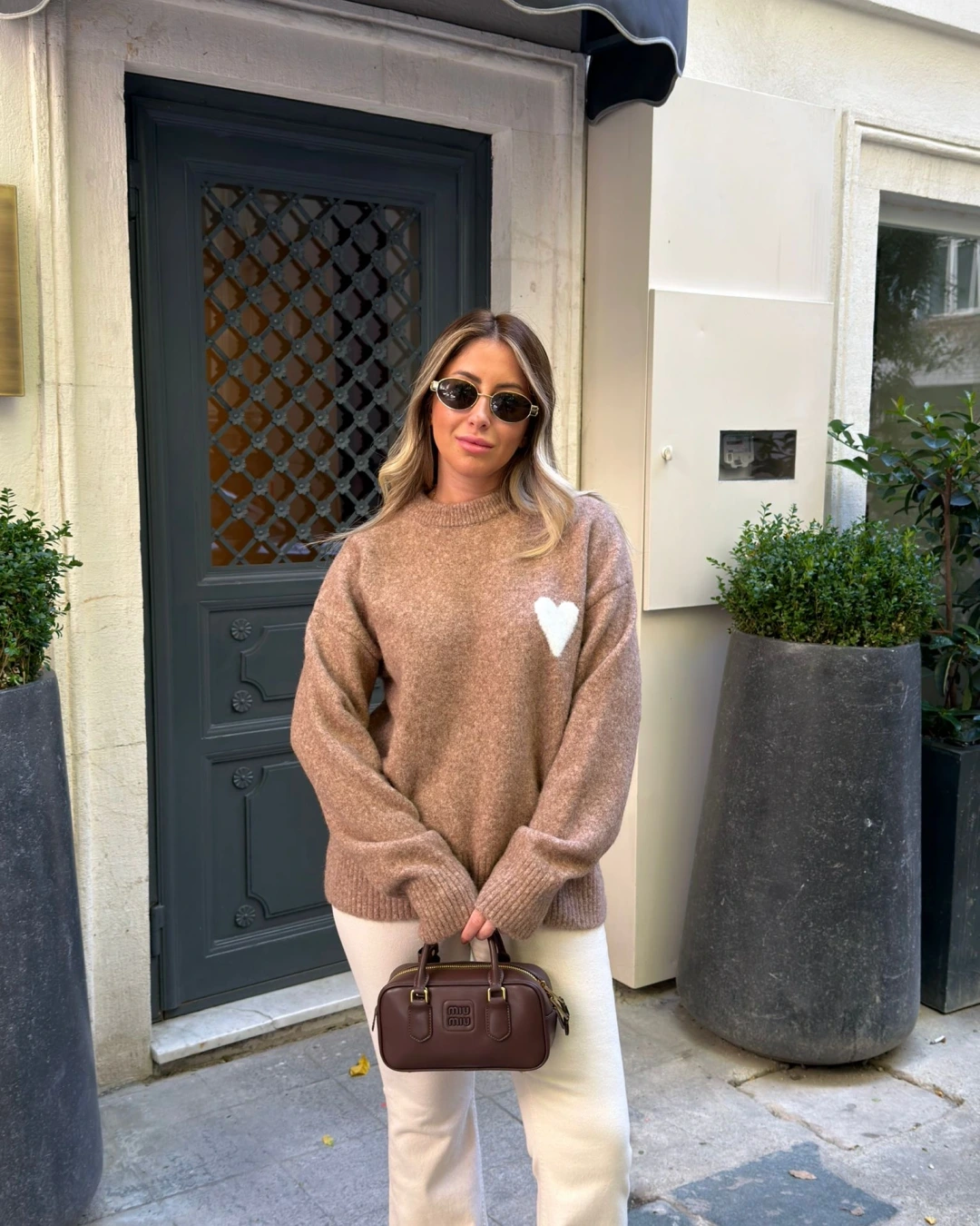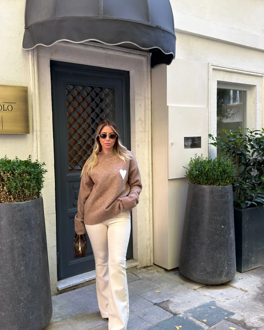 KOYU BEJ YUMUŞAK DOKULU KALPLİ TRİKO KAZAK