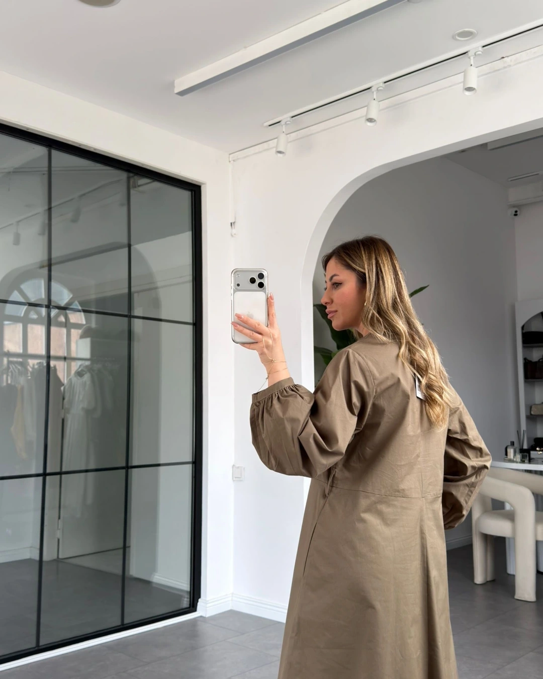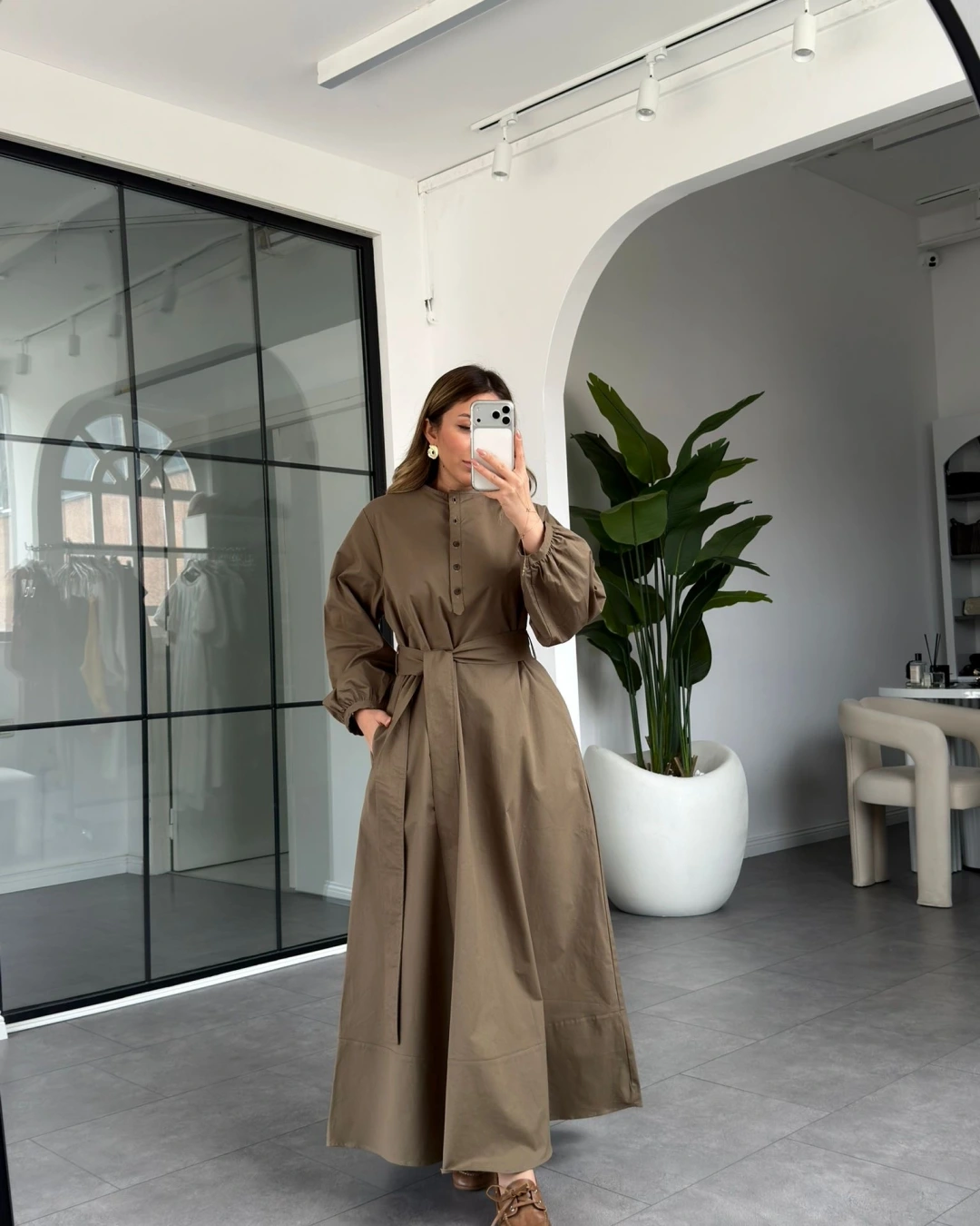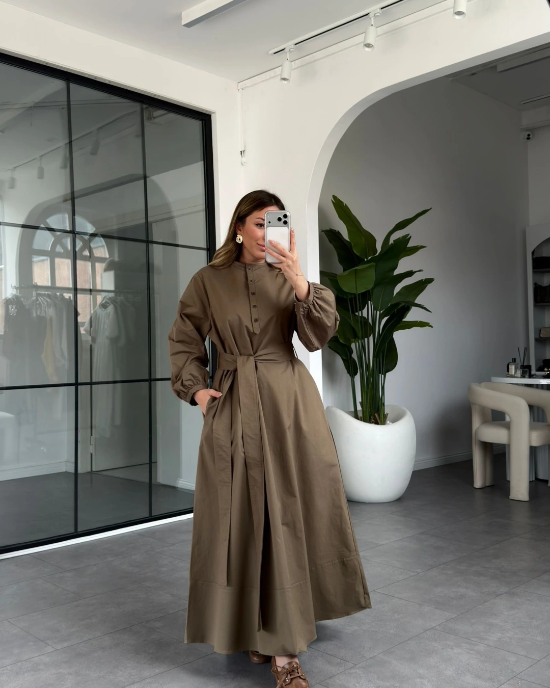 KOYU HAKİ KUŞAKLI UZUN ELBİSE 2349