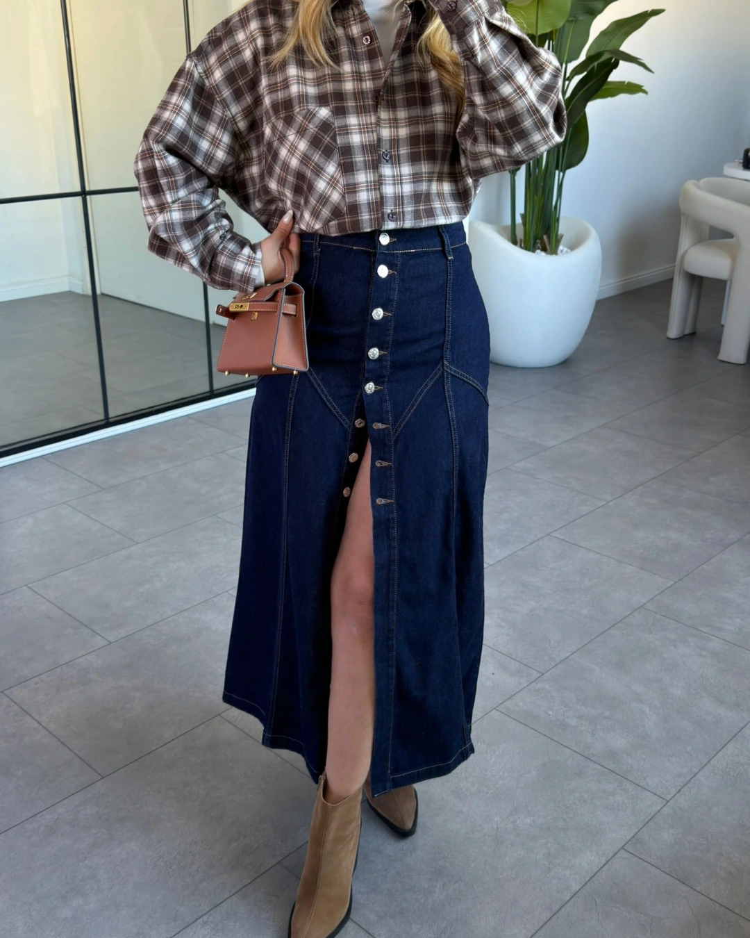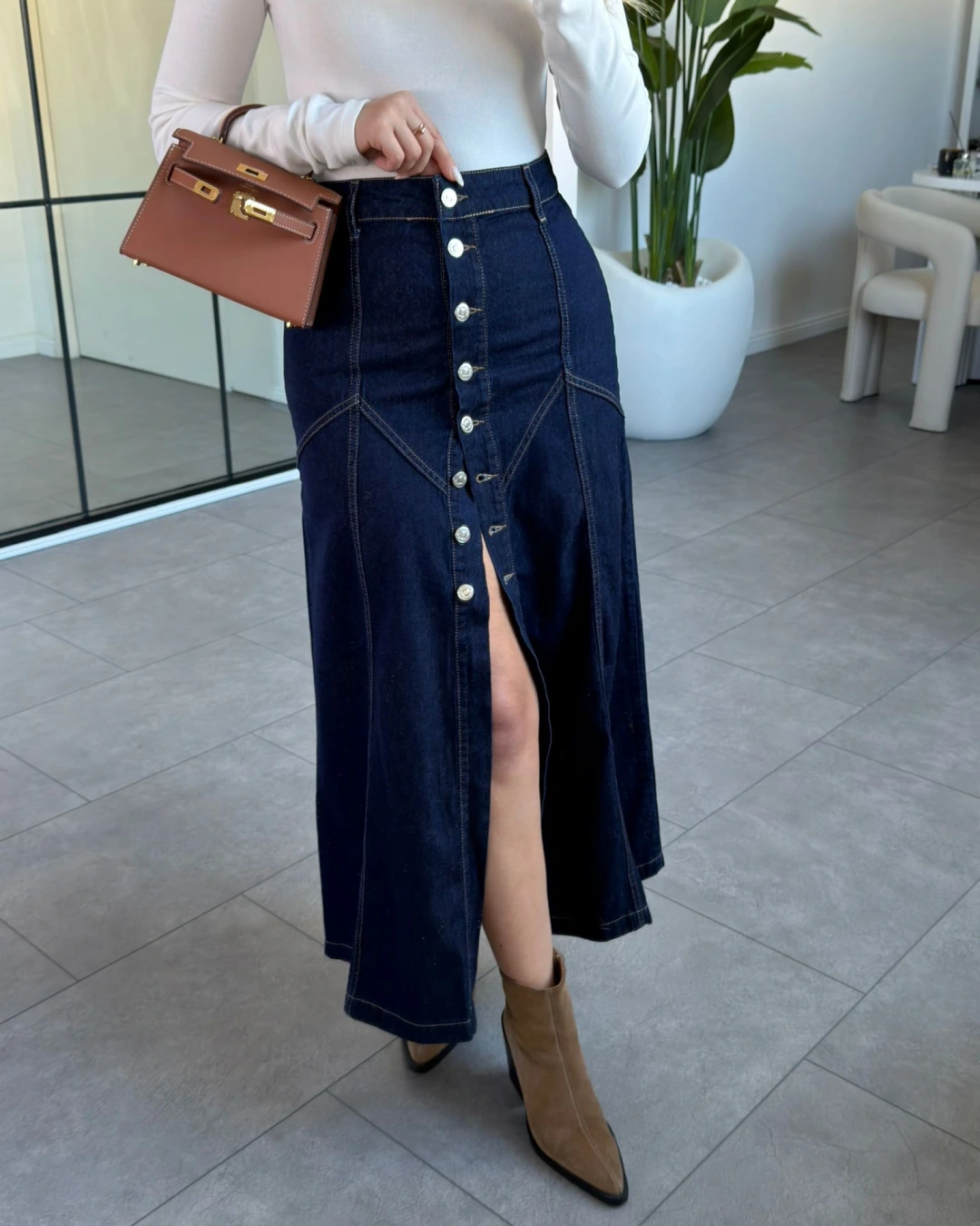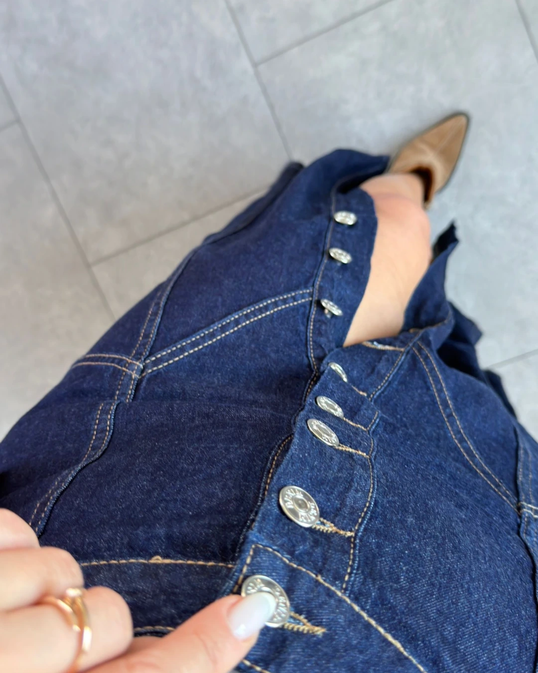 Koyu Mavi Düğmeli Yırtmaçlı Jean Etek