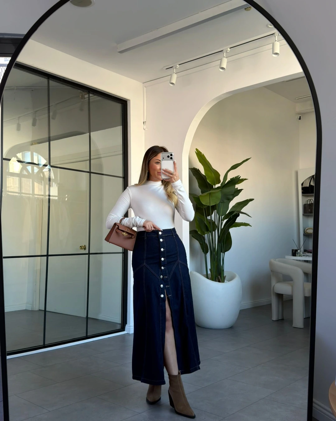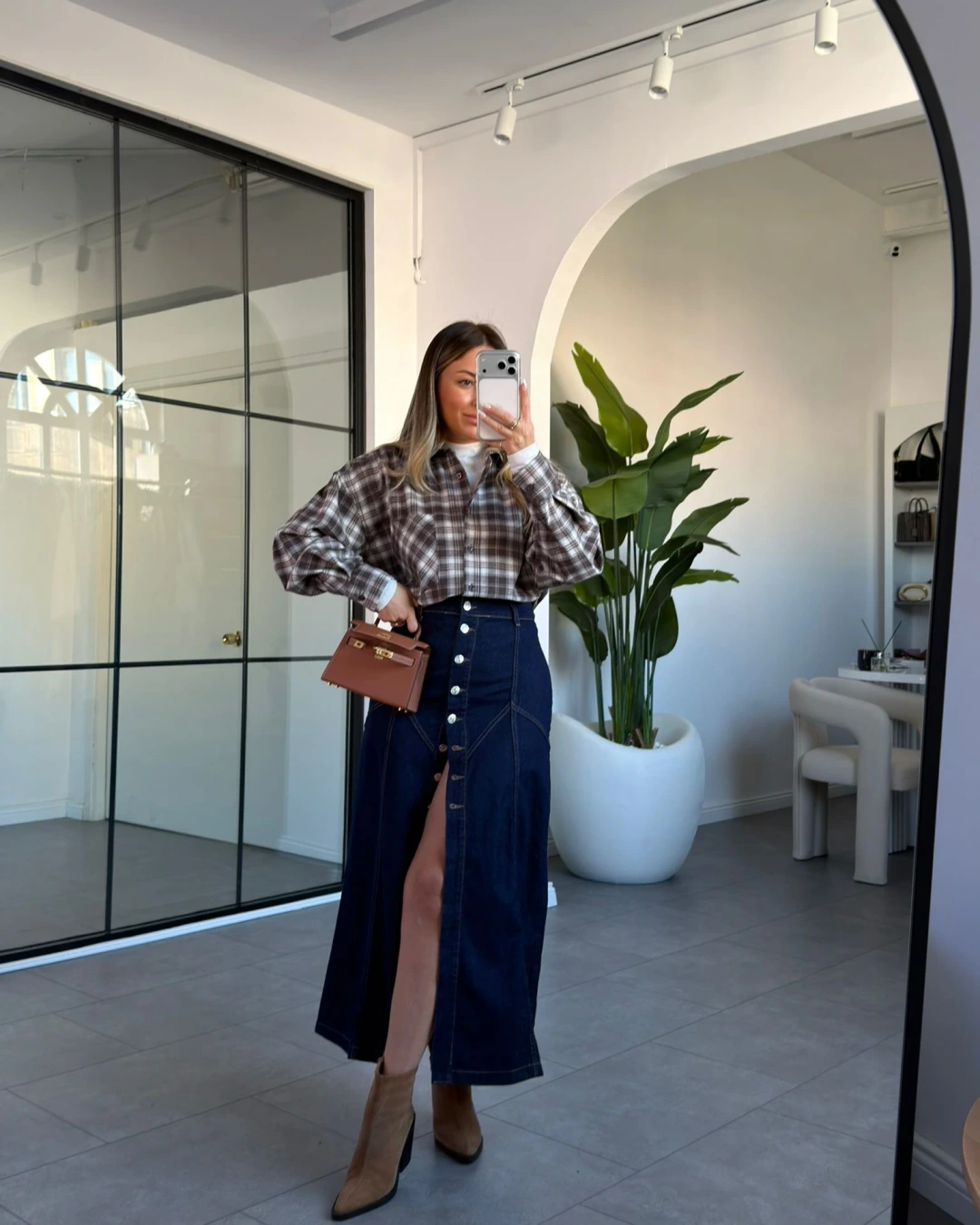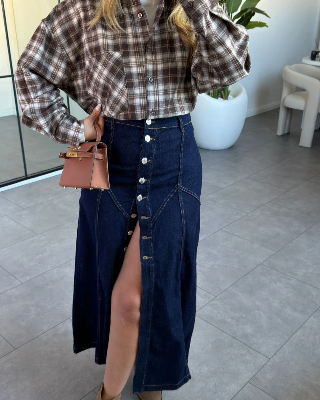 Koyu Mavi Düğmeli Yırtmaçlı Jean Etek