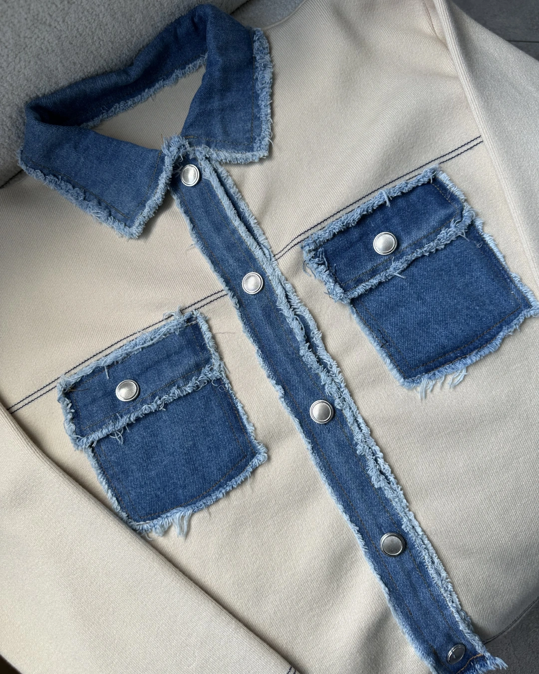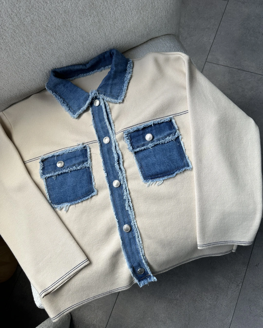KREM DENİM DETAYLI ÇELİK TRİKO HIRKA