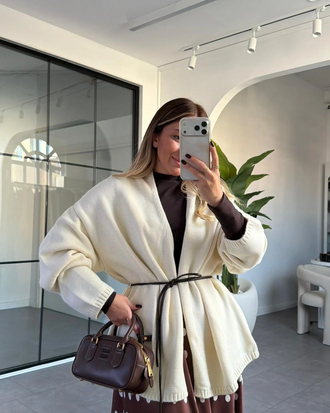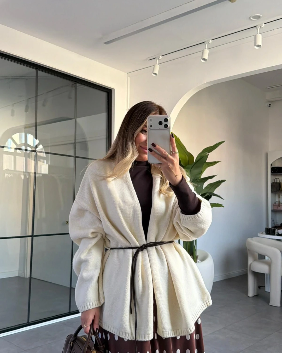 KREM DERİ KEMER DETAY TRİKO HIRKA