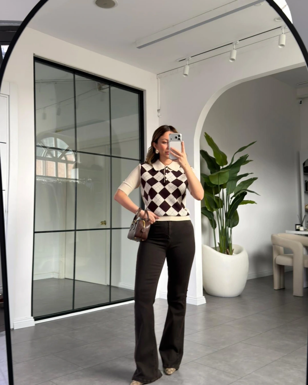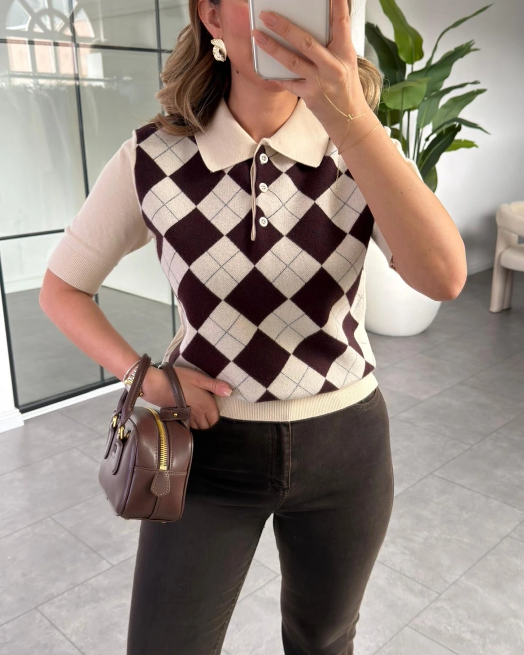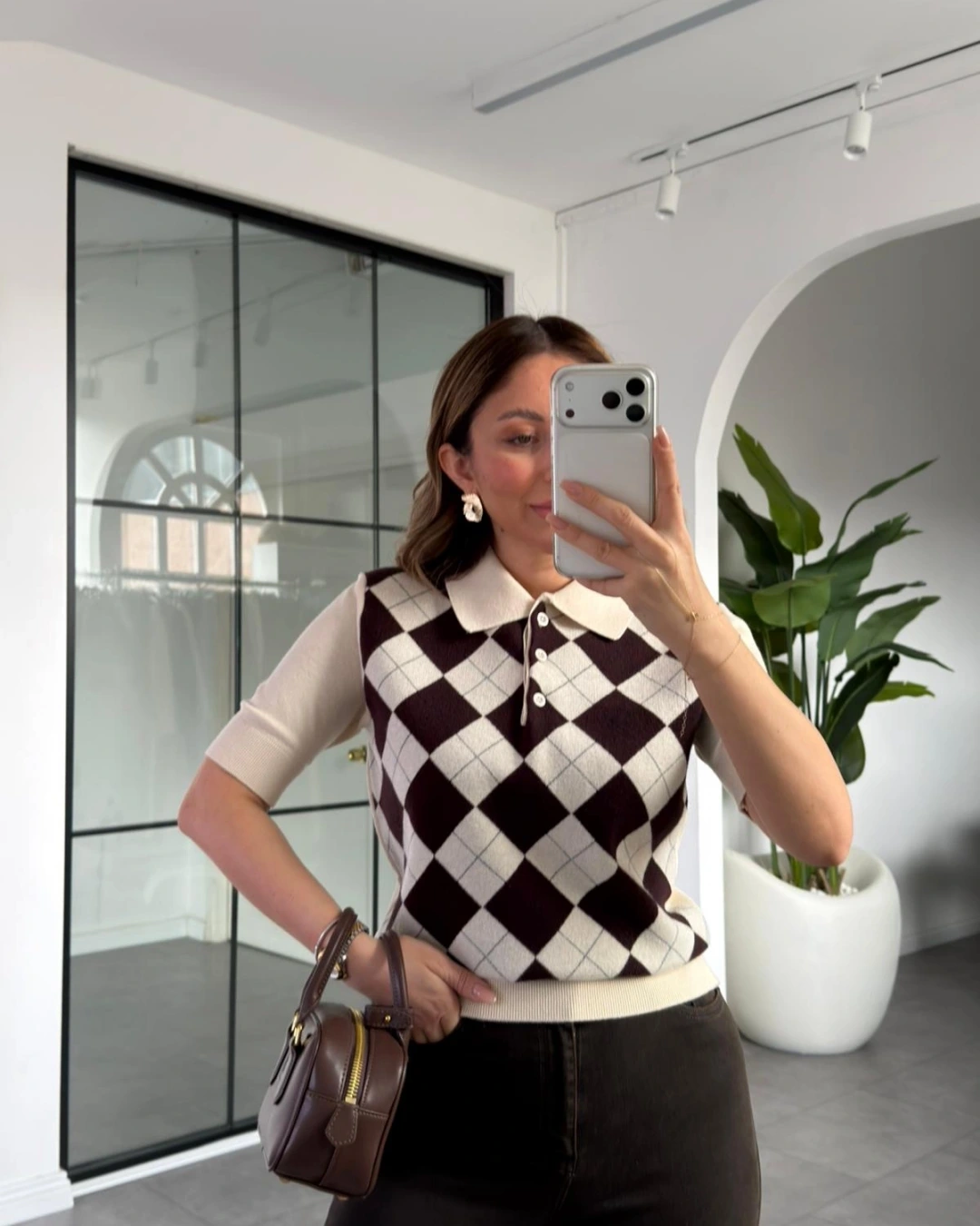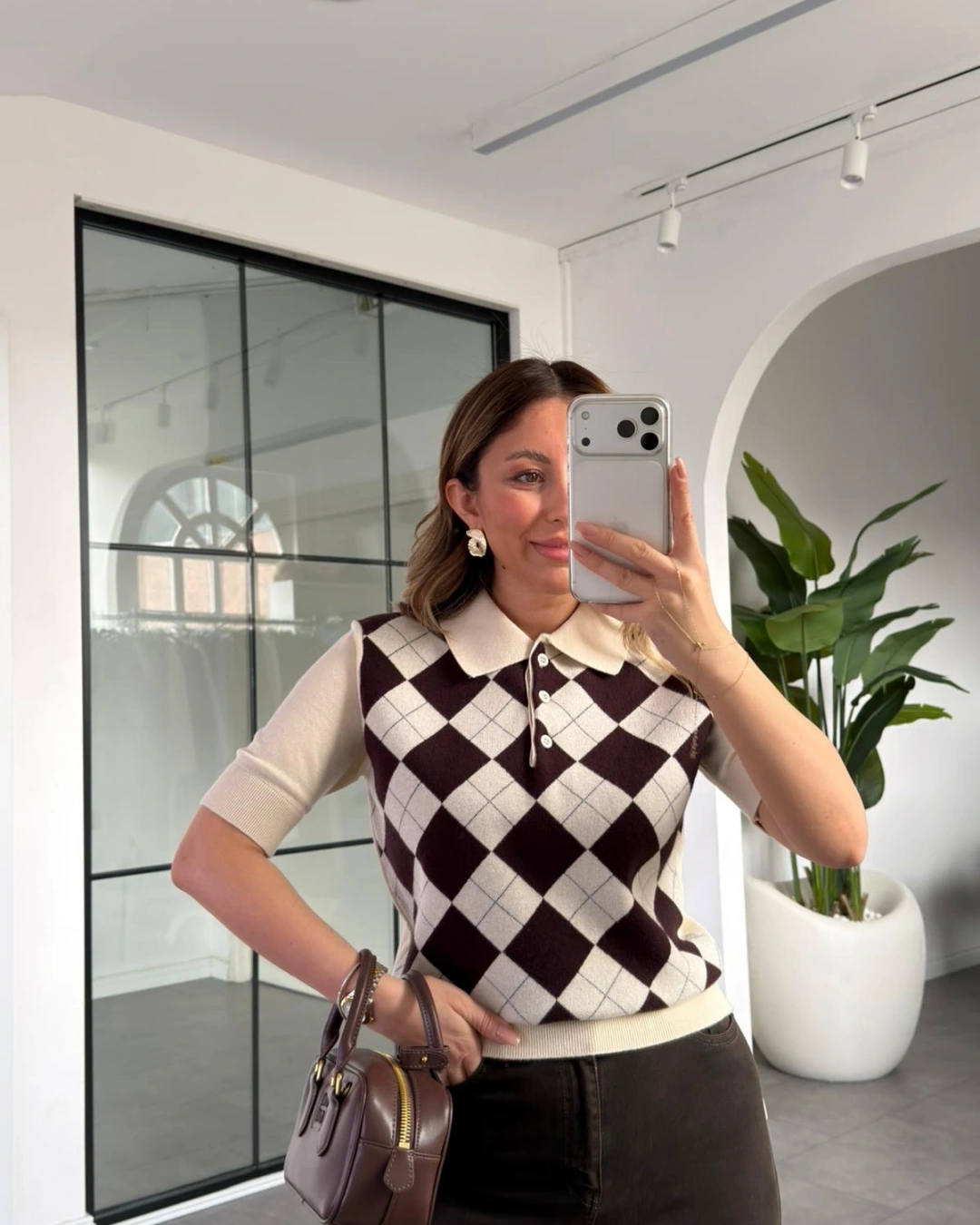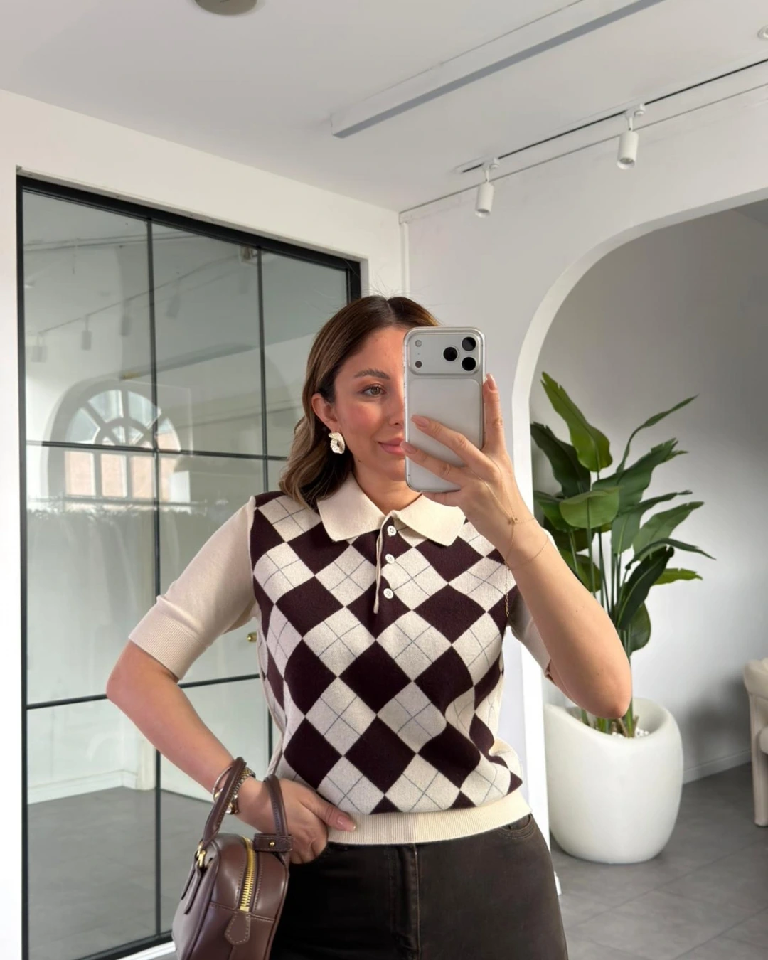 KREM KAHVE BAKLAVA DESEN KISA KOL TRİKO