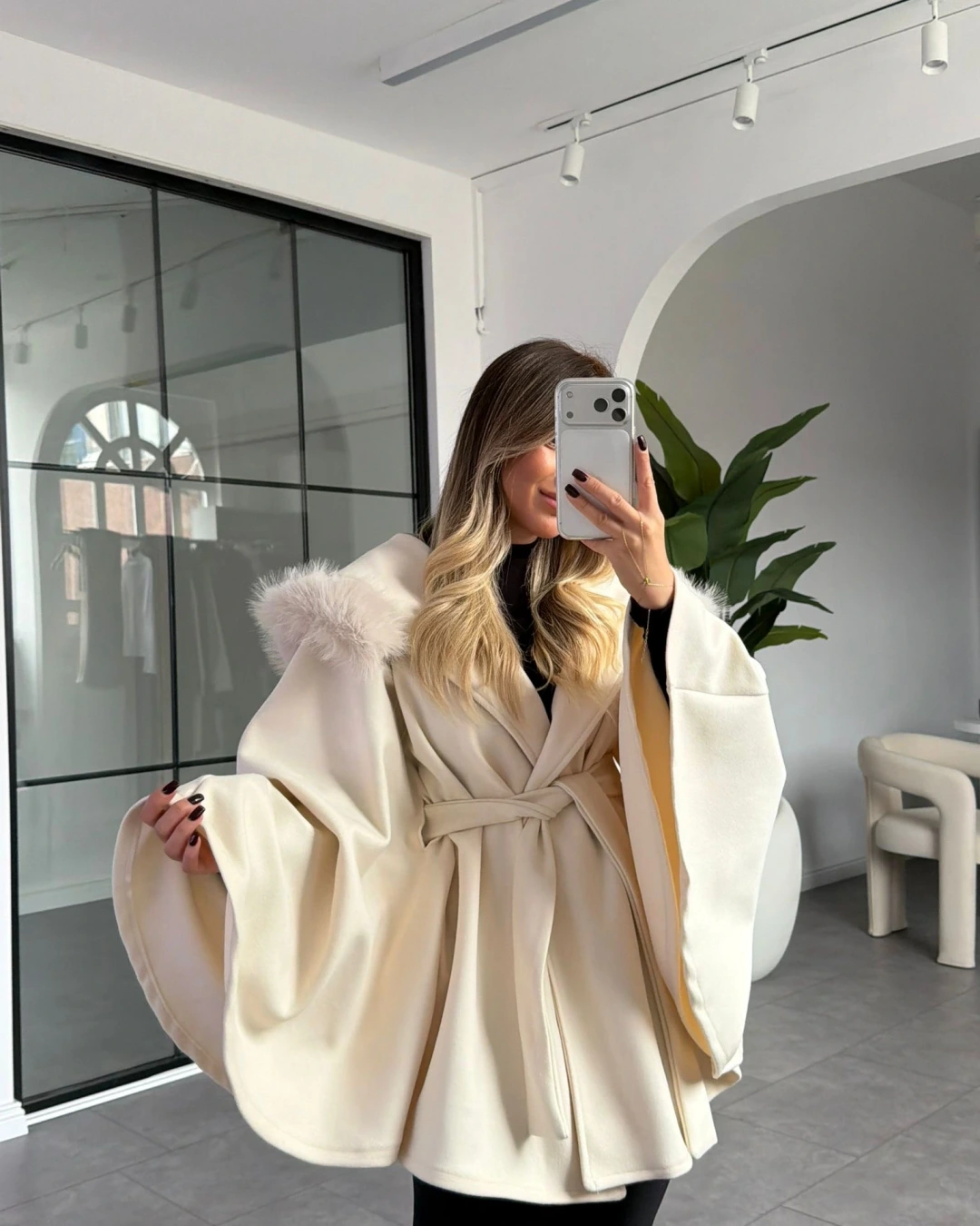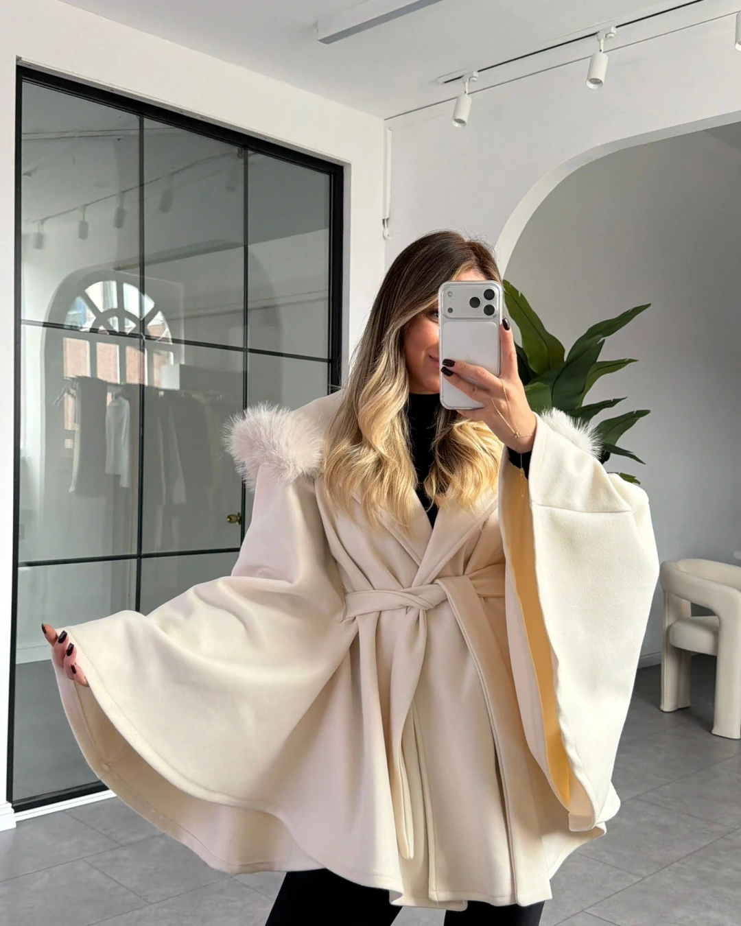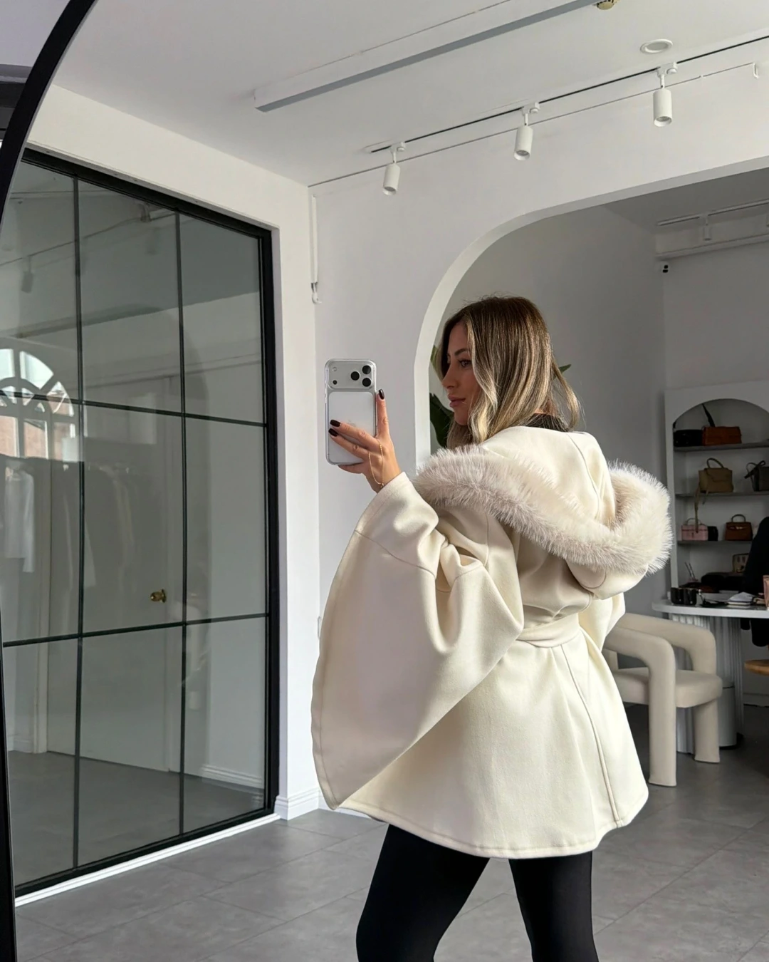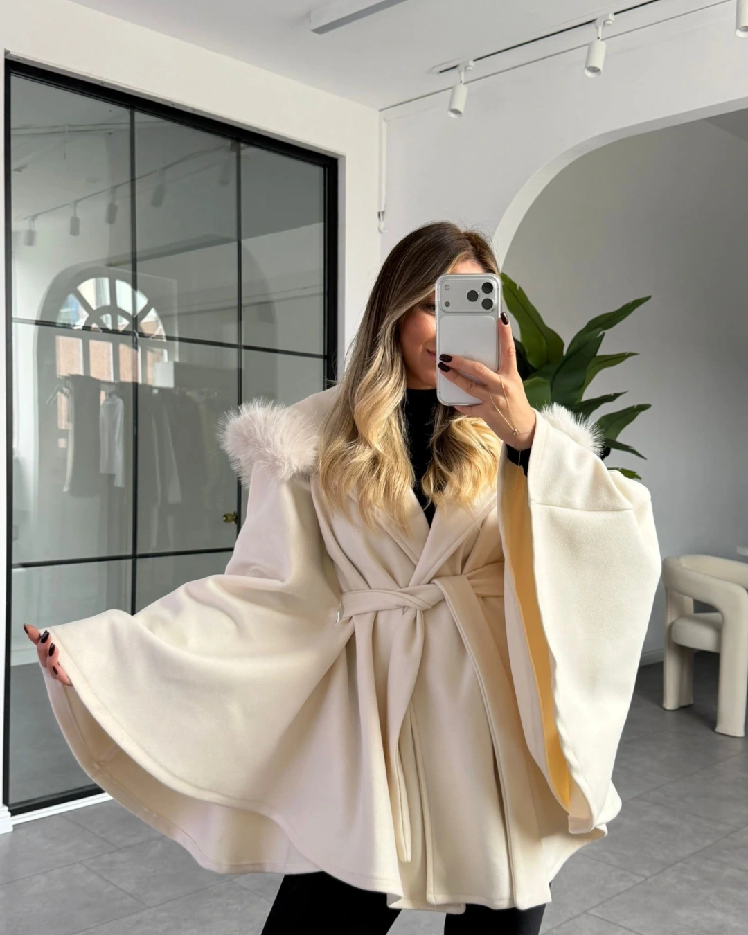 KREM KÜRK DETAY KAPÜŞONLU KAŞE PANÇO