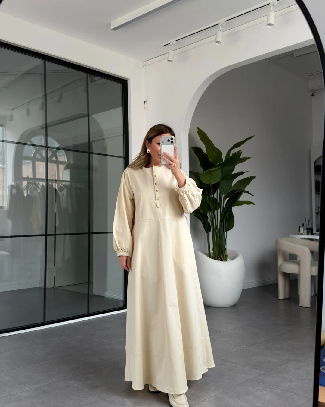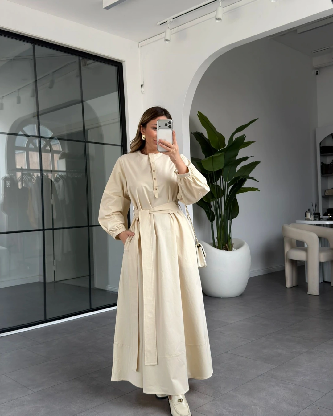 KREM KUŞAKLI UZUN ELBİSE 2349