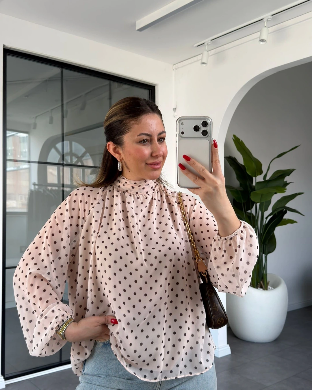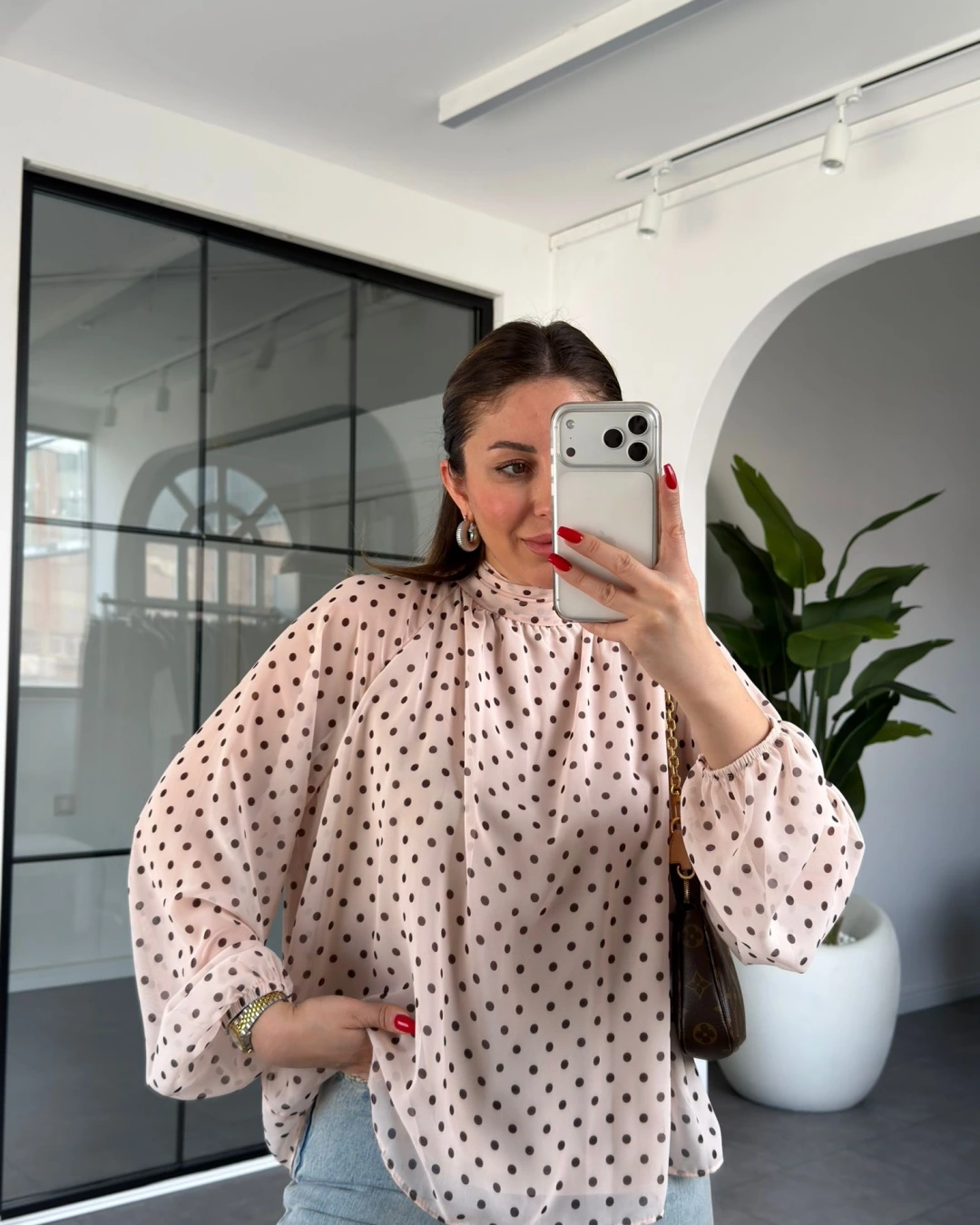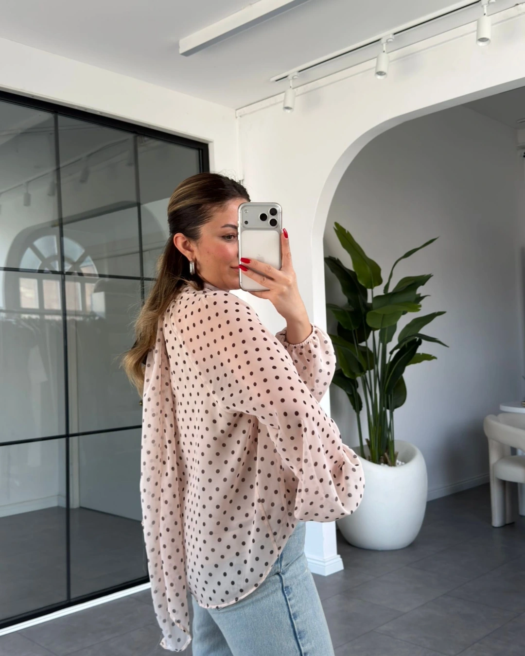 KREM PUANTİYELİ ŞAL DETAYLI ŞİFON BLUZ
