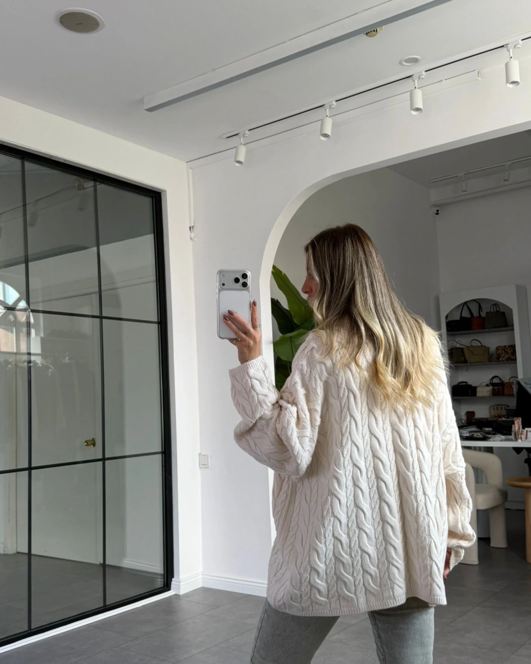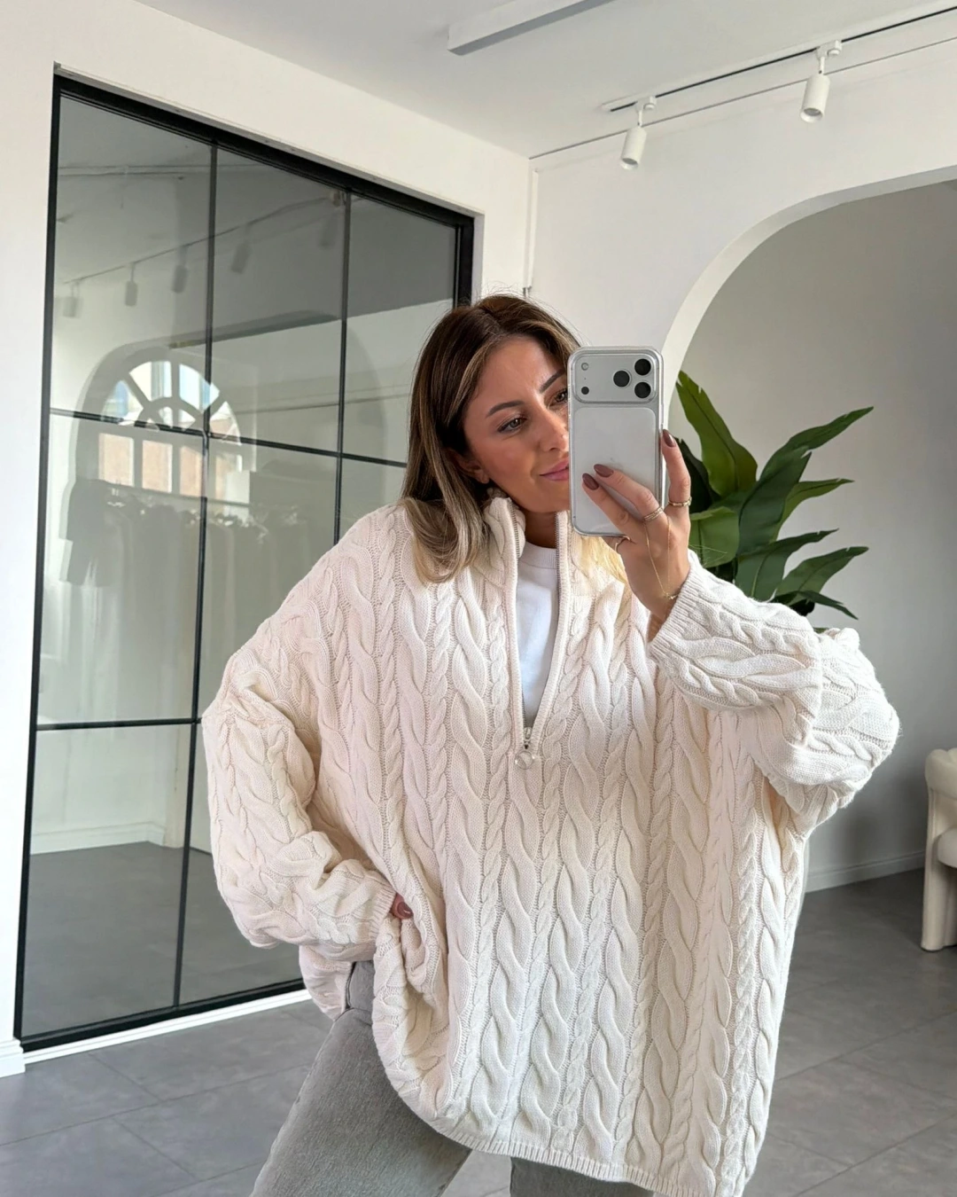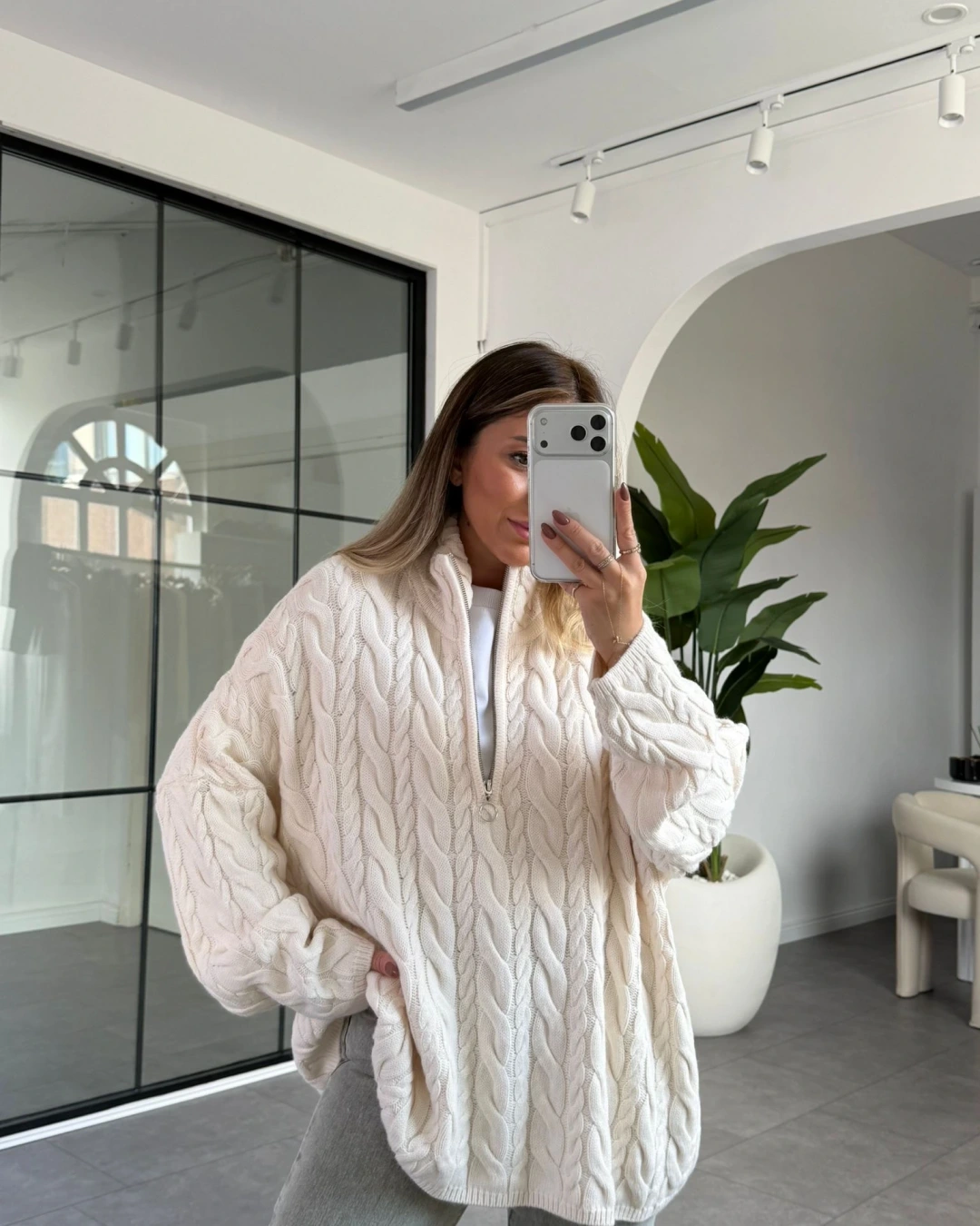 KREM SAÇ ÖRGÜ YARIM FERMUARLI KAZAK