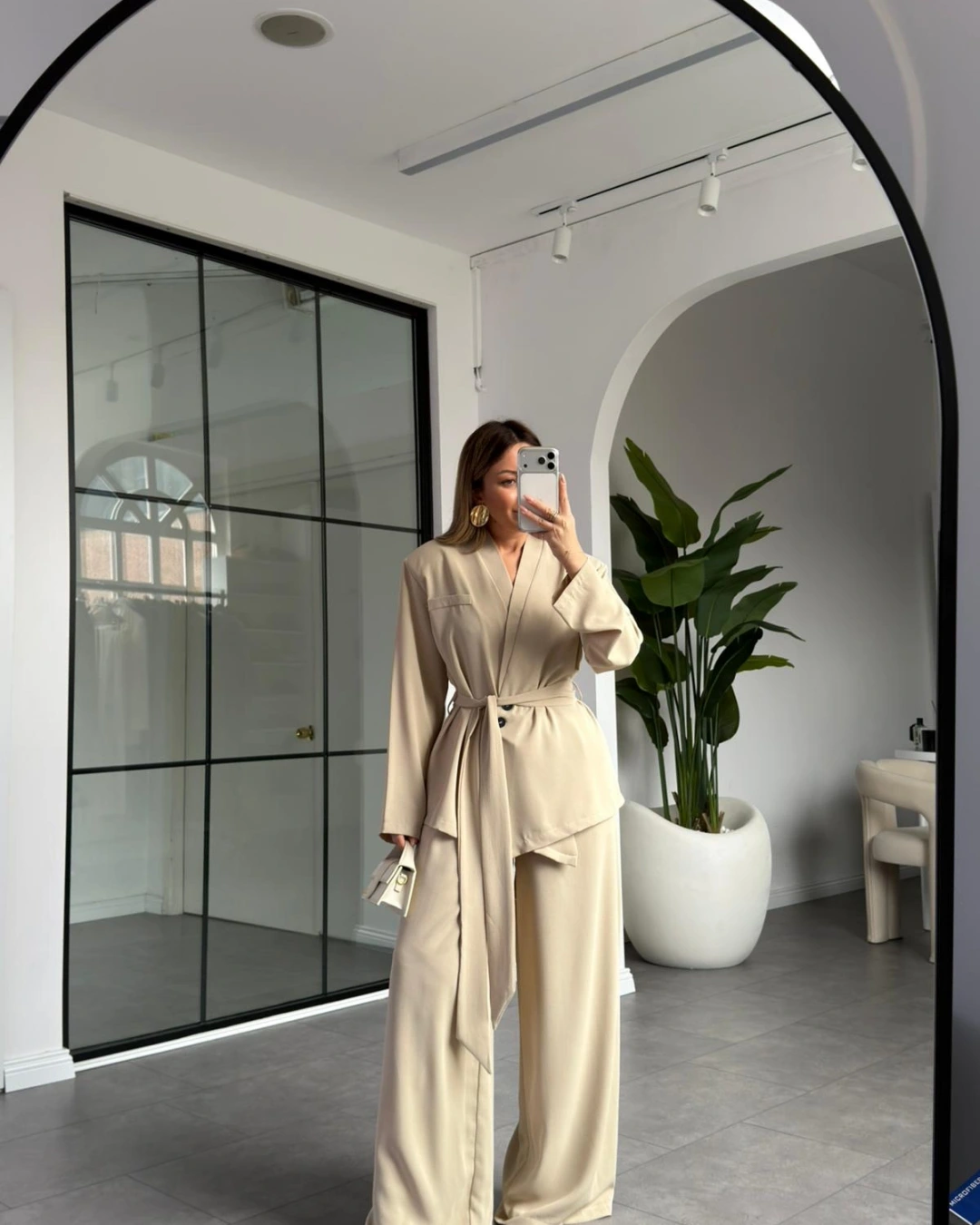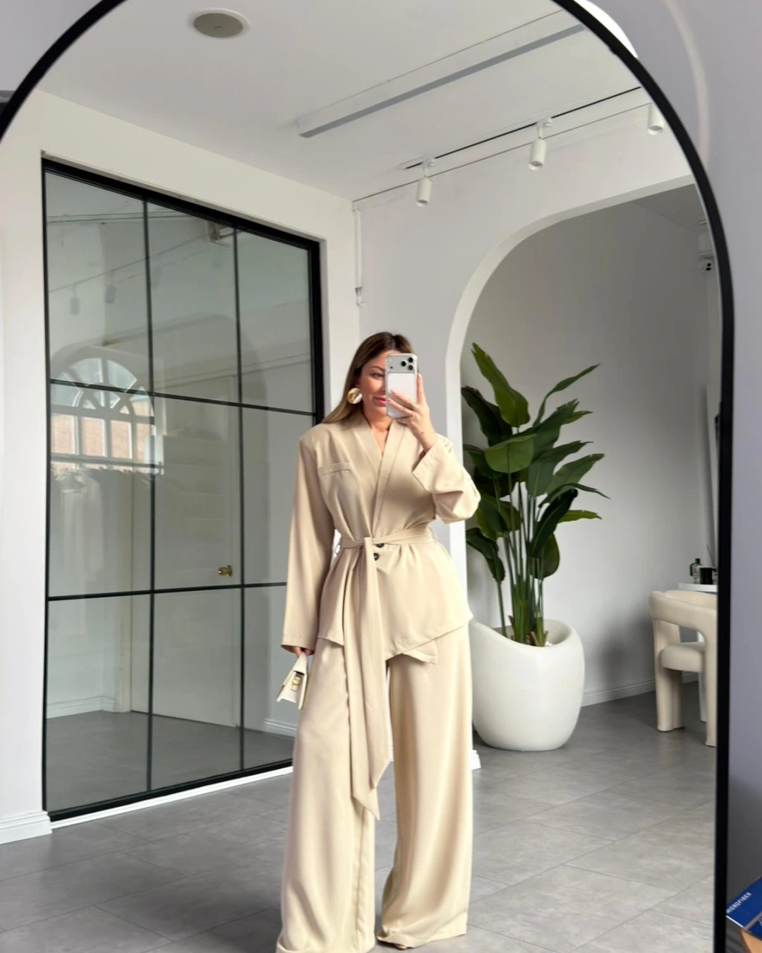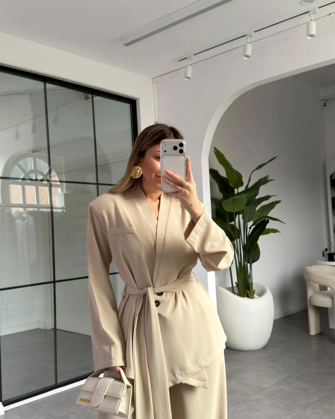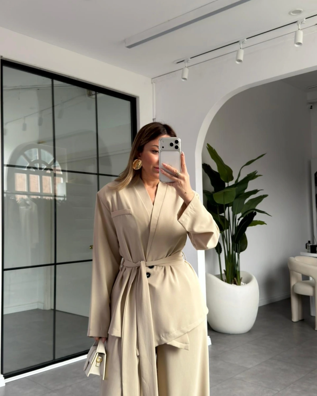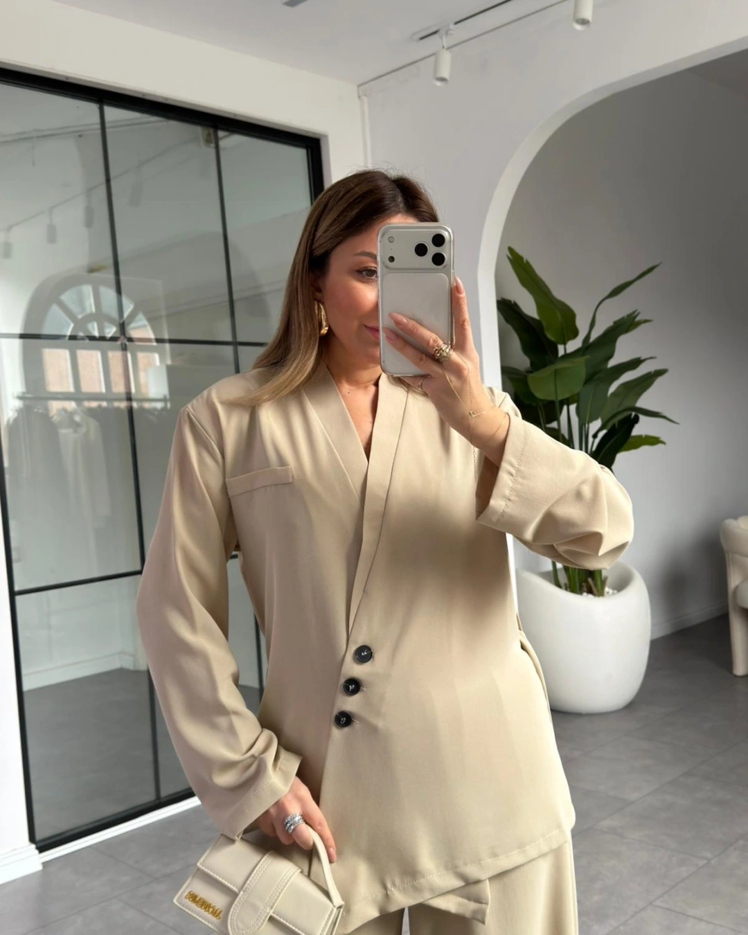 KREM ÜÇ DÜĞMELİ ASİMETRİK KUŞAKLI CEKET TAKIM
