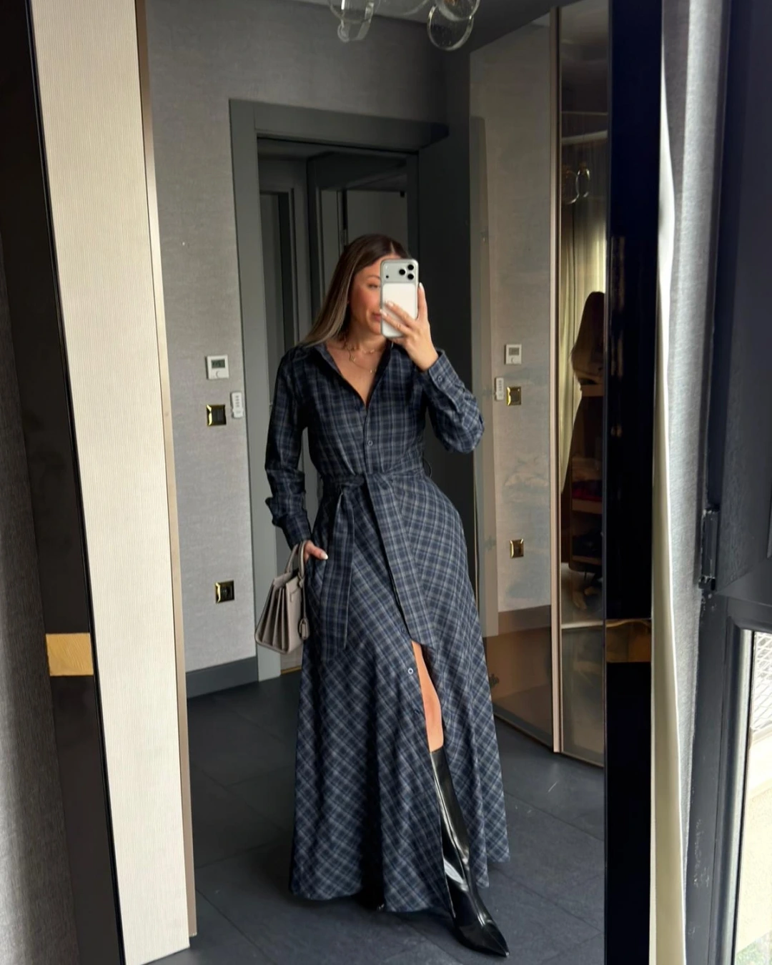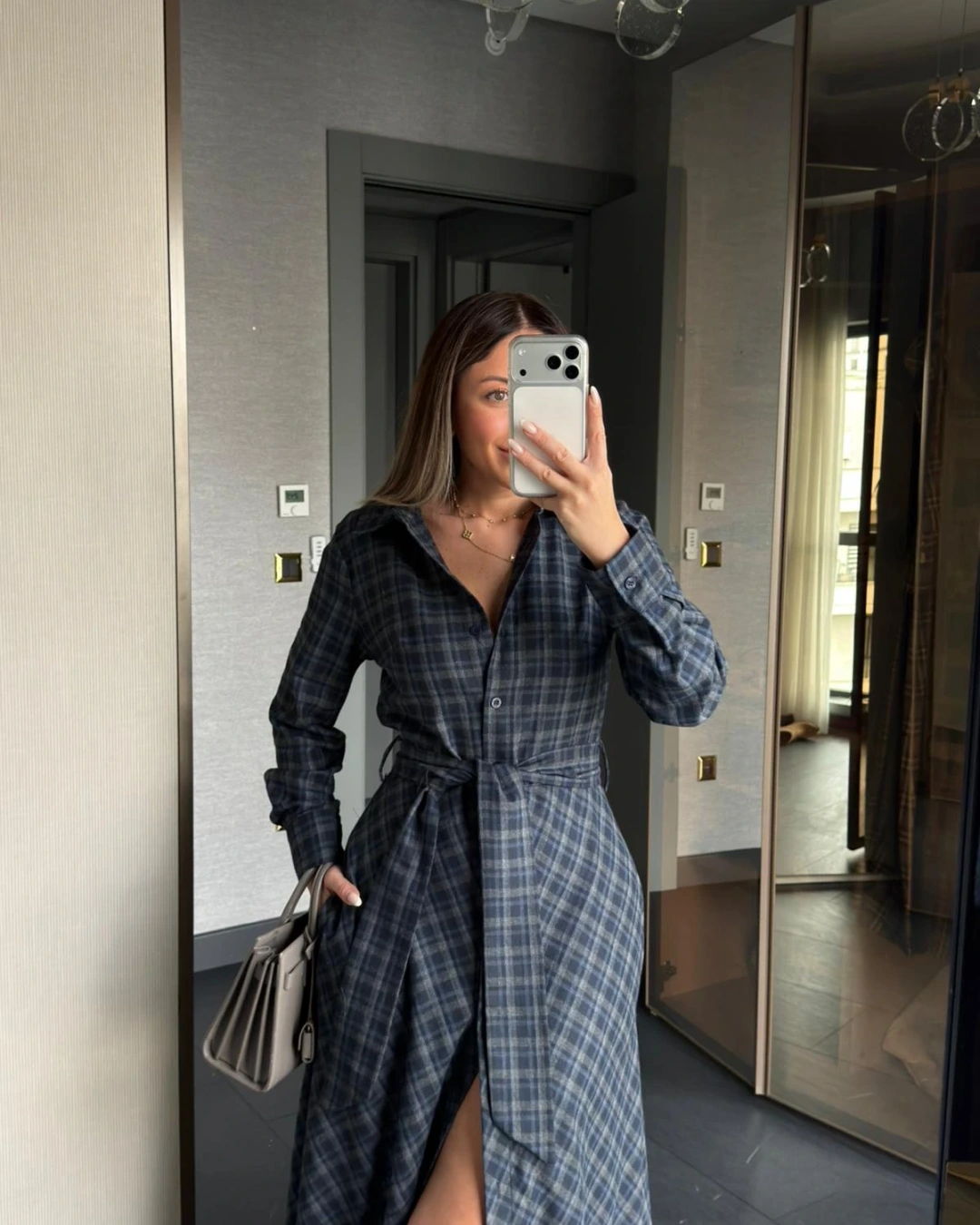 LACİVERT ANTRASİT KEMER DETAY EKOSE ELBİSE