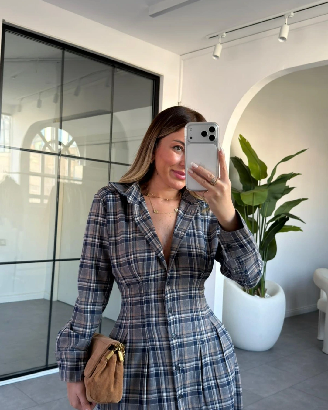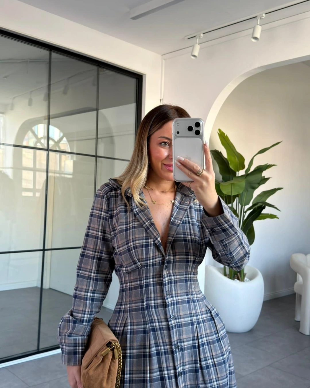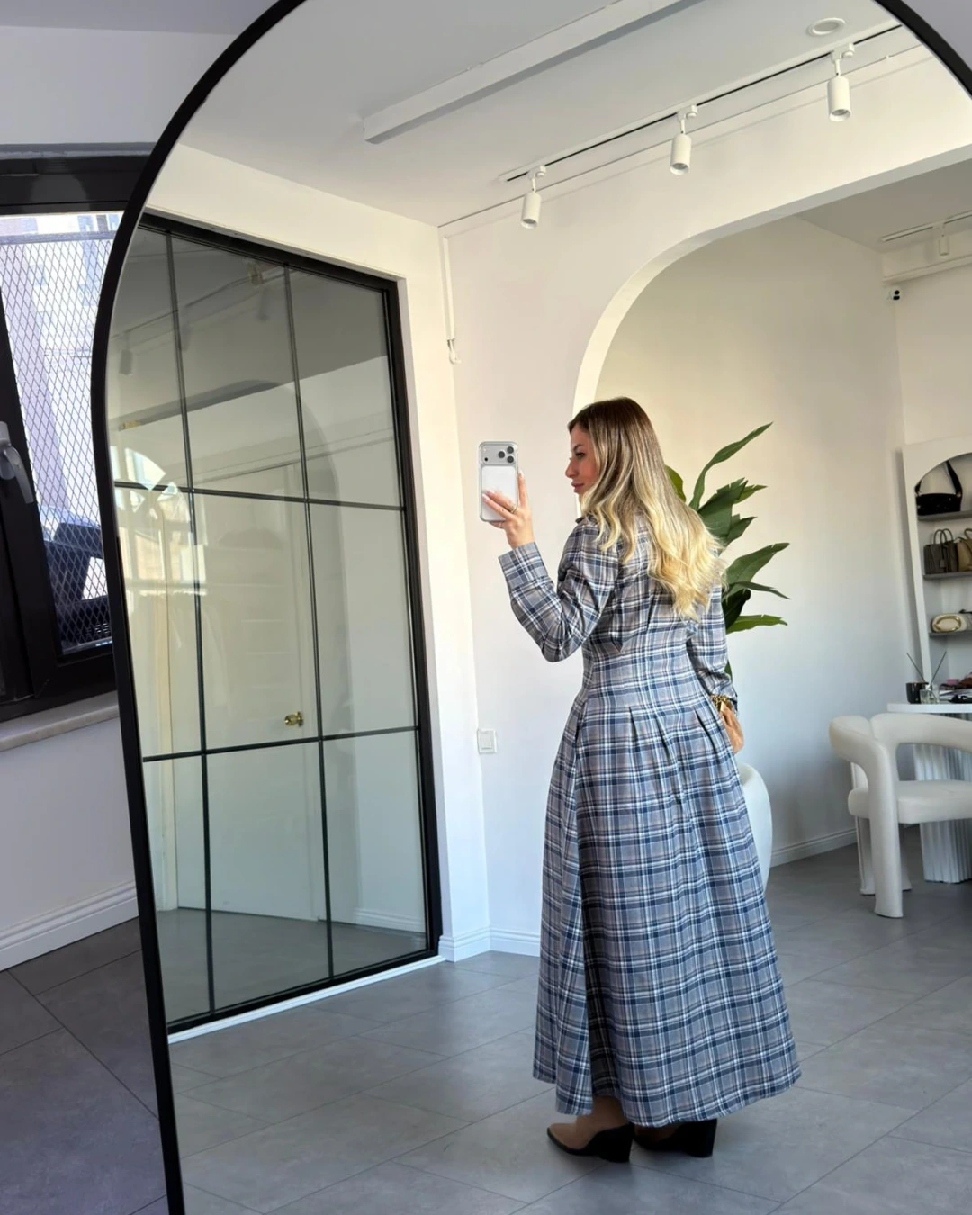 LACİVERT BELDEN OTURTMALI EKOSE ELBİSE