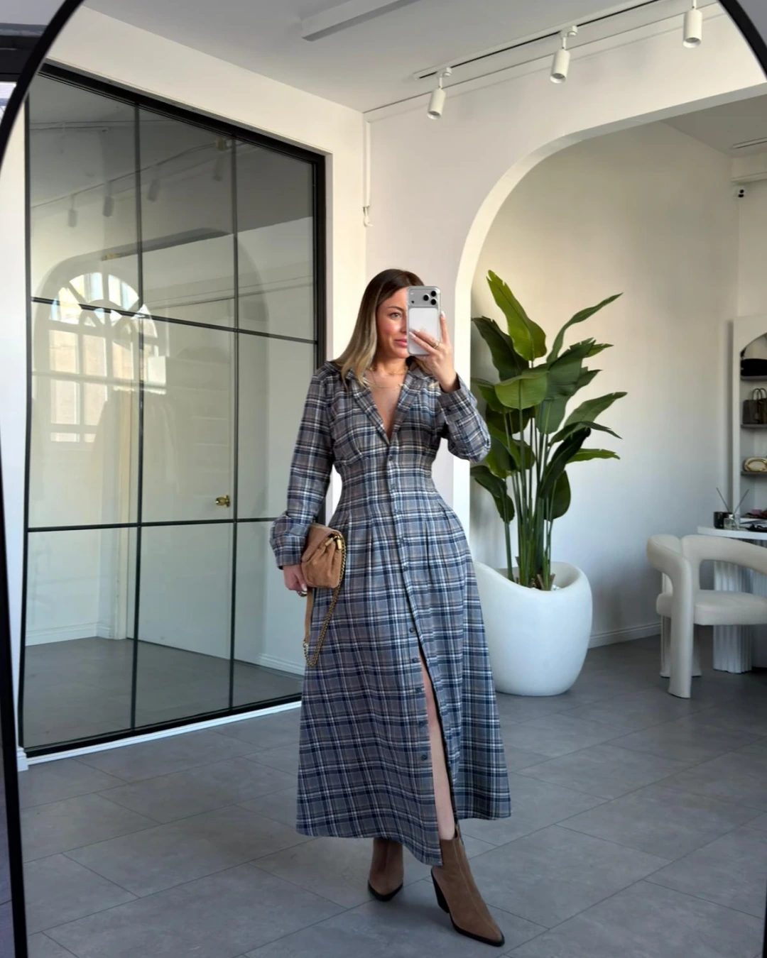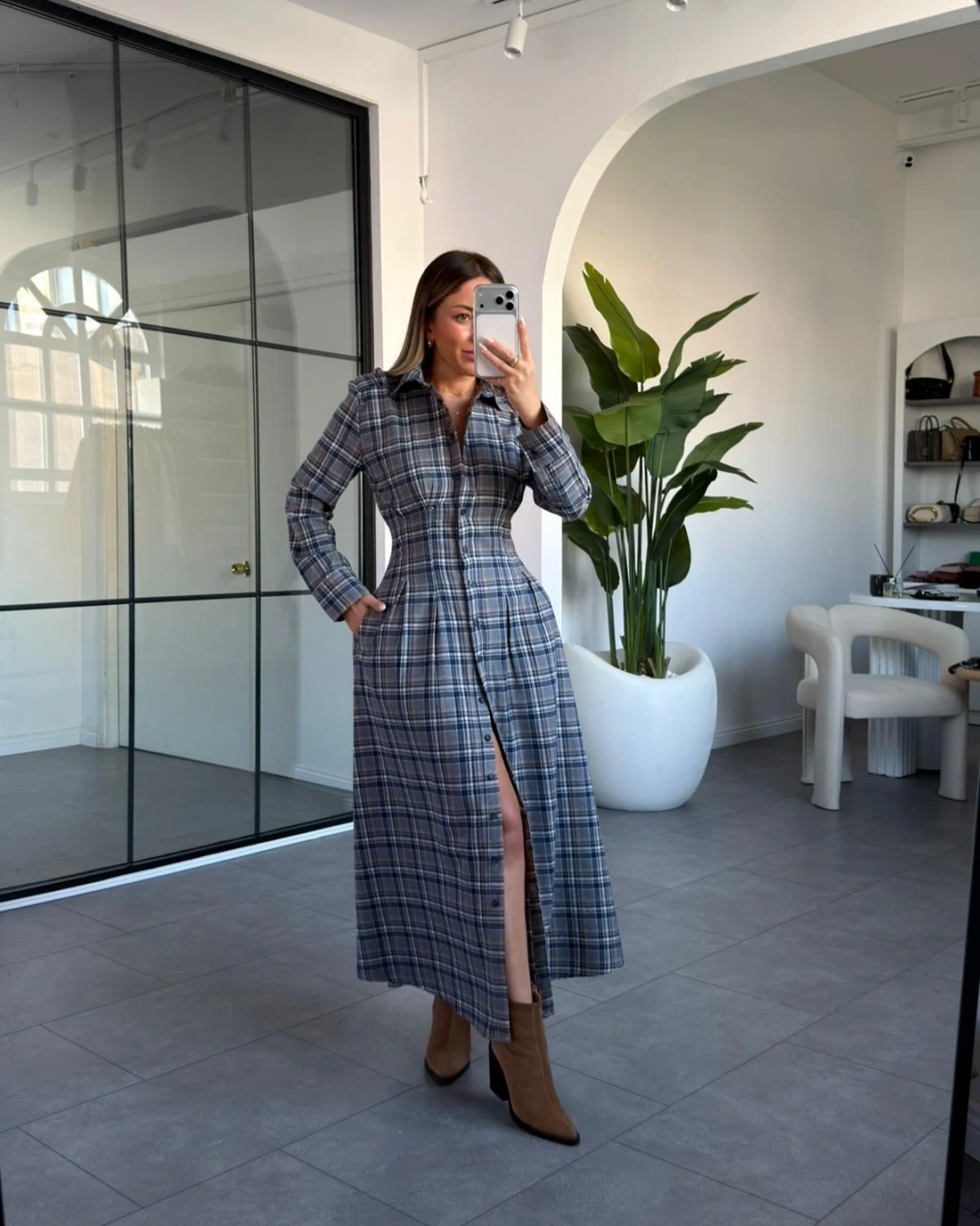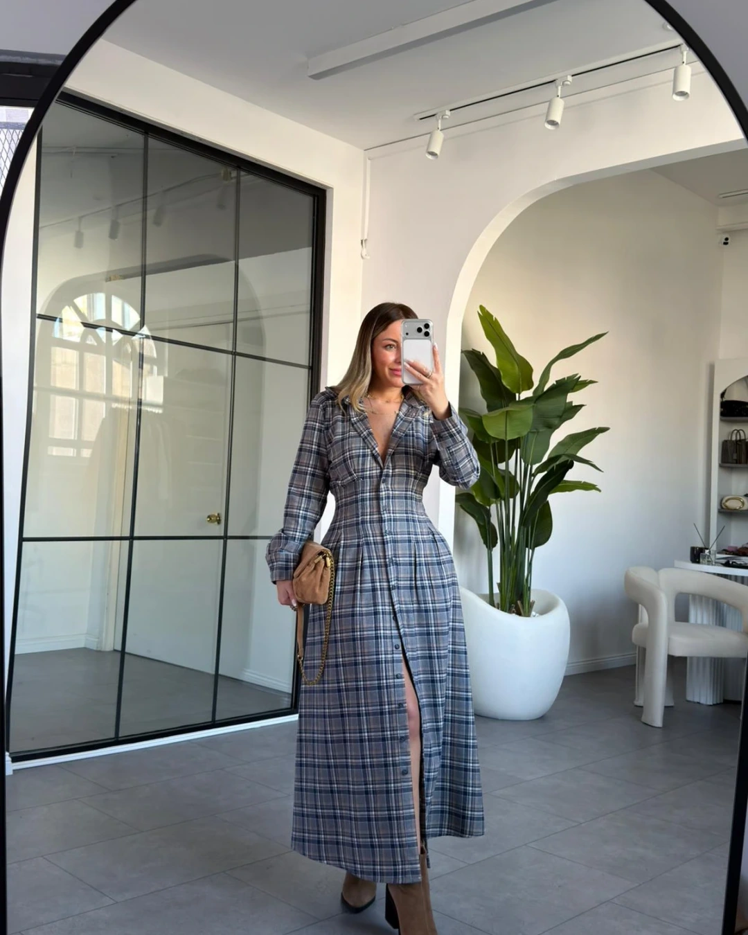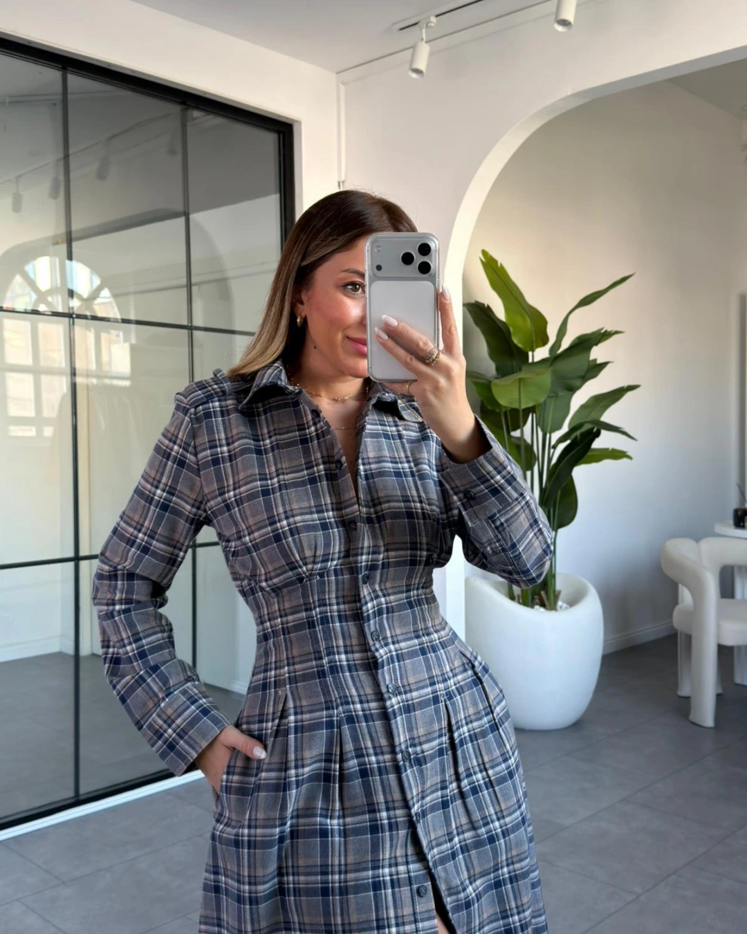 LACİVERT BELDEN OTURTMALI EKOSE ELBİSE