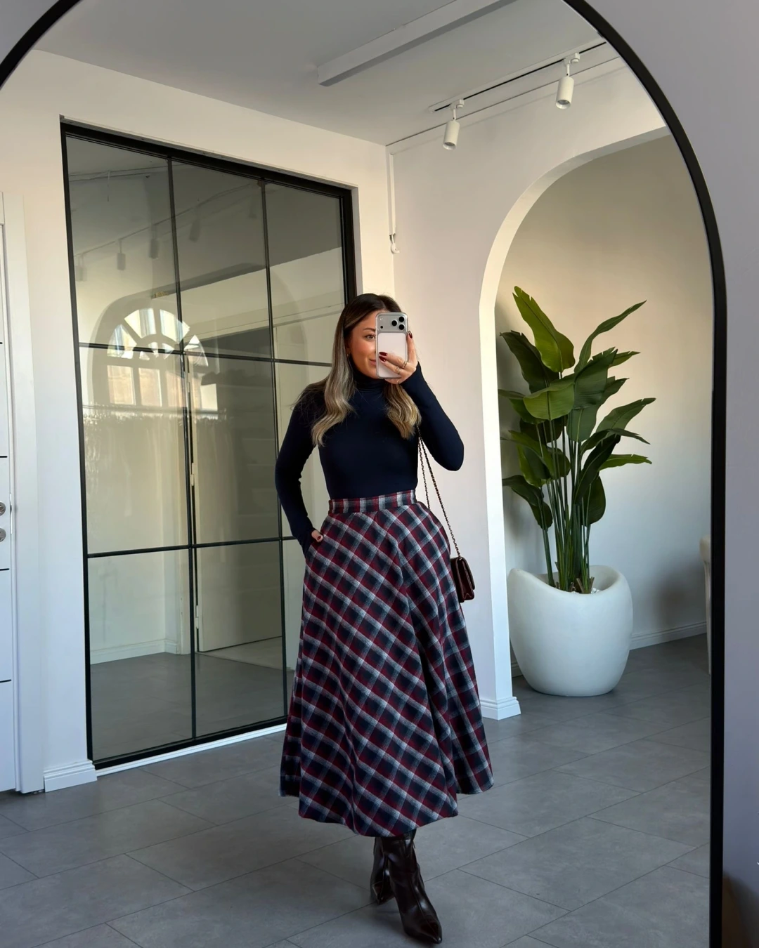 LACİVERT KIRMIZI EKOSE DESEN CEP DETAY ETEK