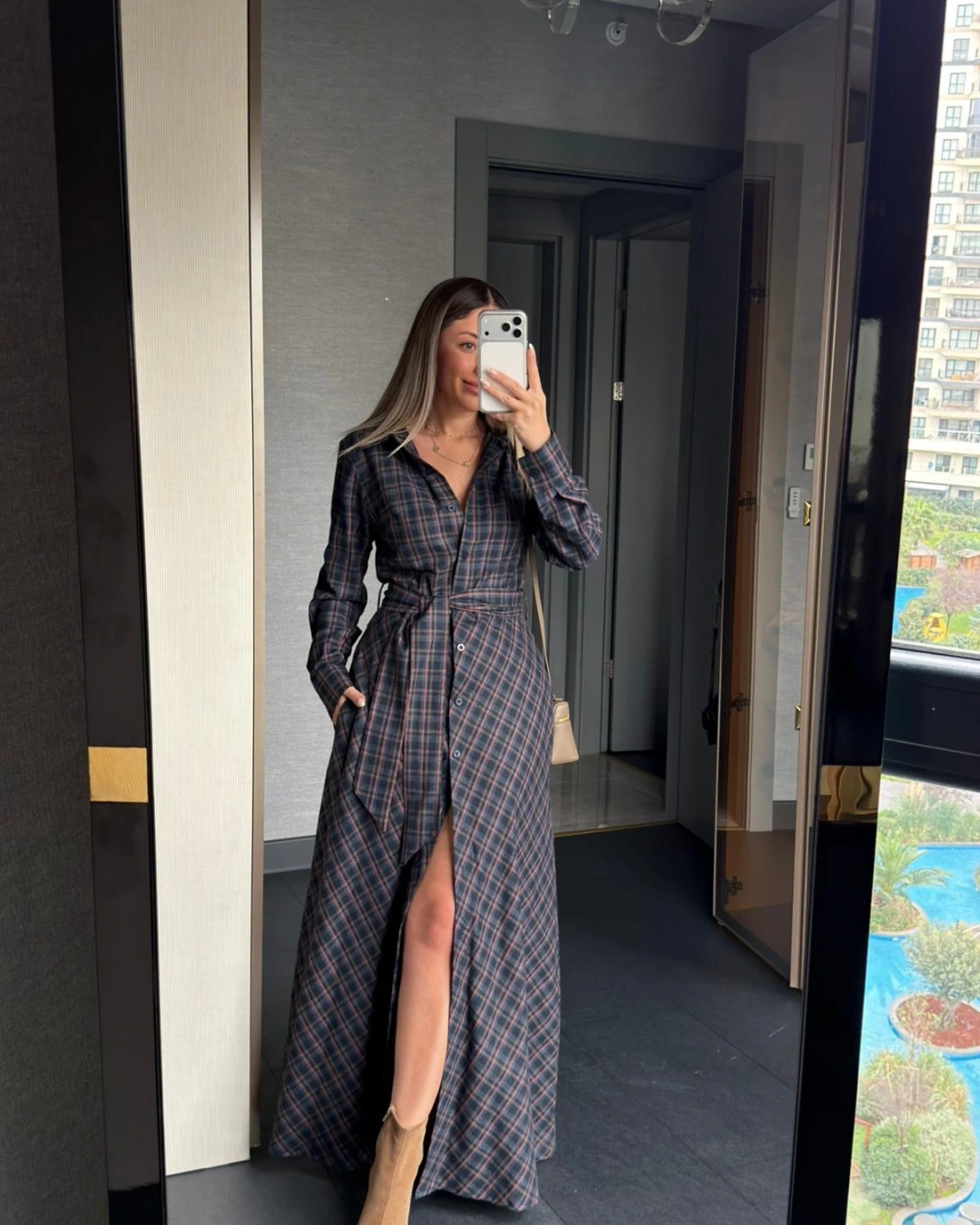 LACİVERT KIRMIZI KEMER DETAY EKOSE ELBİSE
