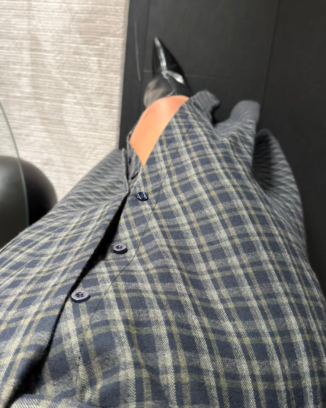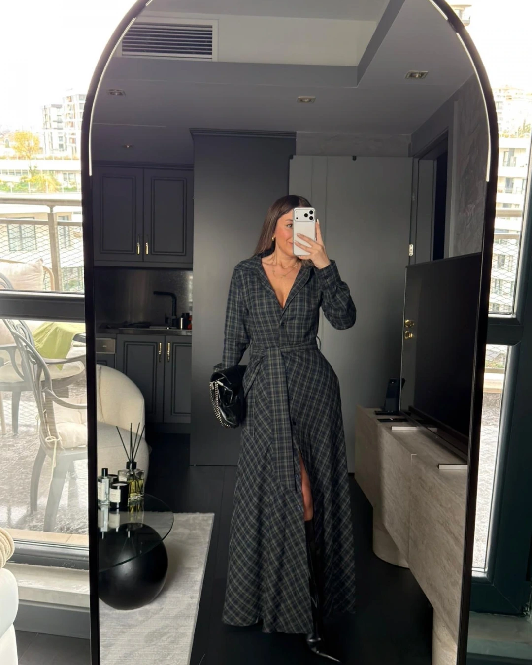 LACİVERT YEŞİL KEMER DETAY EKOSE ELBİSE